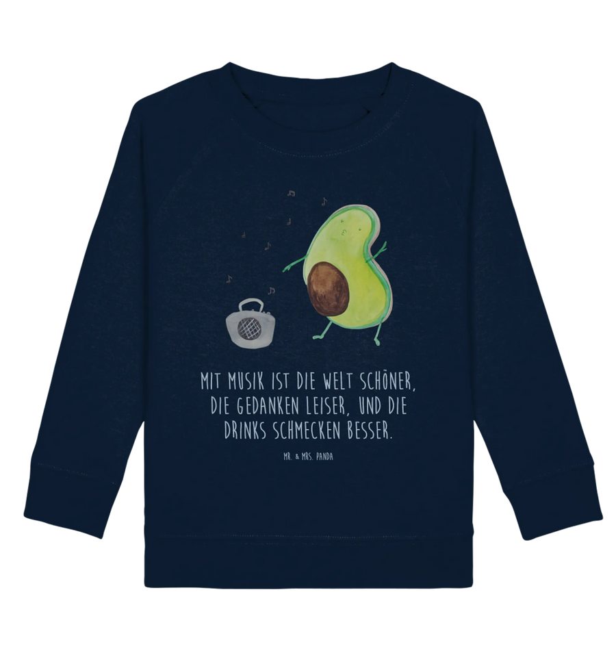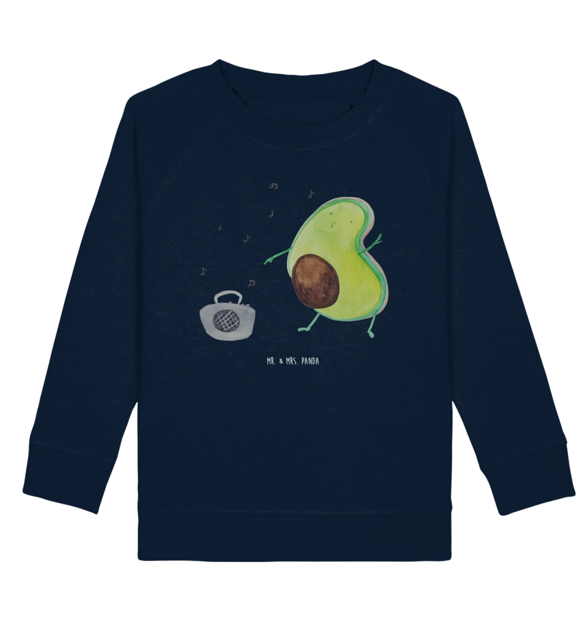 Der perfekte Kinder Pullover mit dem bezaubernden Motiv 'Avocado tanzt' aus der Avocado Kollektion von Mr. & Mrs. Panda ist ein unverzichtbares Mode-Highlight für jeden kleinen Avocado-Fan! Dieses hochwertige Sweatshirt besteht aus 100% Öko-Baumwolle, die nicht nur weich und bequem ist, sondern auch höchsten Umweltstandards entspricht. Es hat einen tollen, maritimen Farbton in French Navy und präsentiert die süße Avocado, die fröhlich vor einem Ghettoblaster zur Musik tanzt.