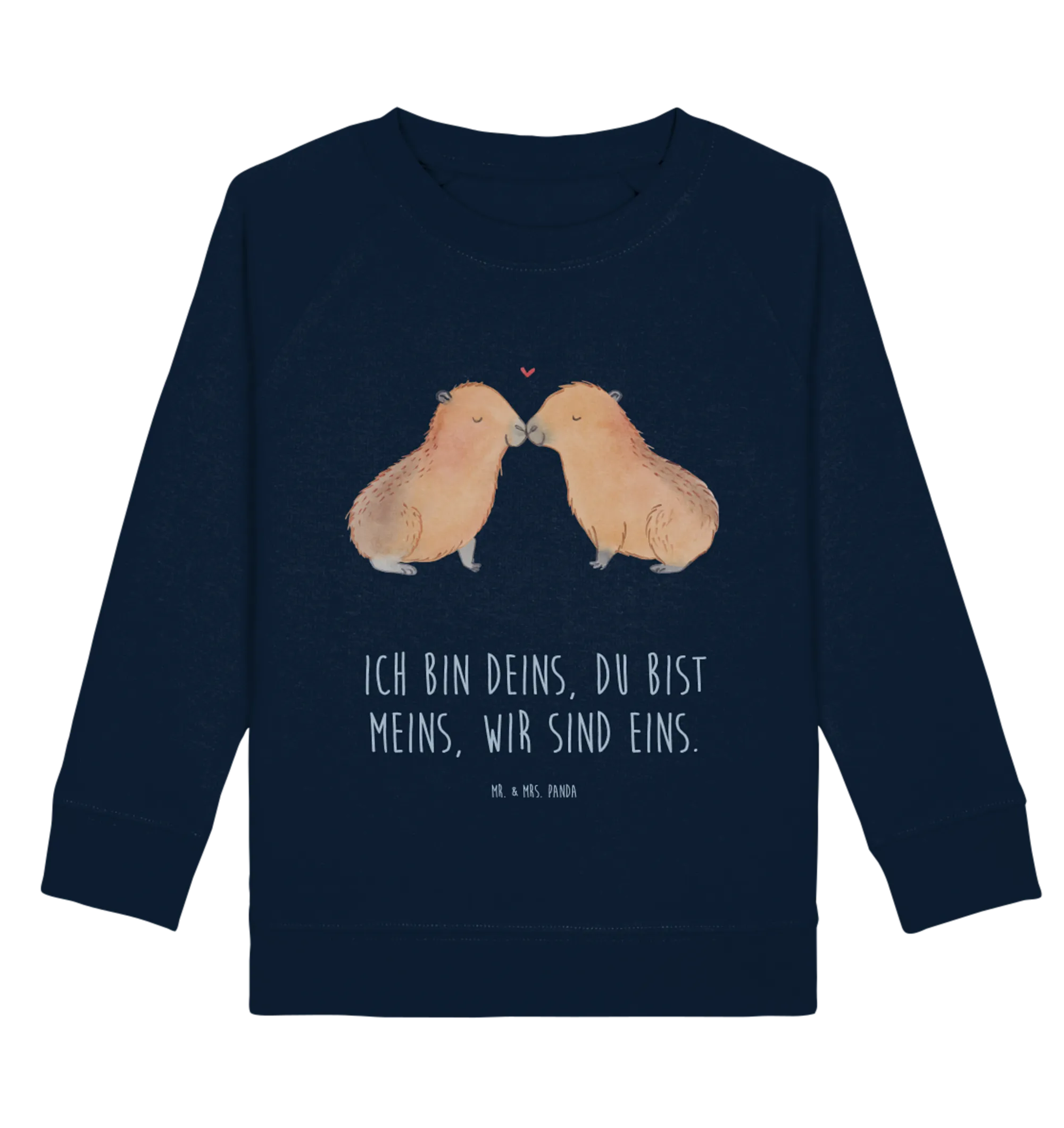 Handgezeichnet von Mrs. Panda, zeigt dieses süße Sweatshirt ein verliebtes Paar Kuschel-Capybaras. Die beiden träumen glücklich miteinander und symbolisieren die unendliche Liebe der Tiere. Dieser Pulli aus 100% Öko-Baumwolle ist nicht nur weich und angenehm zu tragen, sondern überzeugt auch durch seine ansprechenden Farben in French Navy.