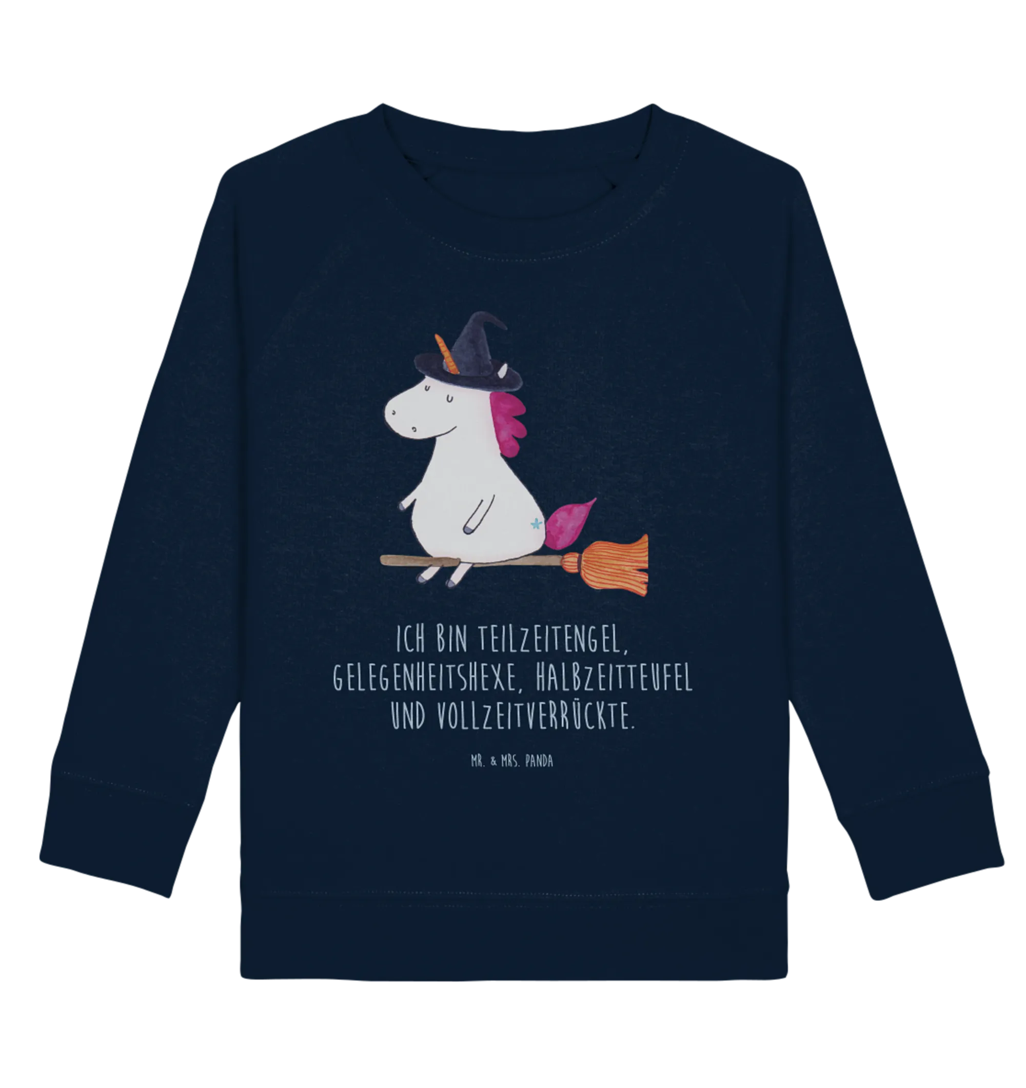Organic Kinder Pullover Einhorn Hexe aus der Einhorn - Kollektion von Mr. & Mrs. Panda: Ein freches, liebevolles Lieblingsstück für kleine Einhorn-Fans. Das Motiv zeigt ein süßes Einhorn mit Hexenhut auf einem Besen, kombiniert mit dem charmanten Spruch „Ich bin Teilzeitengel, Gelegenheitshexe, Halbzeitteufel und Vollzeitverrückte.“ – perfekt für Kinder, die fantasievoll, wild und herzlich sind.