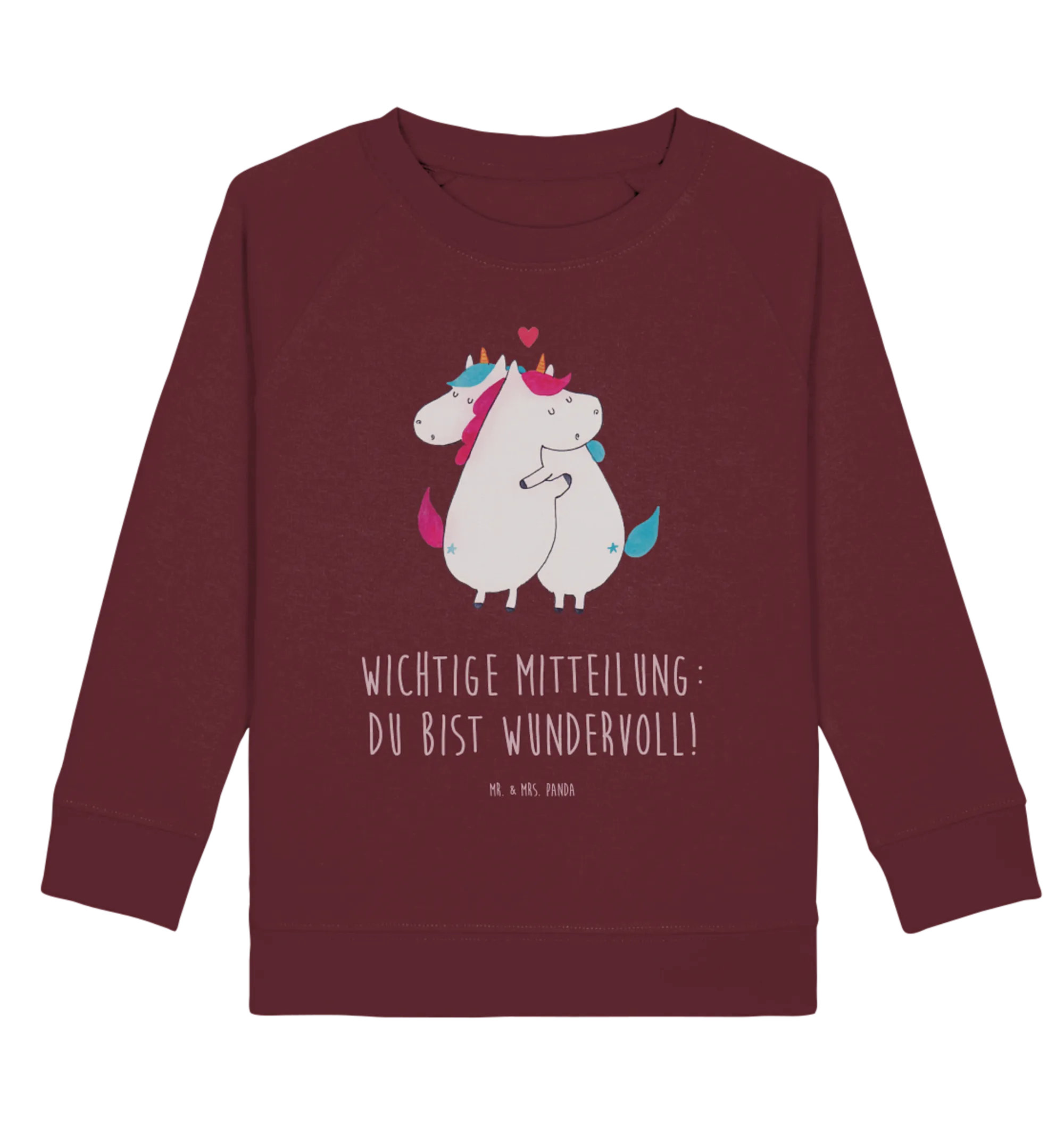 Mit seiner burgunderfarbenen Optik und dem handgezeichneten Design von Mrs. Panda bringt dieser Pullover Farbe in den Alltag. Außerdem ist der Organic Kinder Pullover besonders ideal für kleine Einhorn-Fans, die die magische Welt der Einhörner lieben.
