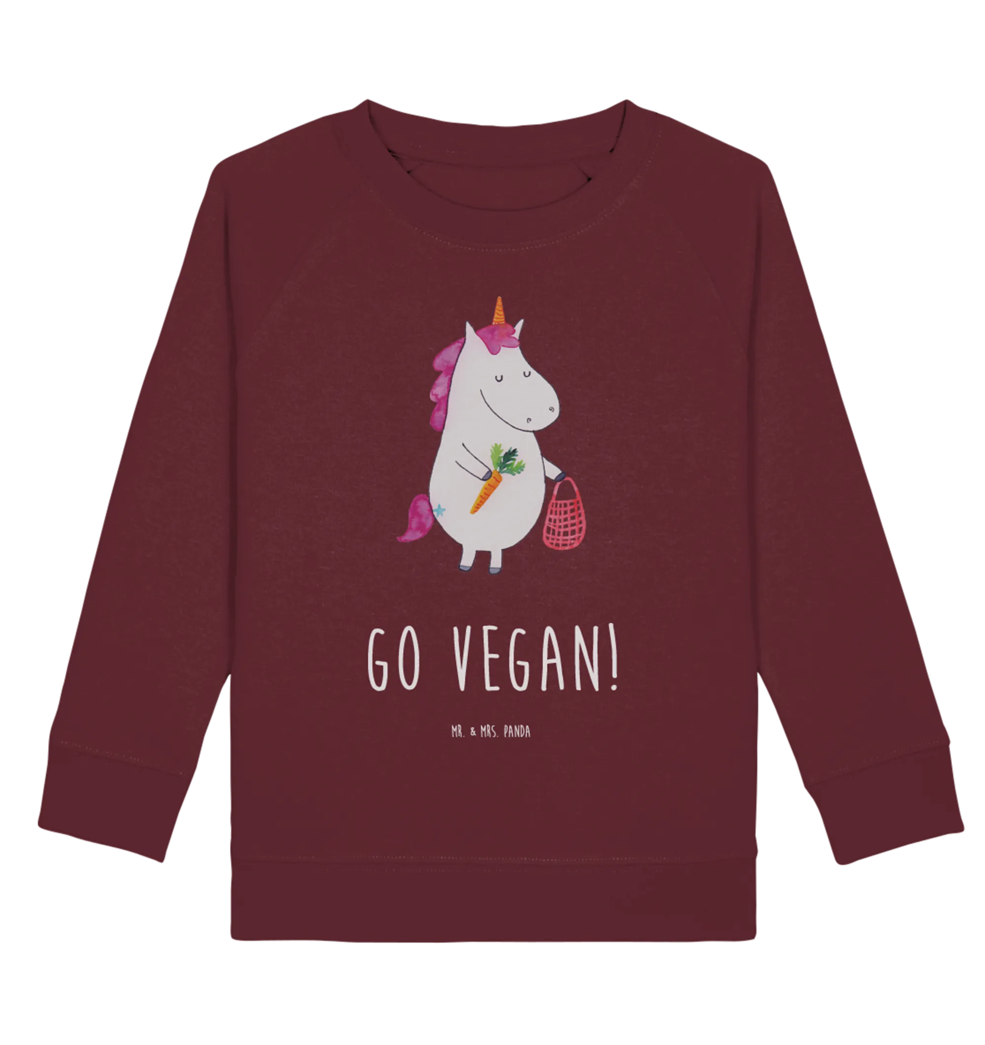 Der burgunderfarbene Hintergrund verleiht dem Pullover eine elegante Ausstrahlung, während das liebevoll gestaltete Einhorn Motiv mit einer Einkaufstasche voll veganer Leckereien ein zauberhaftes Bild abgibt.