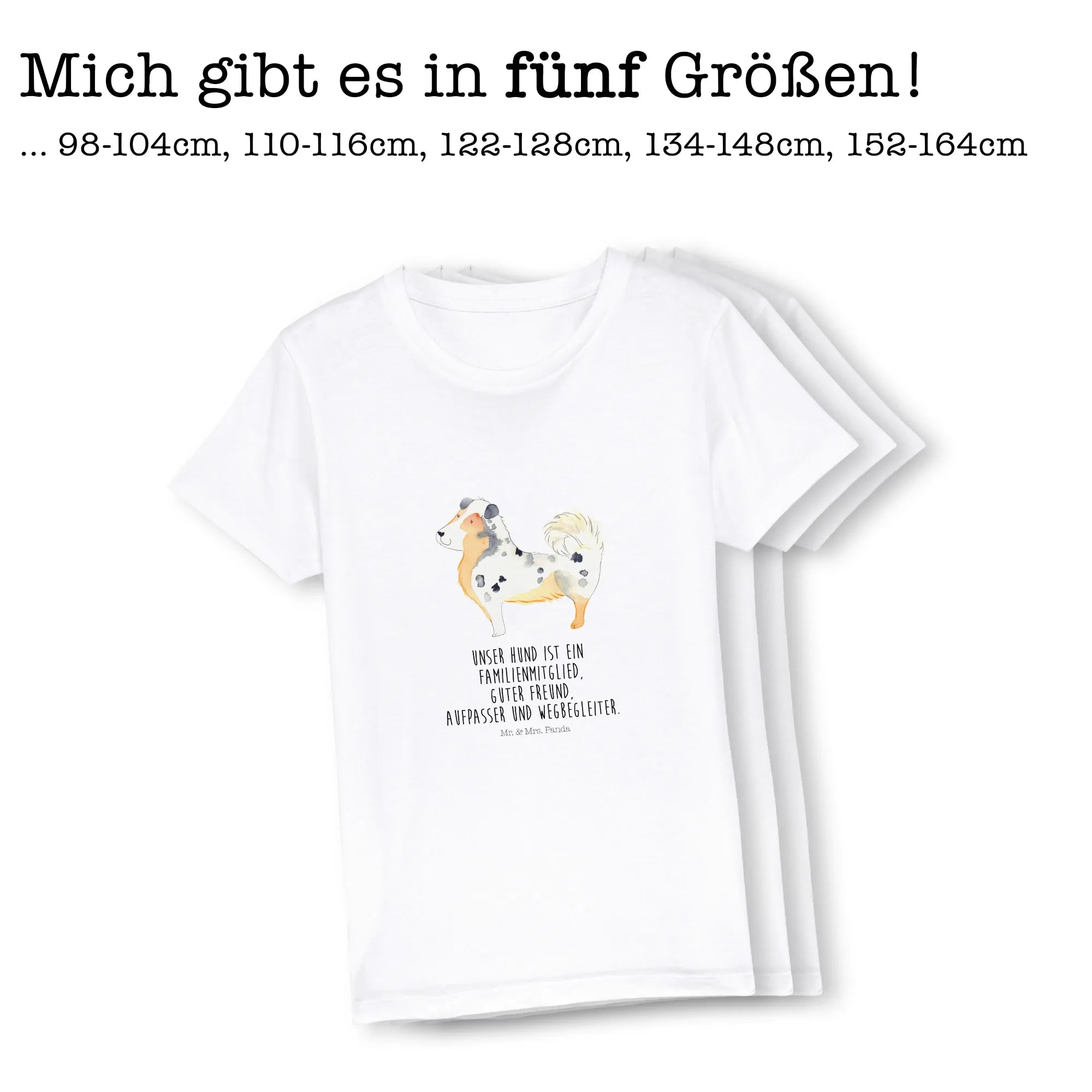 Egal, ob für Deinen eigenen kleinen Abenteurer oder als tolles Geschenk für einen Geburtstag, ein Fest oder einfach nur so – dieses T-Shirt bringt Hundeliebe direkt in den Kleiderschrank. Jedes Shirt wurde mit viel Liebe gestaltet und zeigt einen charmanten Australian Shepherd, begleitet von dem Spruch: „Unser Hund ist ein Familienmitglied, guter Freund, Aufpasser und Wegbegleiter.“ Damit zaubert es nicht nur ein Lächeln auf die Gesichter der Kinder, sondern gibt auch die besondere Verbindung zwischen Mensch und Hund wieder.