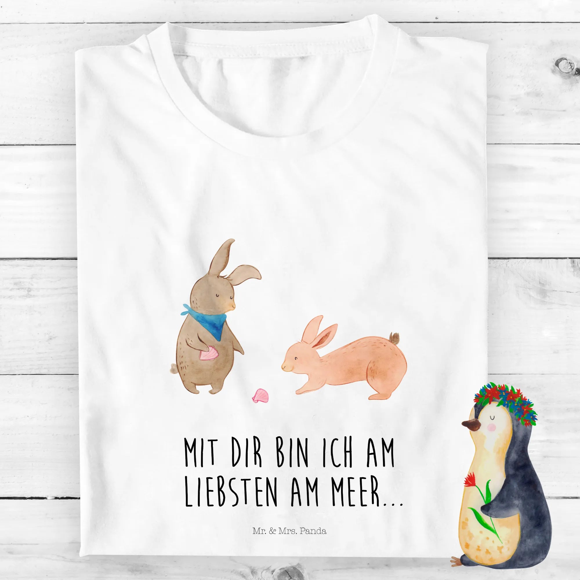 Das Design zeigt zwei liebevoll gestaltete Hasen, die an einem sonnigen Strand Muscheln entdecken. Der linke Hase, der auf seinen Hinterbeinen steht, schaut erfreut auf die rosafarbene Muschel, während der rechte Hase neugierig am Boden liegt. In sanften Farben gehalten, vermittelt das T-Shirt eine herzliche Stimmung und ist ein echter Blickfang.