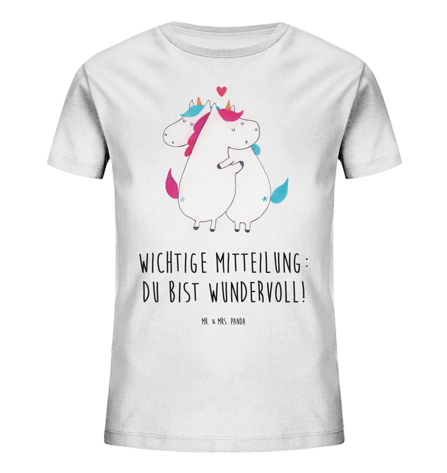 Das wunderschöne Organic Kinder T-Shirt mit dem liebevollen Einhorn-Motiv "Wichtige Mitteilung: du bist wundervoll!" von Mr. & Mrs. Panda ist das perfekte Geschenk für alle kleinen Einhorn-Fans! Ob für den Valentinstag, einen Geburtstag oder einfach nur so – dieses T-Shirt bringt die Herzen der Kinder zum Strahlen. Mit seinem zauberhaften Design, auf dem sich zwei niedliche Einhörner in einer innigen Umarmung zeigen, transportiert es eine wichtige Botschaft: Du bist wundervoll!