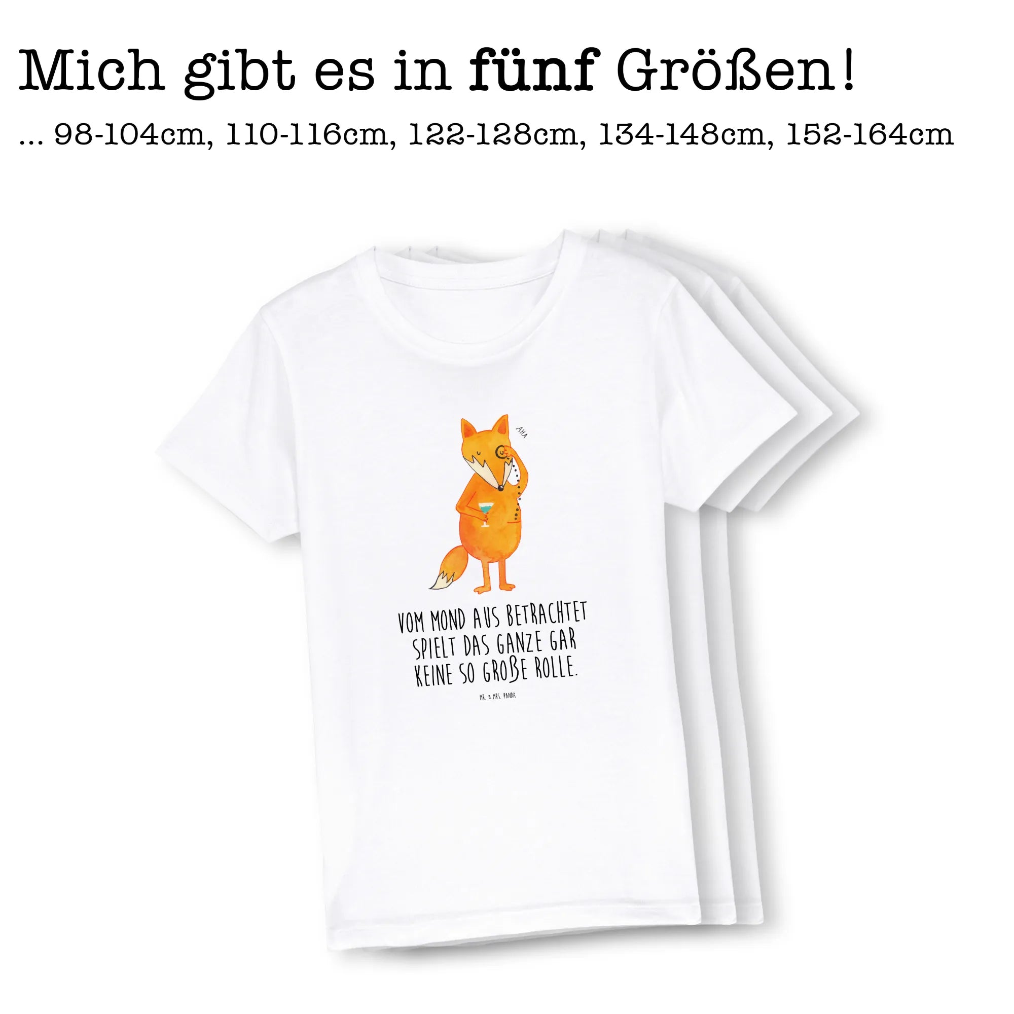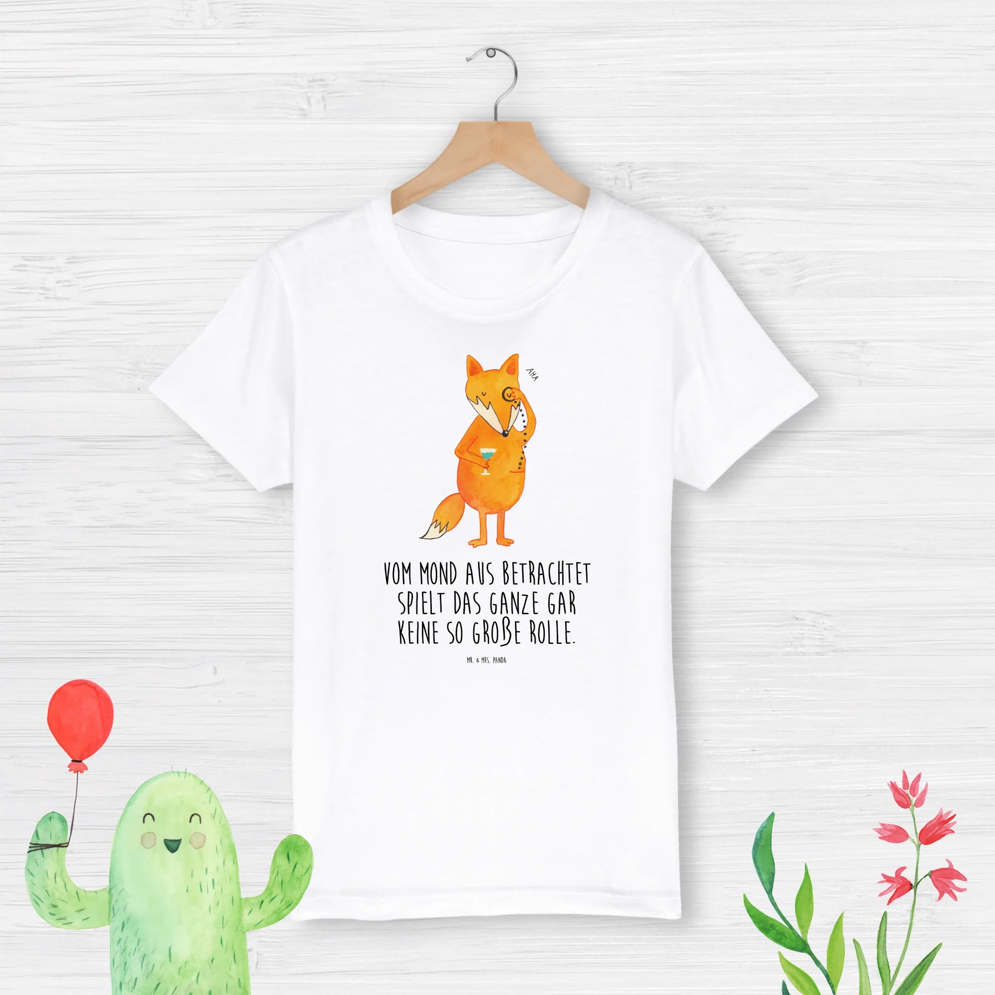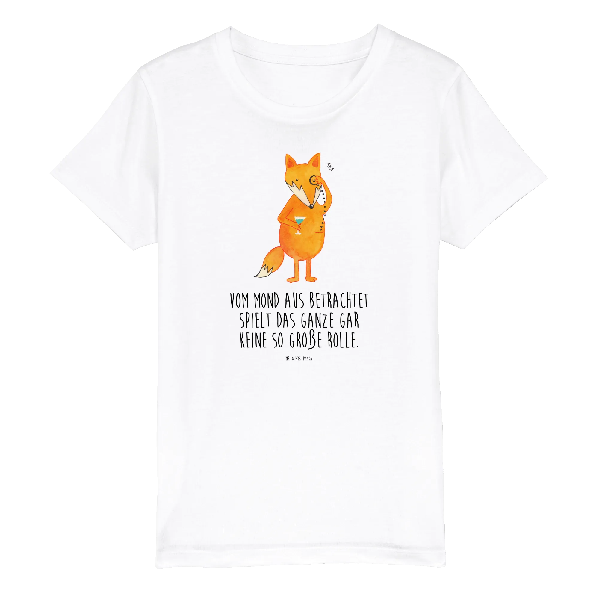Die liebevoll gestaltete Illustration zeigt einen stattlichen Fuchs mit einem Monokel, der gleichsam niedlich und klug aussieht – perfekt für kleine Entdecker! Dieses T-Shirt ist nicht nur ein modisches Highlight, sondern enthält auch einen beliebten Spruch: "Vom Mond aus betrachtet spielt das Ganze gar keine so große Rolle." Eine Botschaft, die Kinder zum Lächeln bringt und sie daran erinnert, das Leben locker zu nehmen.