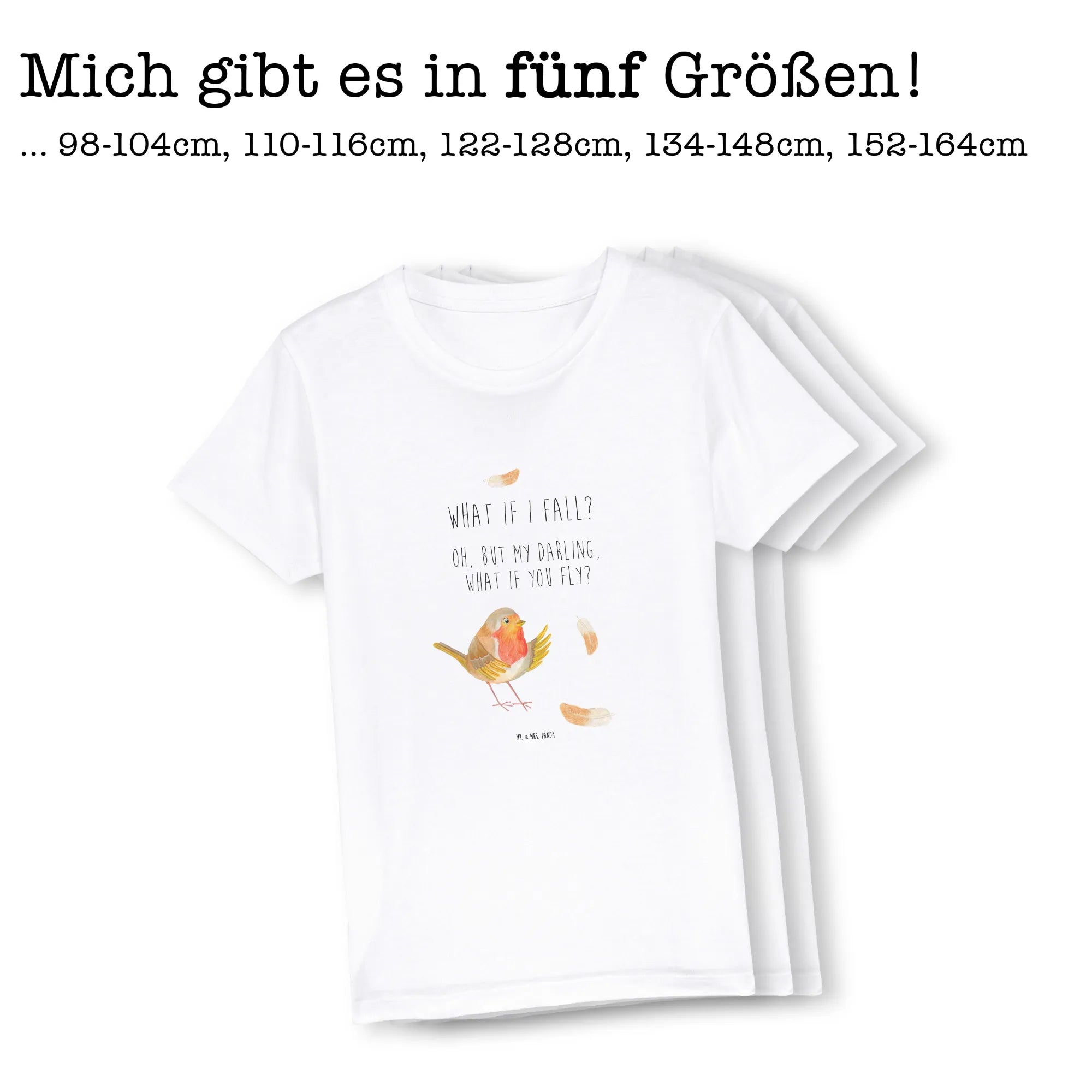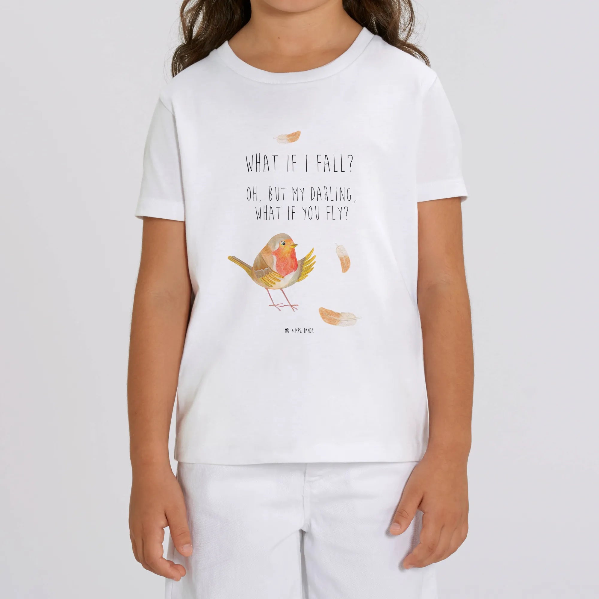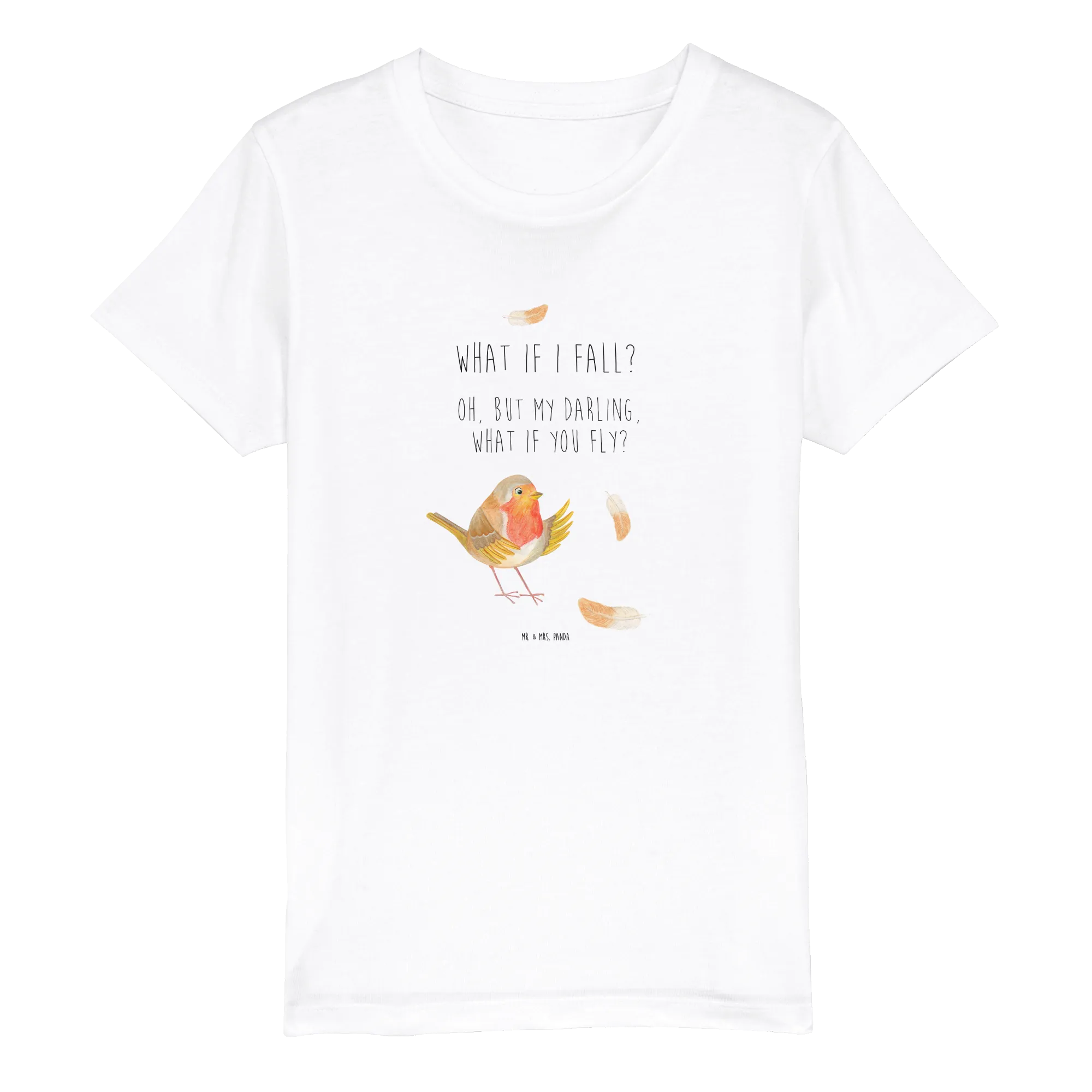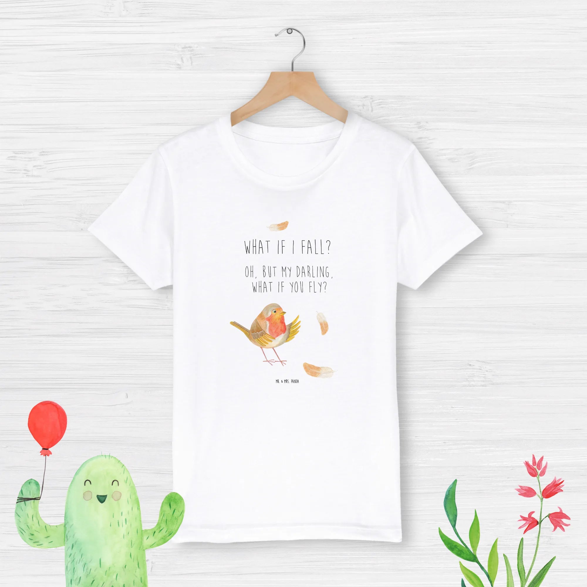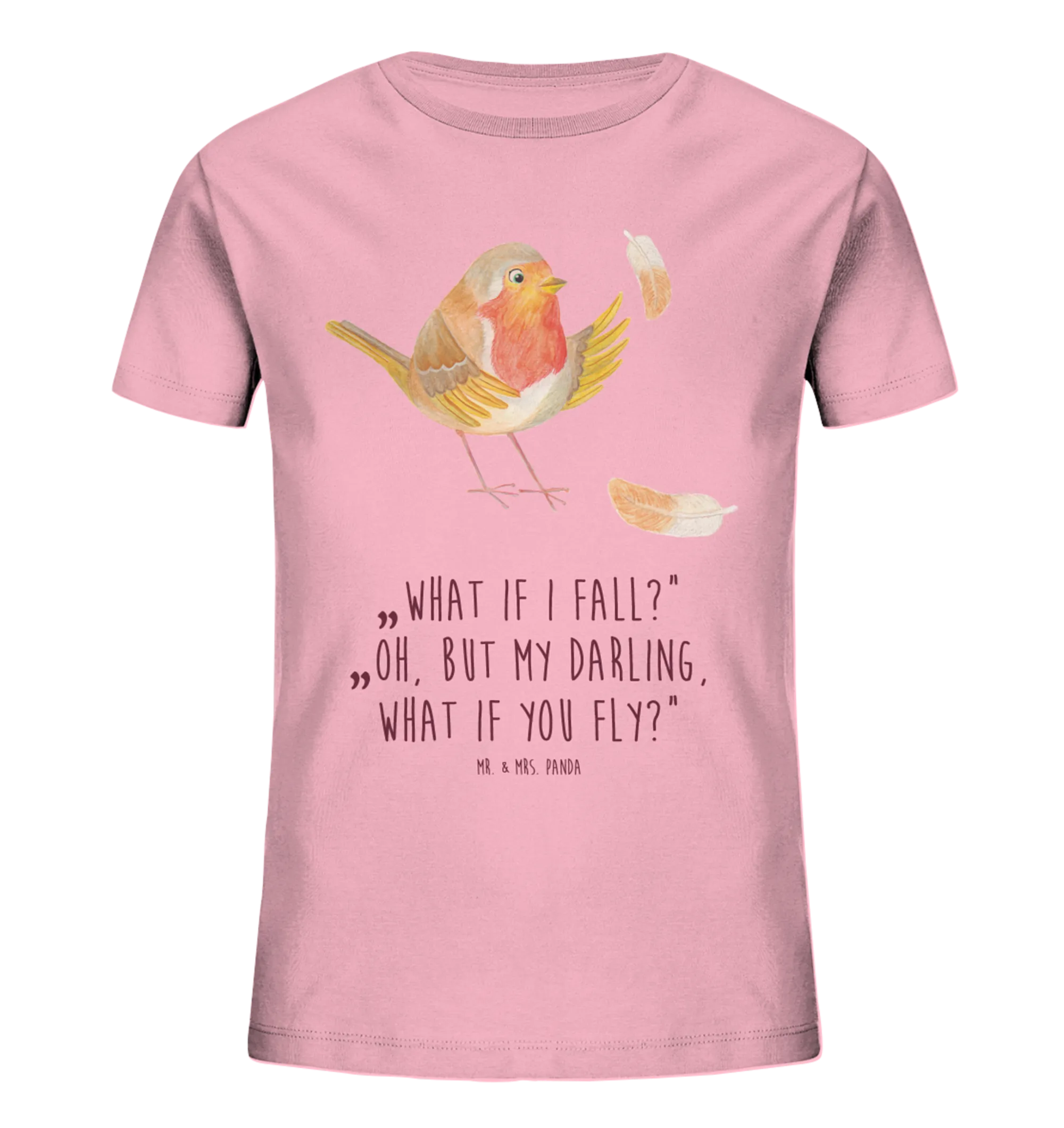 Das von Mr. & Mrs. Panda handgezeichnete Rotkehlchen mit bunten Federn strahlt so viel Freude und Lebendigkeit aus, dass es jeden Tag zu etwas Besonderem macht. Der Slogan ‚What if I fall? Oh, but my darling, what if you fly?‘ erinnert Kinder daran, mutig zu sein und ihre Träume zu verfolgen.