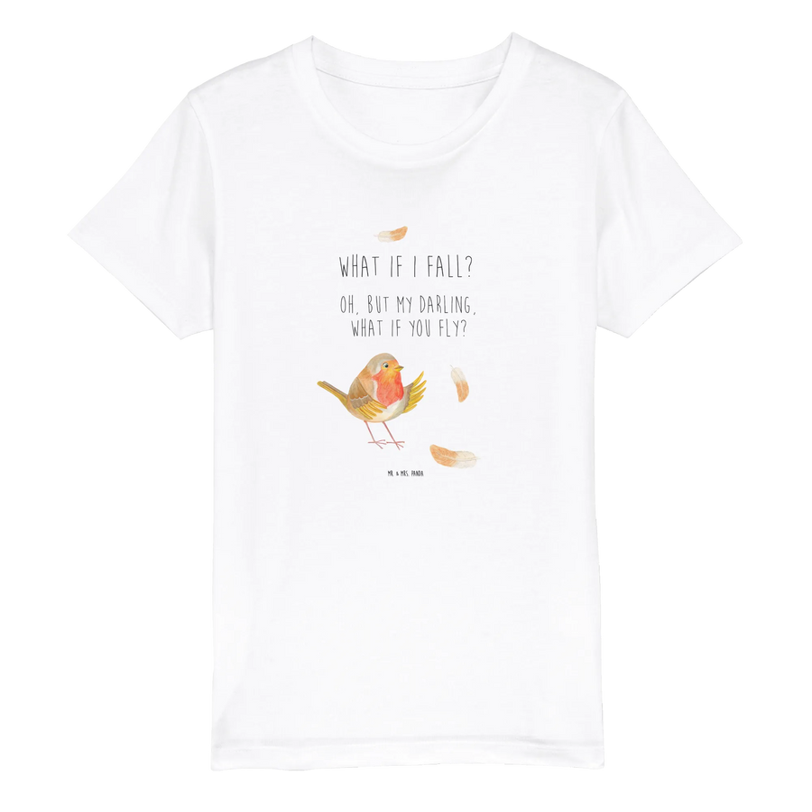Das Organic Kinder T-Shirt mit dem niedlichen Rotkehlchen-Motiv wählt man nicht zufällig aus. Es ist ein ganz besonderes Kleidungsstück aus der Small World Kollektion von Mr. & Mrs. Panda, das nicht nur modisch, sondern auch inspirierend ist. Mit dem Slogan „What if I fall? Oh, but my darling, what if you fly?“ auf der Vorderseite ermutigt dieses T-Shirt Kinder dazu, an sich selbst zu glauben und ihre Träume zu verfolgen. Ein süßes Rotkehlchen, umgeben von bunten Federn, bringt gute Laune und ein Lächeln ins Gesicht!