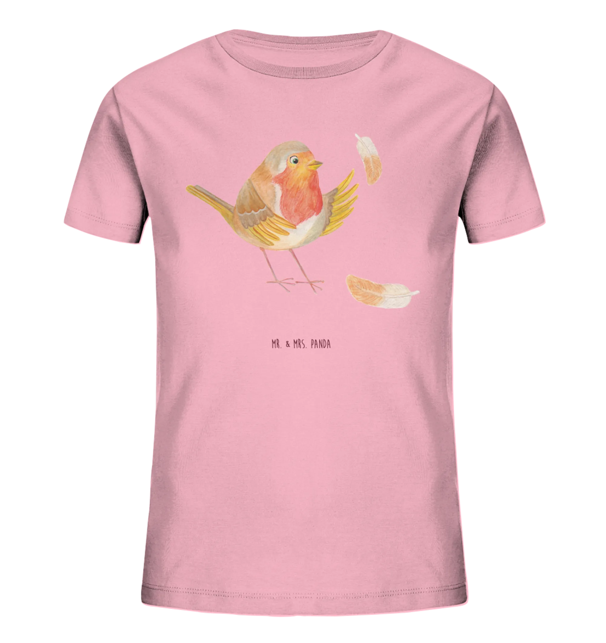 Das Rotkehlchen, liebevoll von Mr. & Mrs. Panda gezeichnet, sitzt umgeben von bunten Federn und strahlt eine friedliche Ruhe aus. Perfekt für Mädchen und Jungen, ist dieses T-Shirt eine tolle Wahl für jede Gelegenheit – sei es zum Geburtstag, zur Einschulung oder einfach als Überraschung.