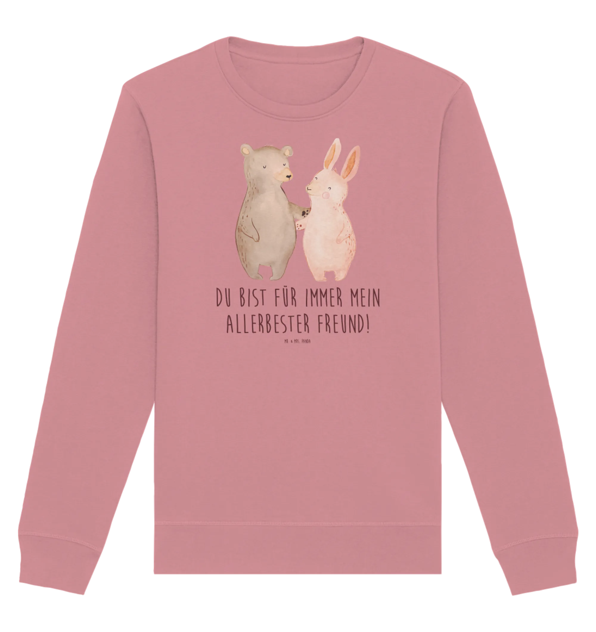 Das Motiv zeigt einen Bären und einen Hasen in zärtlicher Umarmung, handgezeichnet mit Aquarell-Effekt in sanften Braun- und Rosatönen. Der eingedruckte Spruch „Du bist für immer mein allerbester Freund!“ macht diesen Pullover zur perfekten Botschaft für deinen liebsten Menschen.