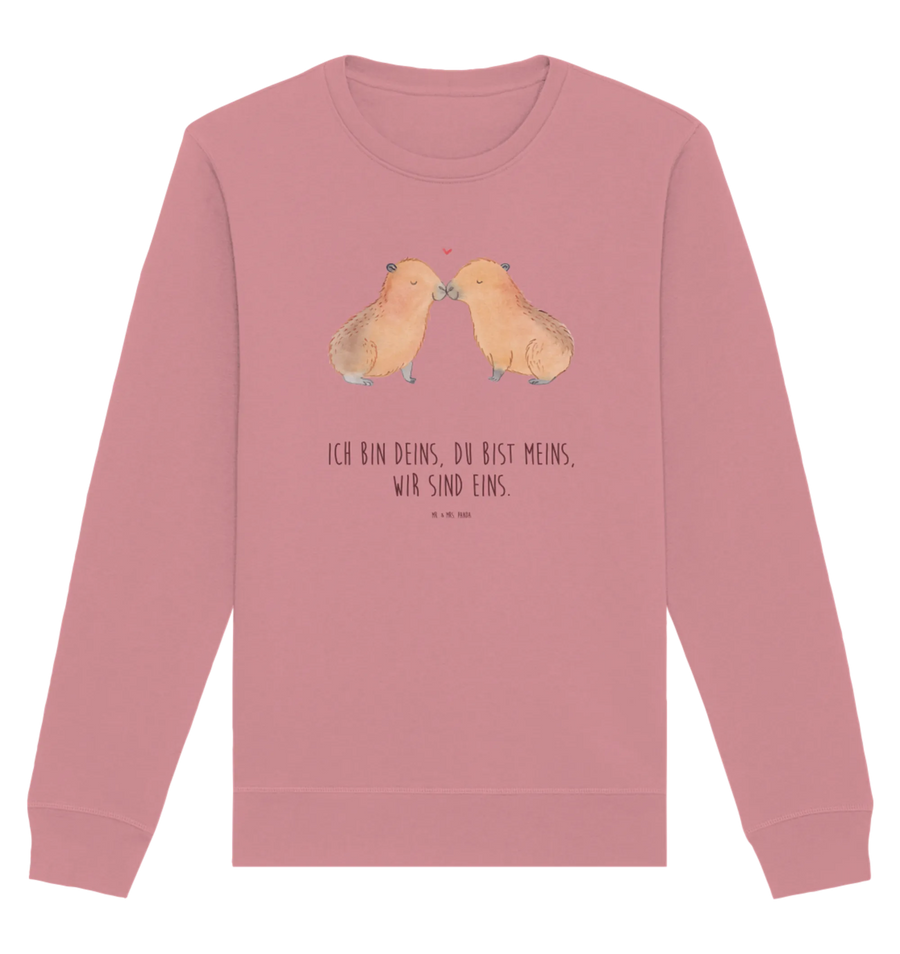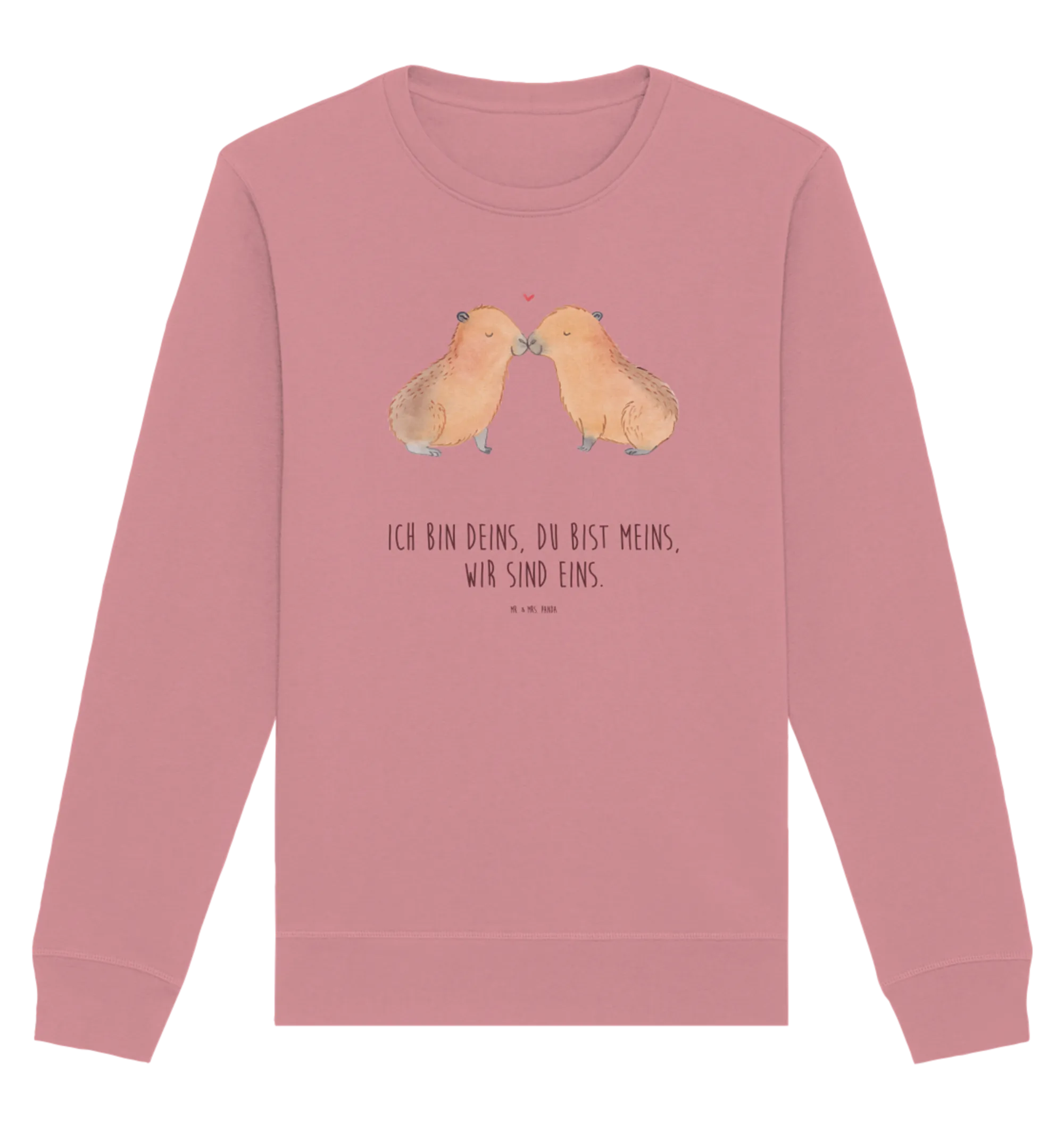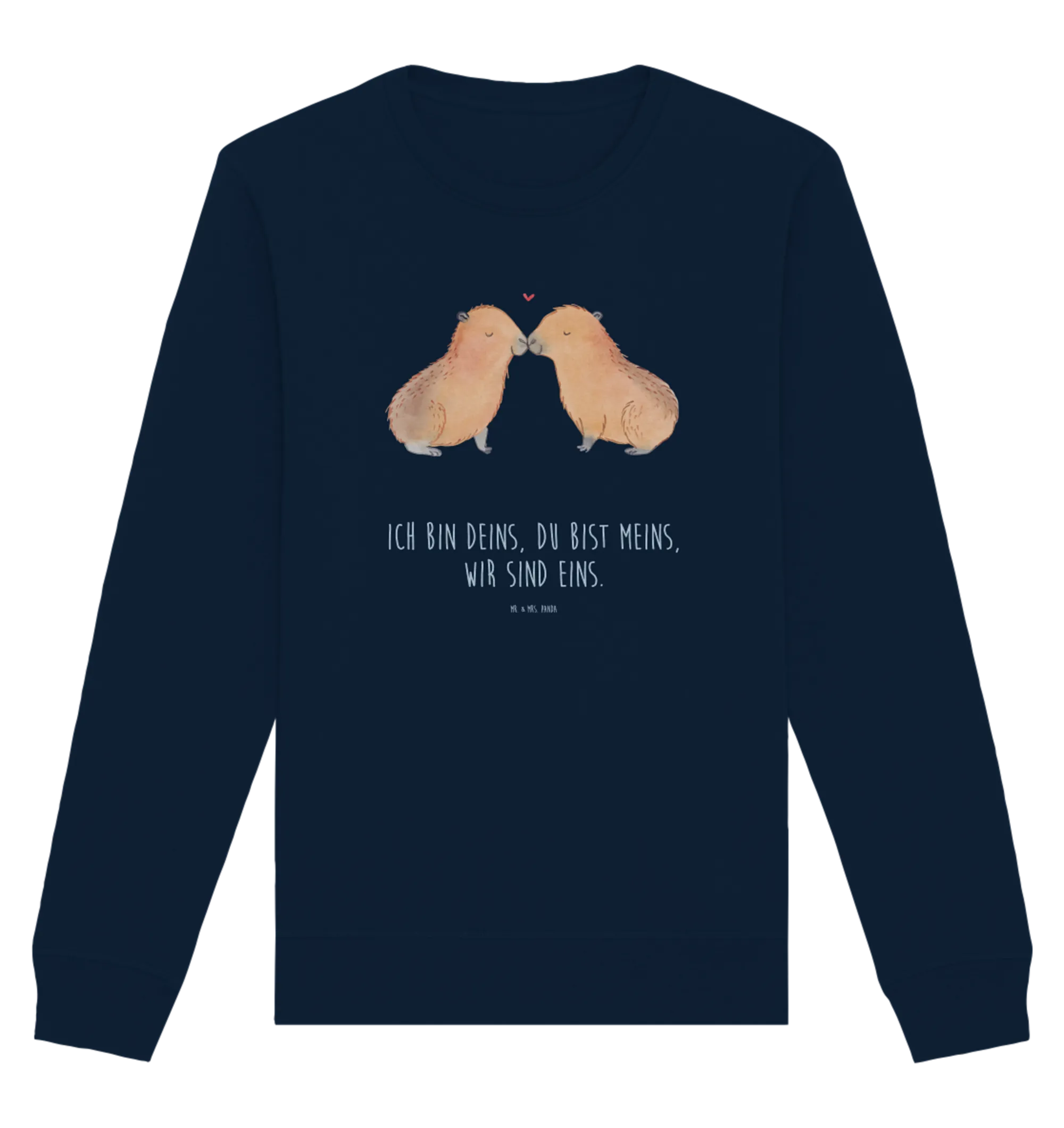 Suchst Du eine besondere Geschenkidee für den Jahrestag oder Valentinstag? Dieser Bio-Pullover mit dem handgezeichneten Capybara-Liebespaar ist ein liebevoller Liebesbeweis für Paare und Tierfreunde. Die zwei kuscheligen Capybaras berühren sich zärtlich an der Nase und formen ein Herz – darüber der kleine, rote Herzpunkt und der Spruch: "Ich bin deins, du bist meins, wir sind eins."