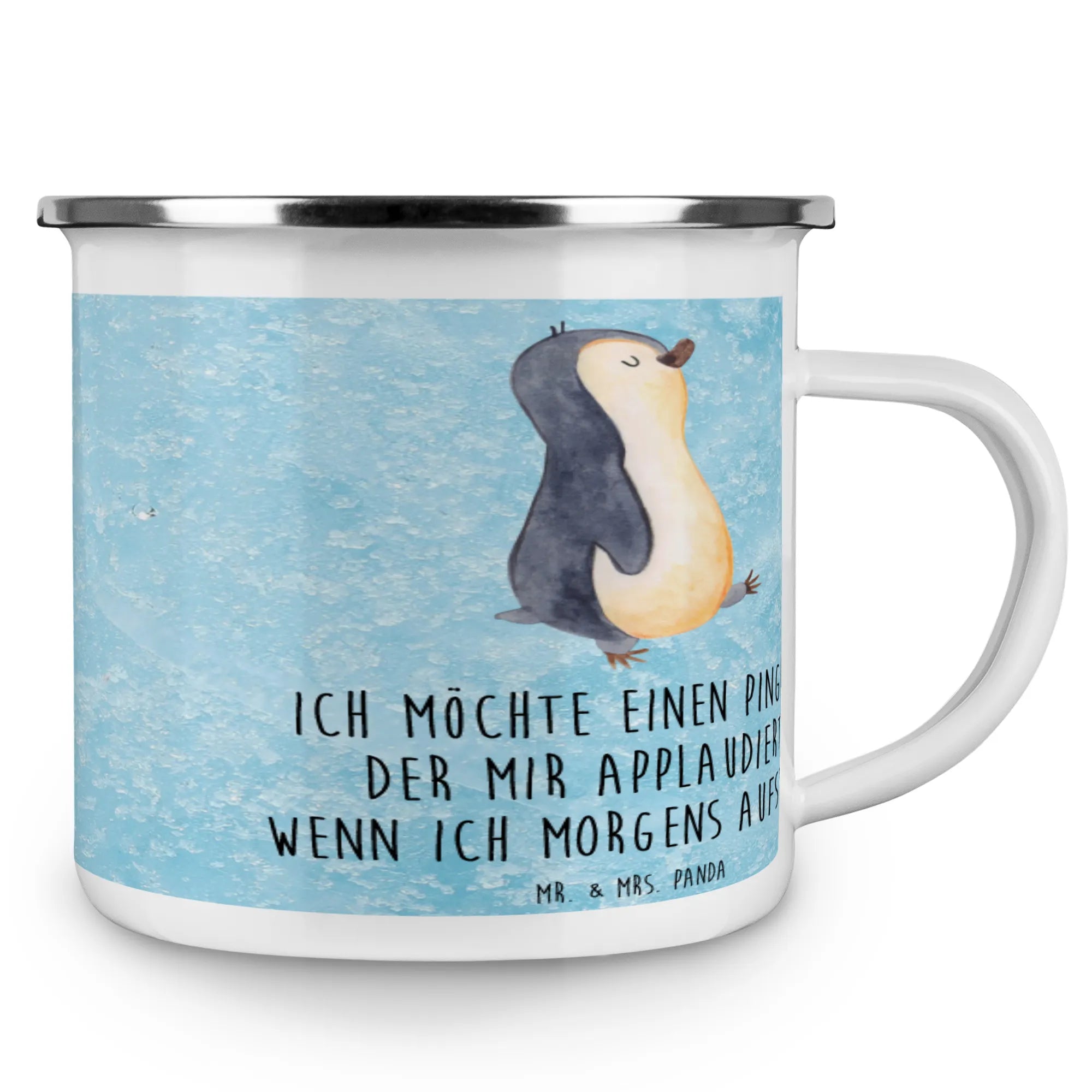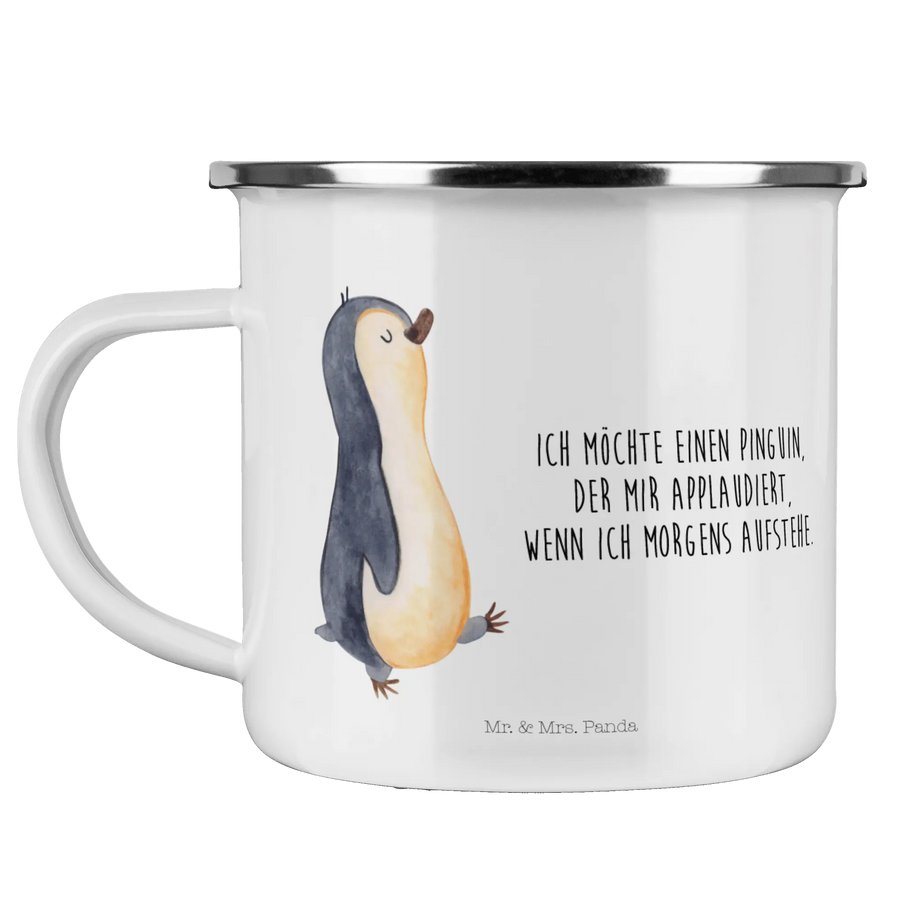 Unsere Camping Emaille Tasse „Pinguin marschierend“ aus der Pinguin - Kollektion von Mr. & Mrs. Panda ist der perfekte Begleiter für dein nächstes Abenteuer. Das handgezeichnete Motiv zeigt einen charmanten, leicht tollpatschigen Pinguin und wird ergänzt durch den liebevollen Slogan: „Ich möchte einen Pinguin, der mir applaudiert, wenn ich morgens aufstehe.“ Eine Kombination aus Witz, Wärme und Stil, die beim Camping, Wandern oder am Frühstückstisch für gute Laune sorgt.