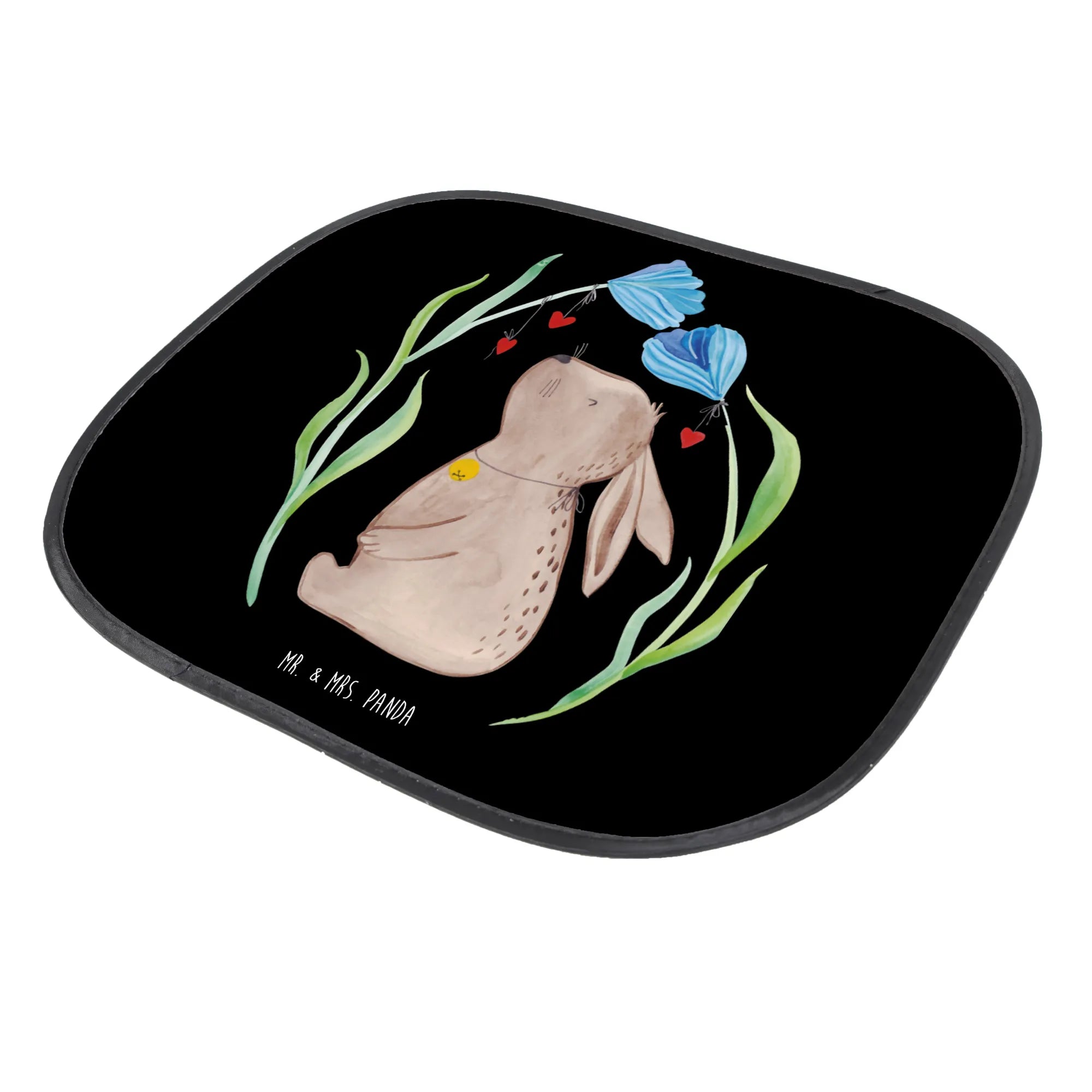 Unser Sonnenschutz Auto von Mr. & Mrs. Panda verbindet Funktion mit Fröhlichkeit: der süße Hase mit Glöckchen sitzt zwischen bunten Blumen auf einem schwarzen Hintergrund und bringt Osterstimmung in dein Auto. Ideal als Kindersonnenschutz Auto, Autofenster Sonnenschutz oder Seitlicher Sonnenschutz für die Seitenscheibe.