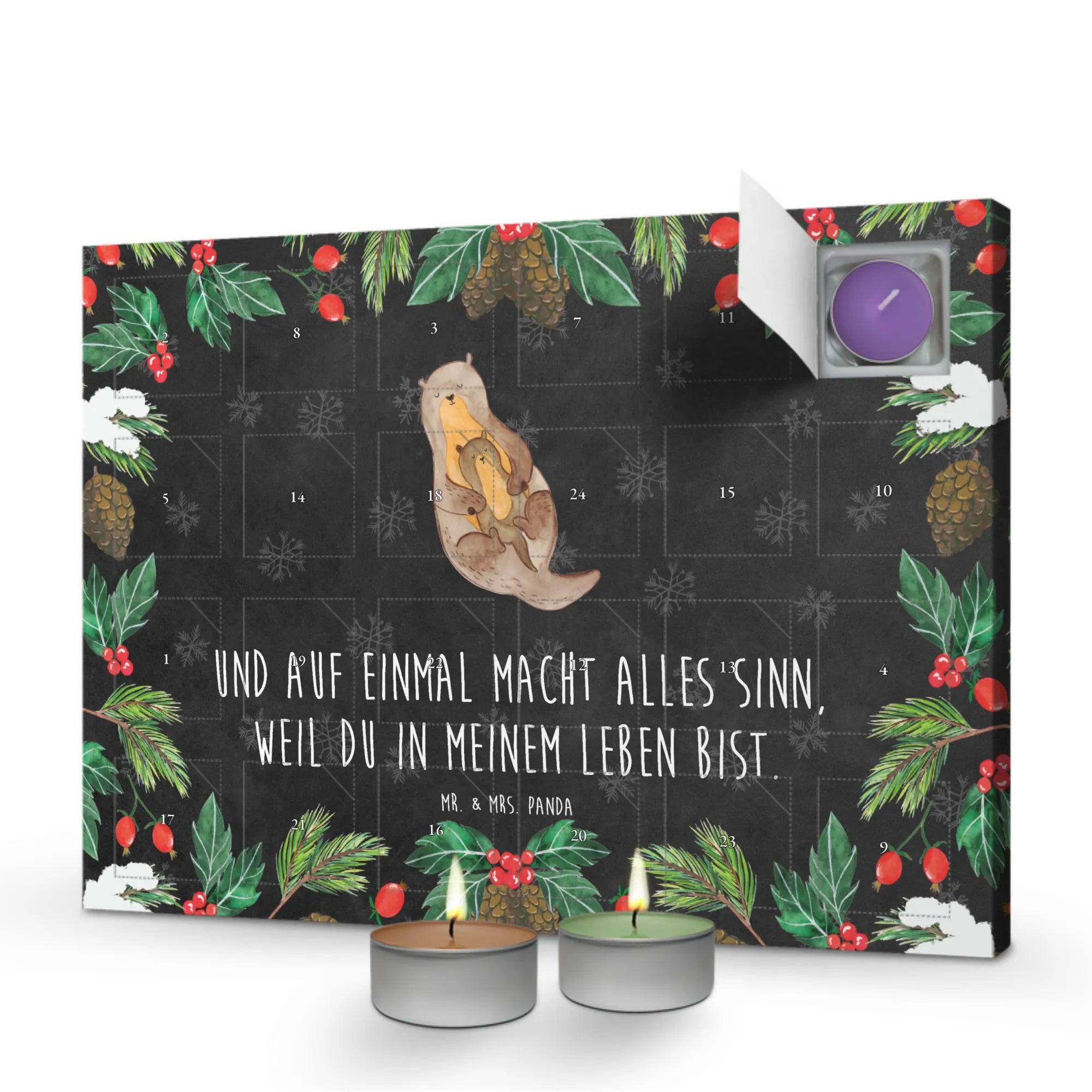 Der Duftkerzen Adventskalender "Otter mit Kind" von Mr. & Mrs. Panda ist das perfekte Geschenk für all diejenigen, die die besinnliche Adventszeit lieben. Mit seiner liebevollen Zeichnung eines süßen Otters, der sein kleines Kind umarmt, sorgt dieser Adventskalender für ein Gefühl von Geborgenheit und Wärme.