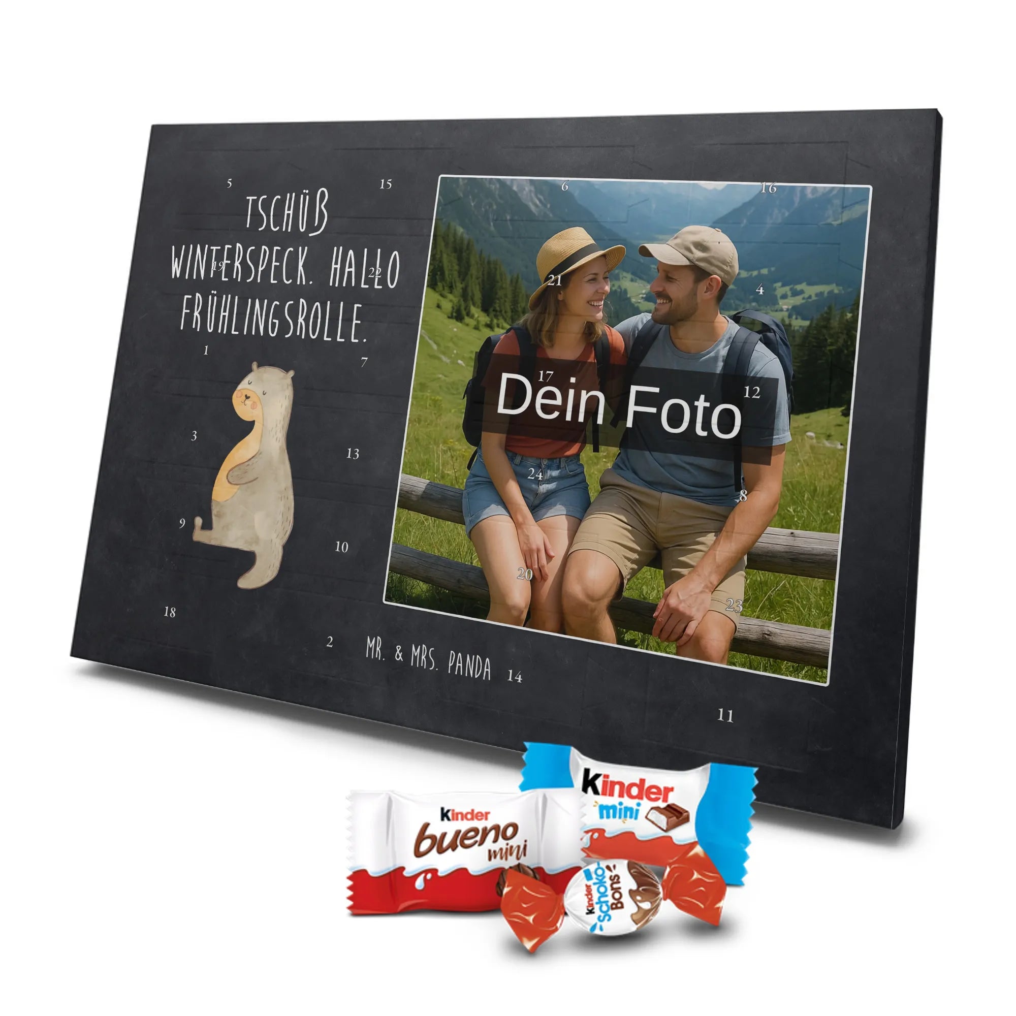 Personalisierter Schoko Foto Adventskalender von Mr. & Mrs. Panda – ein liebevoll gestaltetes Geschenk, das Vorfreude und Genuss vereint. In diesem personalisierten Schoko Foto Adventskalender kannst du dein Lieblingsfoto einsetzen und so jeden Tag im Dezember mit einem kleinen Lächeln öffnen. Der Kalender ist bedruckt mit unseren typischen Mr. & Mrs. Panda Motiven und süßen Sprüchen, die perfekt zu deinem Foto passen. Achte bitte bei der Bildauswahl auf hohe Auflösung, damit der Druck klar und brillant wird. Wähle einen passenden Bildausschnitt, damit keine wichtigen Details abgeschnitten werden. Lade nur Bilder hoch, bei denen du die Bildrechte besitzt oder die Zustimmung der abgebildeten Personen vorliegt. Die Fotos werden weder nachbearbeitet noch zugeschnitten; Rücknahme bei personalisierten Foto-Artikeln ist ausgeschlossen. Die Druckqualität ist brillant mit einer seidenmatten Oberflächenveredelung und bedruckten Seitenflächen für ein rundum schönes Erscheinungsbild. Maße: 355 mm x 245 mm x 11 mm. Praktisch: Du kannst den Adventskalender entweder aufstellen oder an die Wand hängen. Gefüllt ist der Kalender mit kinder® Schokolade – genauer: kinder® Schoko-Bons, kinder® Bueno mini und kinder® Schokolade mini. Bitte beachte: Um das beste Druckergebnis zu erzielen, lade ein hochwertiges Foto hoch und kontrolliere vor dem Bestellen den Bildausschnitt. Dieser Adventskalender ist das perfekte, persönliche Geschenk für Familie, Freunde oder für dich selbst – voller Liebe, süßer Überraschungen und dem unverwechselbaren Mr. & Mrs. Panda Charme.
