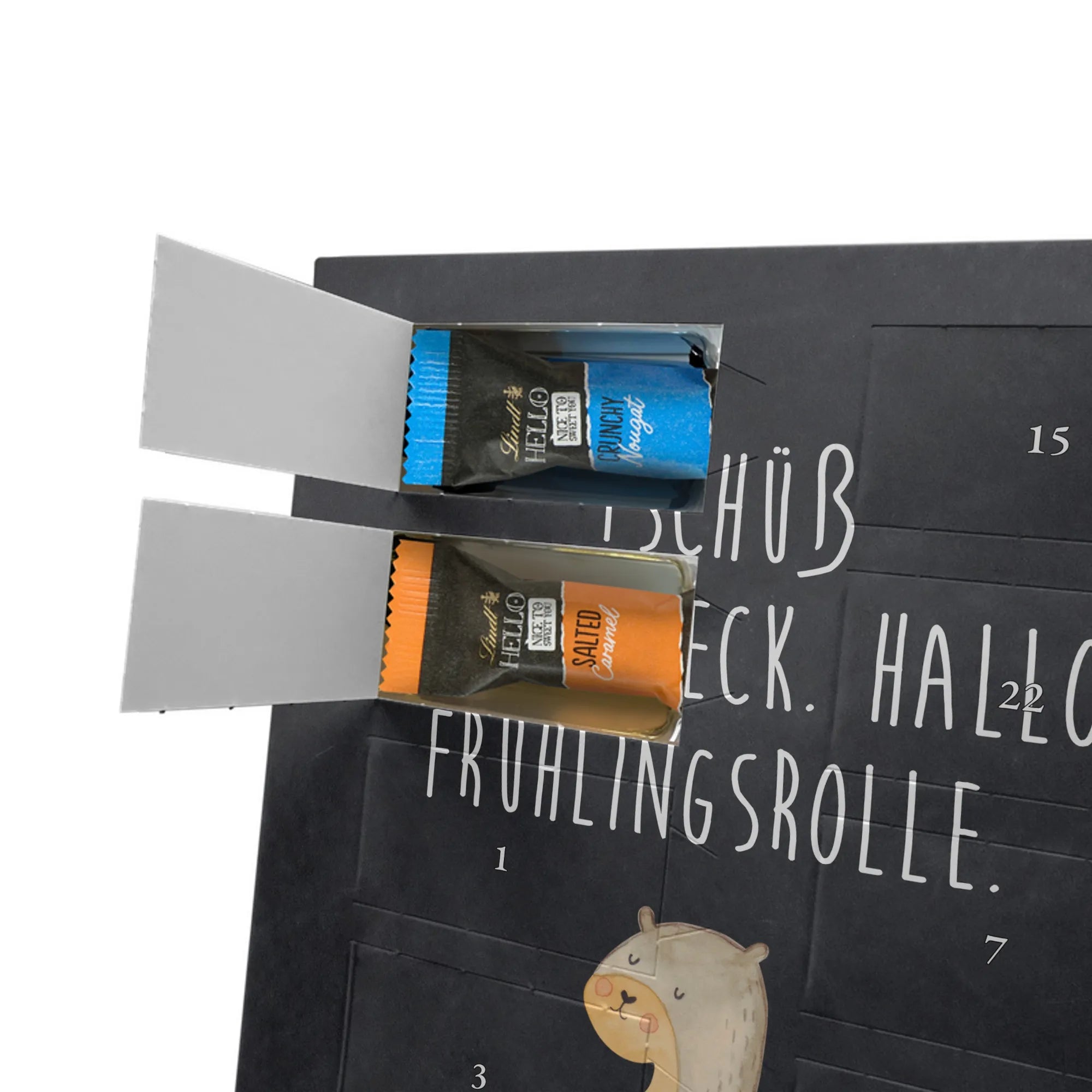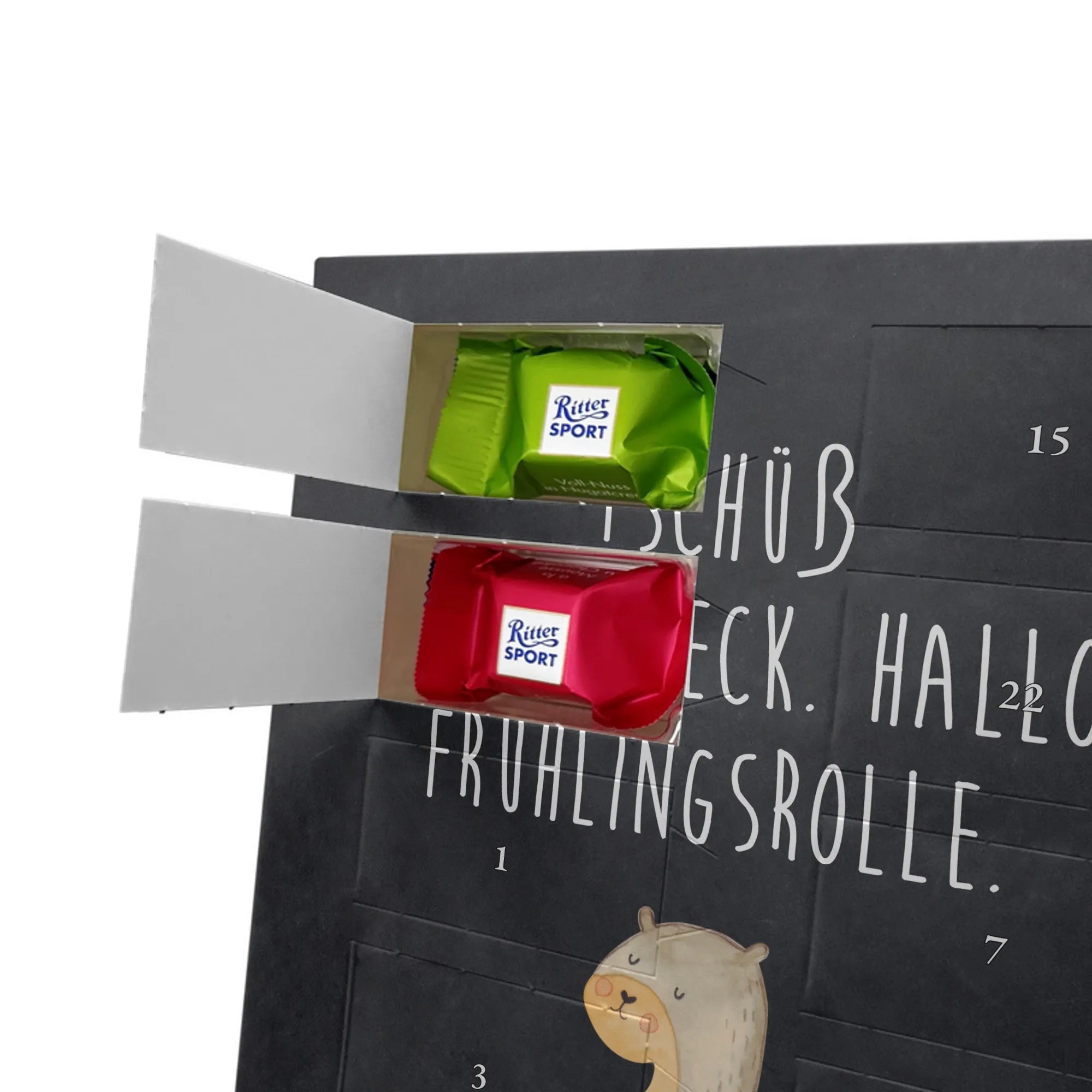 Schoko Foto Adventskalender personalisiert – ein fröhlicher Hingucker von Mr. & Mrs. Panda, der Adventszeit und Erinnerungen verbindet. Der Kalender ist bedruckt mit zauberhaften Motiven & Sprüchen von Mr. & Mrs. Panda und lässt sich ganz leicht mit einem Foto deiner Wahl personalisieren. Achtung Bildqualität: Für ein scharfes Druckbild solltest du ein Foto in hoher Auflösung verwenden. Kontrolliere den Bildausschnitt, damit wichtige Gesichter oder Details nicht verloren gehen. Verwende nur Fotos, für die du die Rechte besitzt oder die frei nutzbar sind. Bitte beachte: Die Fotos werden weder nachbearbeitet noch zugeschnitten und personalisierte Foto Artikel sind vom Umtausch ausgeschlossen. Die Verarbeitung überzeugt mit seidenmatter Oberflächenveredelung und bedruckten Seitenflächen für ein edles Finish. Maße: 325 mm x 225 mm x 27 mm. Besonderheit: Du kannst den Kalender aufhängen oder aufstellen – ganz flexibel. Gefüllt ist der Kalender mit Ritter Sport Schokowürfeln in leckeren Geschmacksrichtungen wie Mousse au Chocolat, Schoko Crisp, Voll-Nuss in Nougatcreme, Karamell Duo, Joghurt und Erdbeer-Joghurt. Ein liebevolles Geschenk, das jeden Tag im Advent versüßt.