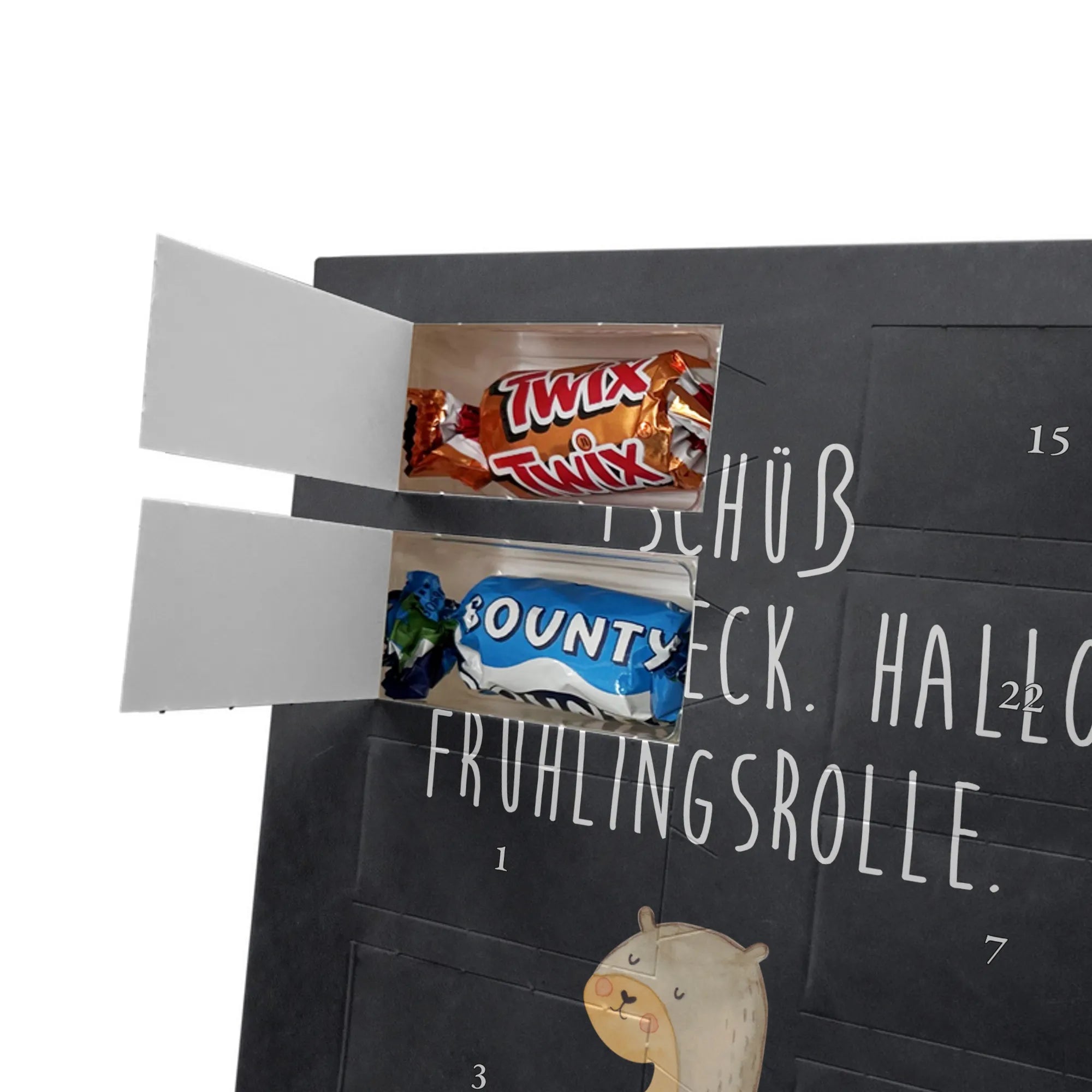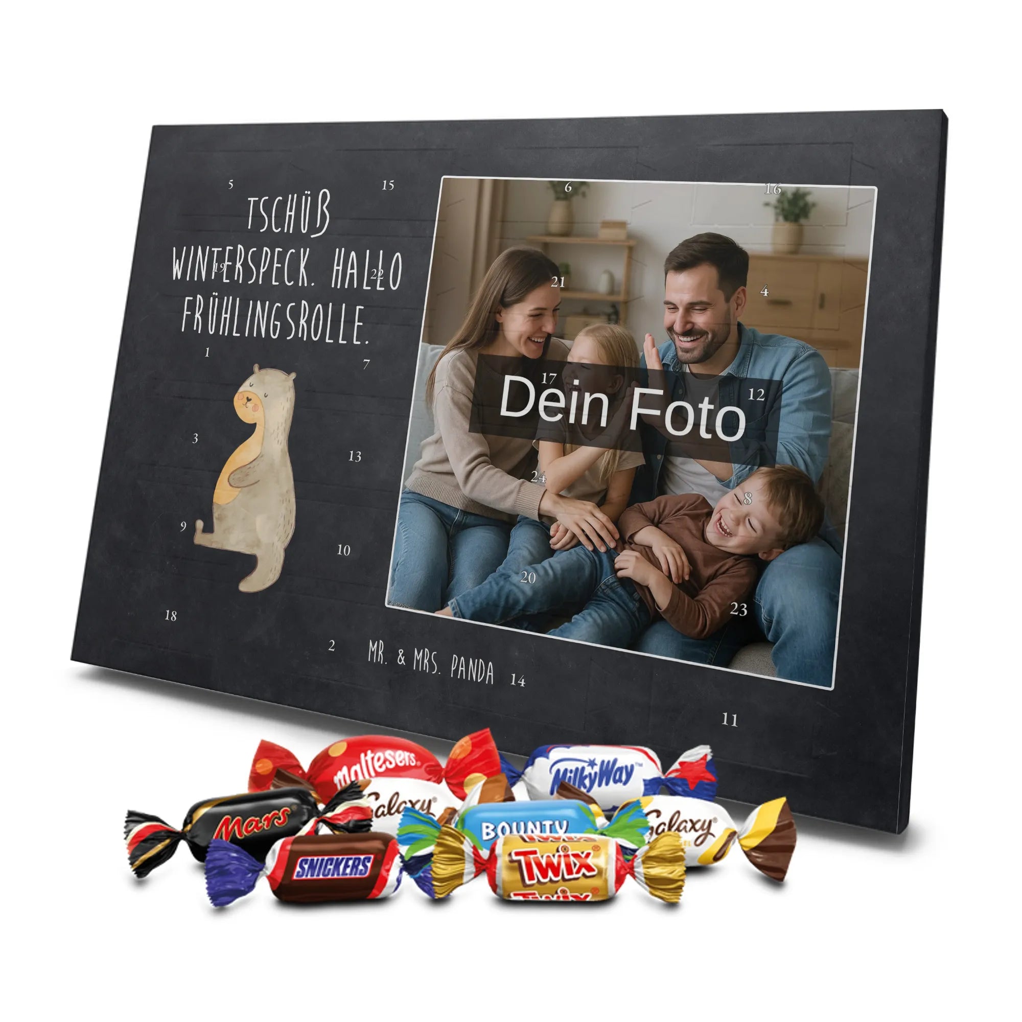 Lustiger Personalisierter Schoko Foto-Adventskalender – das Must-have für eine persönliche Adventszeit von Mr. & Mrs. Panda. Jeder Kalender wird mit unseren charmanten Illustrationen und liebevollen Sprüchen bedruckt, während dein Foto die Vorderseite einzigartig macht. Achte bitte darauf, ein Foto mit guter Qualität und ausreichend hoher Auflösung hochzuladen, damit der Druck gestochen scharf wirkt. Überprüfe den Bildausschnitt, damit wichtige Bereiche nicht verloren gehen. Denk daran, nur Bilder zu verwenden, bei denen du die nötigen Rechte besitzt. Die Verarbeitung ist hochwertig: brillante Druckqualität mit seidenmatter Oberflächenveredelung und bedruckten Seitenflächen. Maße: 325 mm x 225 mm x 27 mm. Du kannst den Kalender aufhängen oder aufstellen – sehr praktisch. Hinweis: Die hochgeladenen Fotos werden nicht nachbearbeitet oder zugeschnitten; Rücknahme bei personalisierten Foto-Artikeln ist ausgeschlossen. Gefüllt ist der Kalender mit Celebrations Schokolade – 24 Stück in 8 verschiedenen Sorten (Maltesers, Mars, Snickers, Twix, Milky Way, Bounty, Galaxy, Galaxy Caramel). Verschenke ein Stück persönlich gestaltete Vorfreude und mache jeden Dezembertag zu etwas Besonderem.
