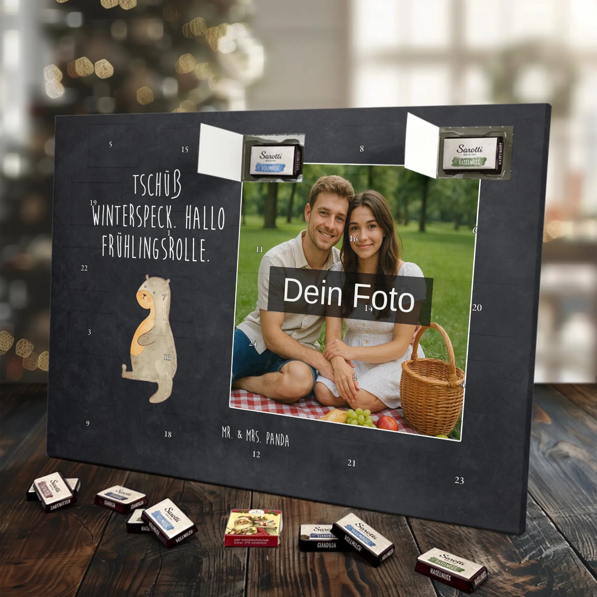 Mach die Adventszeit persönlich mit unserem Personalisiertes Schoko Foto-Adventskalender von Mr. & Mrs. Panda. Dieser Kalender kombiniert dein Lieblingsfoto mit unseren fröhlichen Illustrationen und liebevollen Sprüchen – perfekt als Geschenk für Partner, Familie oder Freunde. Für ein optimales Druckergebnis bitte ein hochauflösendes Bild verwenden und den Bildausschnitt so wählen, dass wichtige Details nicht verloren gehen. Beachte, dass wir Fotos nicht nachbearbeiten oder zuschneiden; lade nur Bilder hoch, für die du die Rechte besitzt. Die hochwertige Verarbeitung beinhaltet eine seidenmatte Oberflächenveredelung und bedruckte Seitenflächen, außerdem ist der Kalender robust und kann aufgehängt oder aufgestellt werden. Maße: 233 mm x 178 mm x 24 mm. Gefüllt mit Lindt Lindor Markenschokolade: 24 einzeln verpackte Kugeln in den Sorten Vollmilch, Feinherb und Weiße Schokolade. Inhaltsstoffe und Allergene sind angegeben; es kann Haselnüsse und Mandeln enthalten. Hinweis: Personalisierte Foto-Artikel sind vom Umtausch ausgeschlossen. Ein süßer, persönlicher Adventsgruß von Mr. & Mrs. Panda.
