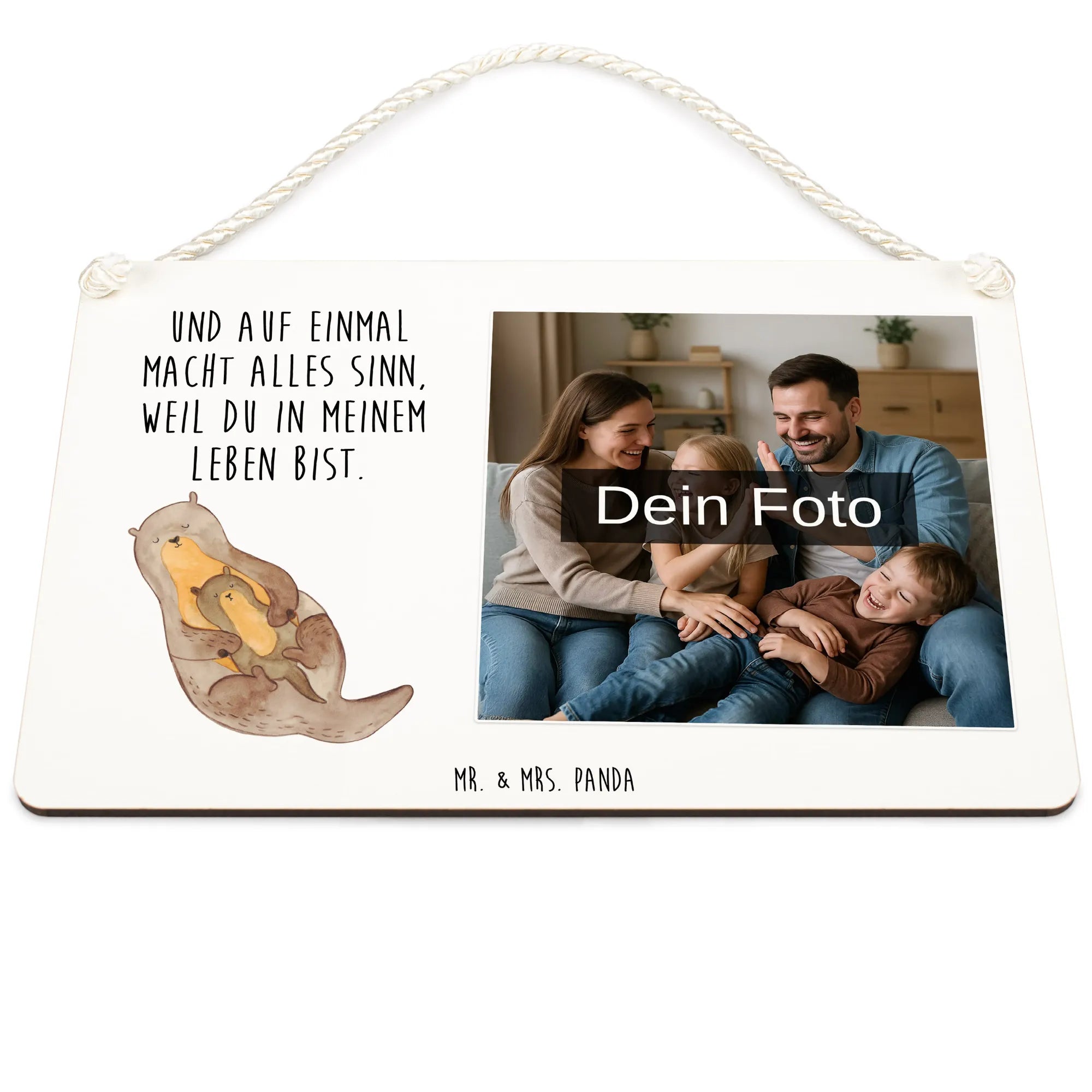 Ein kleines Kunstwerk voller Gefühl: Unser personalisiertes Foto Deko Schild „Otter mit Kind“ aus der Otter - Kollektion von Mr. & Mrs. Panda bringt Geborgenheit in deine vier Wände. Das liebevoll handgezeichnete Otter-Motiv zeigt einen kleinen Otter, der sich wohlig an seinen Elternteil kuschelt. Dazu der zarte Spruch "Und auf einmal macht alles Sinn, weil du in meinem Leben bist." – perfekt für all die Momente, die dein Herz wärmen.
