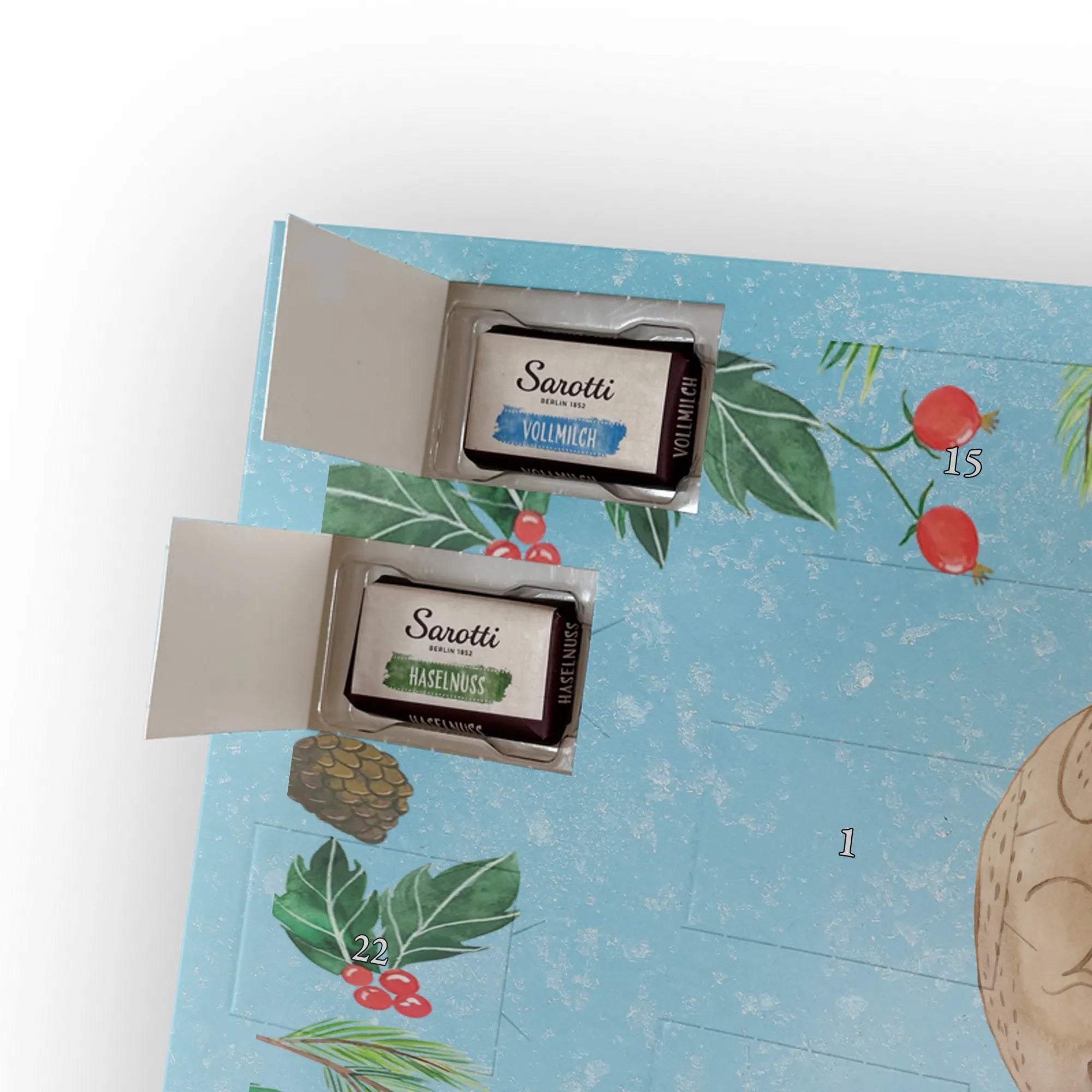 Mach die Vorweihnachtszeit besonders süß mit unserem Schoko-Adventskalender von Mr. & Mrs. Panda. Fröhliche Illustrationen und liebe Sprüche schmücken Vorder- und Seitenflächen, gedruckt in brillanter Qualität und veredelt mit einer seidenmatten Oberfläche für ein warmes, elegantes Finish. Der Kalender ist nicht personalisierbar, überzeugt dafür durch praktische Nutzung: zum Aufhängen oder Aufstellen geeignet. Hinter den 24 Türchen verbergen sich einzeln verpackte Schokoladentäfelchen in vier köstlichen Geschmacksrichtungen – Vollmilch, Nougat, Zartbitter und Haselnuss – von Sarotti® und Confiserie Heidel®. Insgesamt liefert der Kalender 107 g Markenschokolade. Maße: 355 mm x 245 mm x 11 mm – ideal, um Adventsfreude dekorativ zu präsentieren. Verschenke Liebe und Genuss in einem schönen Design, das sich wunderbar in jede Weihnachtsecke einfügt. Mr. & Mrs. Panda wünscht dir eine gemütliche Adventszeit voller kleiner, süßer Überraschungen.