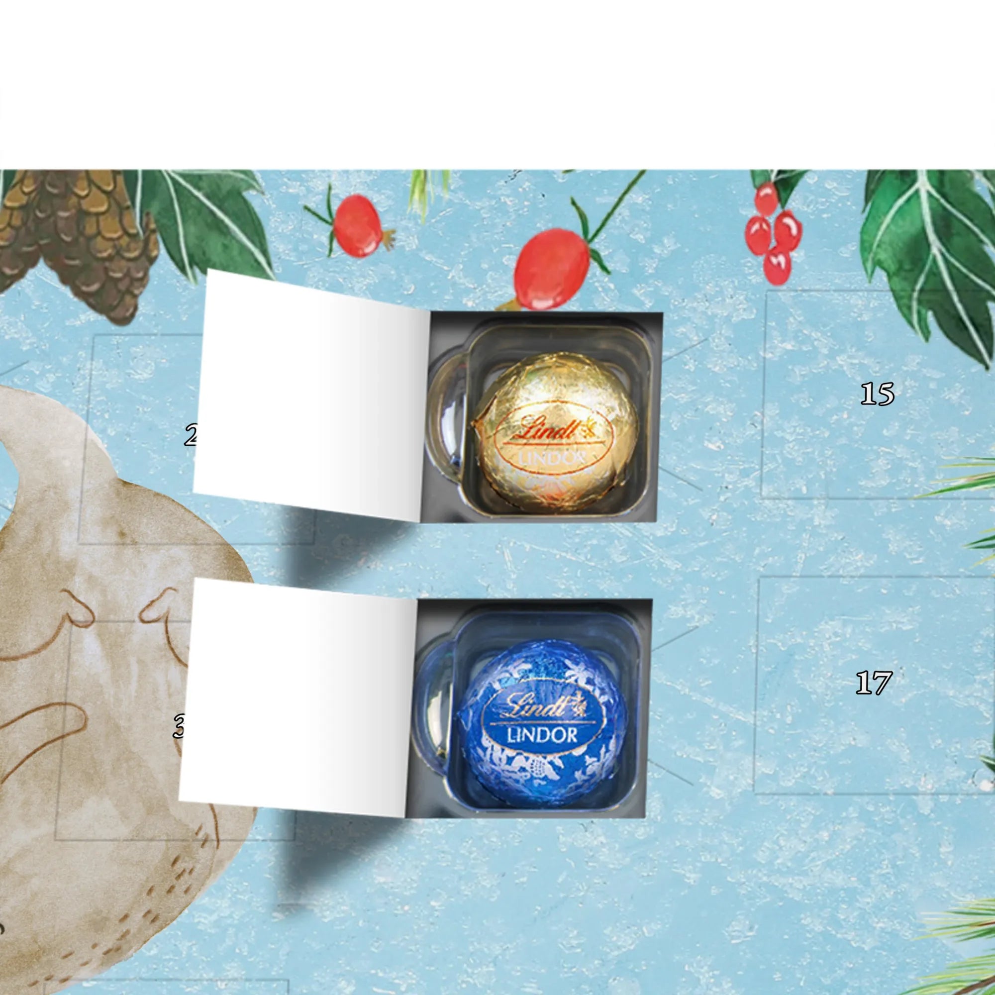 Unser zauberhafter Schoko Adventskalender von Mr. & Mrs. Panda bringt dir die süßeste Vorfreude auf Weihnachten! Dieser liebevoll gestaltete Adventskalender ist bedruckt mit wunderschönen Motiven & Sprüchen von Mr. & Mrs. Panda und ist nicht personalisierbar – dafür aber ein perfektes Geschenk für Freunde und Familie. Brillante Druckqualität mit seidenmatter Oberflächenveredelung sorgt für ein edles Finish, und die bedruckten Seitenflächen machen den Kalender von allen Seiten zu einem Hingucker. Maße: 233 mm x 178 mm x 24 mm. Besonderheit: kann aufgehängt oder aufgestellt werden, je nachdem, wie du ihn präsentieren möchtest. Gefüllt mit Lindt Lindor: 24 einzeln verpackte Markenschokoladen Kugeln in drei verschiedenen Sorten – Vollmilch, Feinherb und Weiße Schokolade – sorgen für abwechslungsreichen Genuss in der Adventszeit. Zutaten: Zucker, pflanzliches Fett (Kokosnuss, Palmkern), Kakaobutter, Vollmilchpulver, Kakaomasse, Milchzucker, Magermilchpulver, Butterreinfett, Emulgator (Sojalecithin), Gerstenmalzextrakt, Aromen. Besondere Hinweise: Kann Haselnüsse und Mandeln enthalten. Unser Schoko Adventskalender verbindet niedliches Design mit hochwertiger Füllung – ideal zum Verschenken oder selbst Naschen. Mr. & Mrs. Panda wünschen dir eine fröhliche und leckere Adventszeit!
