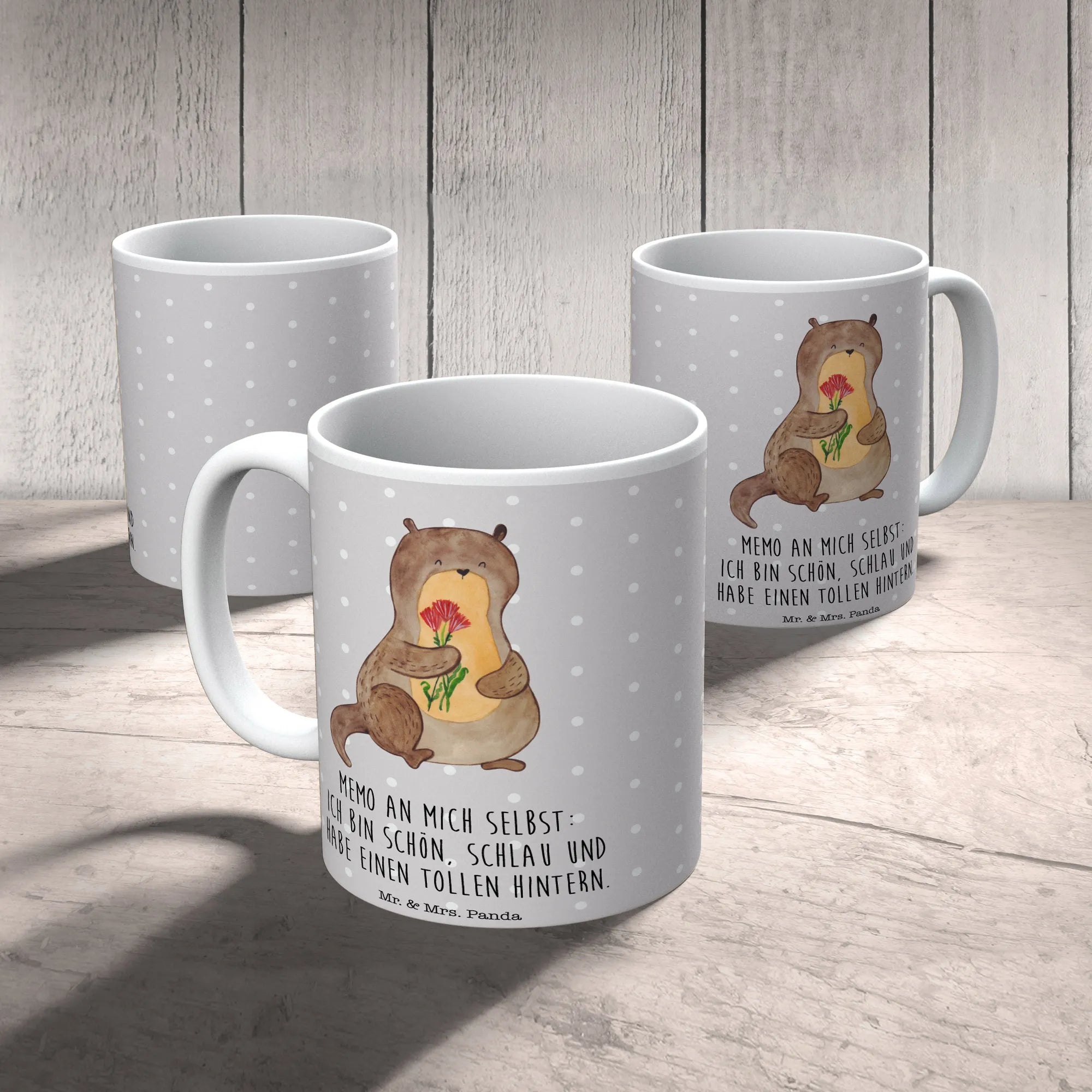 Egal ob für dich selbst oder als Geschenk, die Tasse "Otter Blumenstrauß" von Mr. & Mrs. Panda ist der perfekte Begleiter für all jene Kaffee- und Teeliebhaber, die Spaß und Farbe in ihren Alltag bringen möchten. Diese wunderschöne Kaffeetasse aus hochwertiger Keramik besticht nicht nur durch ihre exzellente Verarbeitung, sondern auch durch ihr einzigartiges Design. Der niedliche Otter, der einen bunten Blumenstrauß in seinen Pfötchen hält, bringt jedem ein Lächeln ins Gesicht und sorgt für gute Laune. Der Spruch "Memo an mich selbst: ich bin schön, schlau und habe einen tollen Hintern." macht die Tasse zu einem wahren Motivationsschub für jeden Tag.