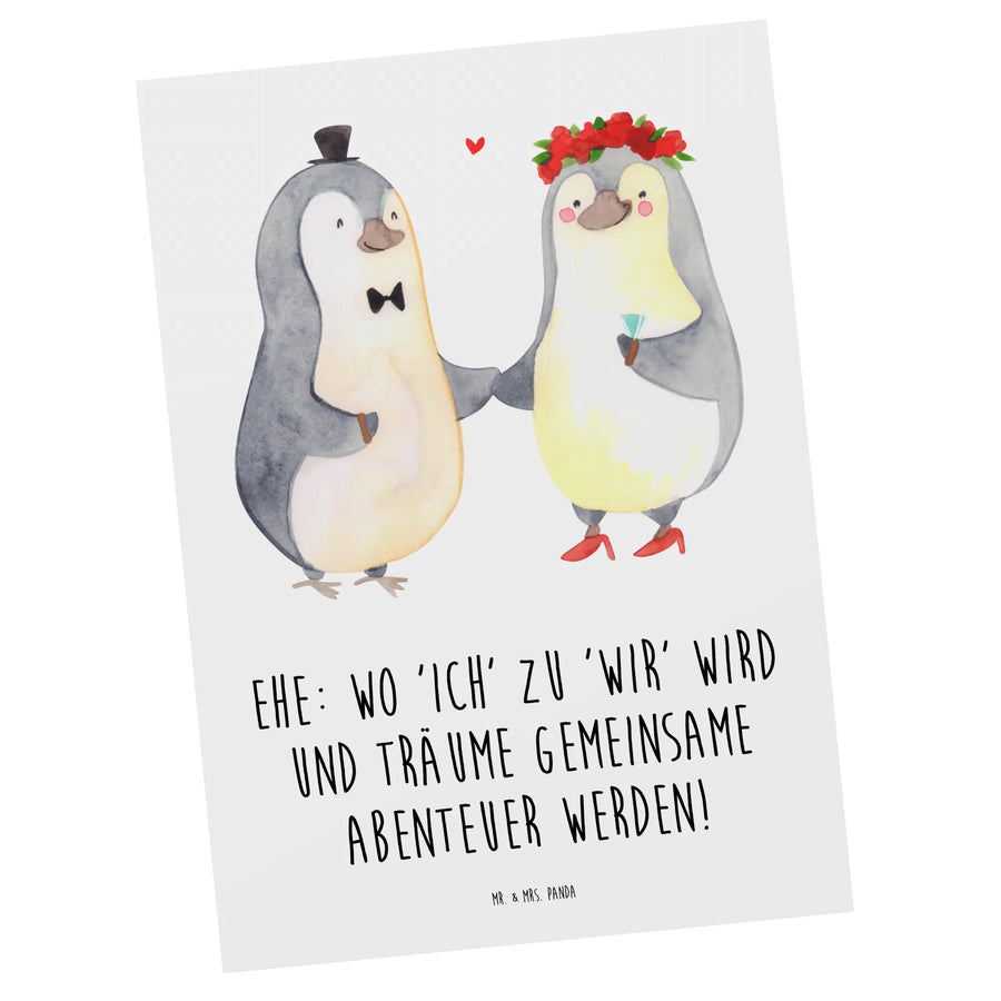 Entdecke unsere bezaubernde Postkarte zur Hochzeitsfeier von Mr. & Mrs. Panda! Diese einzigartige Postkarte ist perfekt für jeden, der seine besten Wünsche zur Ehe auf romantische Art und Weise übermitteln möchte. Mit dem liebevollen Spruch "Ehe: wo 'Ich' zu 'Wir' wird und Träume gemeinsame Abenteuer werden!" fängt sie den Zauber der Liebe ein und macht sie zu einem wunderbaren Geschenk. Bereite Hochzeitspaare mit dieser herrlichen Karte Freude – sei es als Einladung zur Hochzeitsfeier, als Dankeskarte nach dem großen Tag oder einfach als kleine Aufmerksamkeit zwischen Freunden.