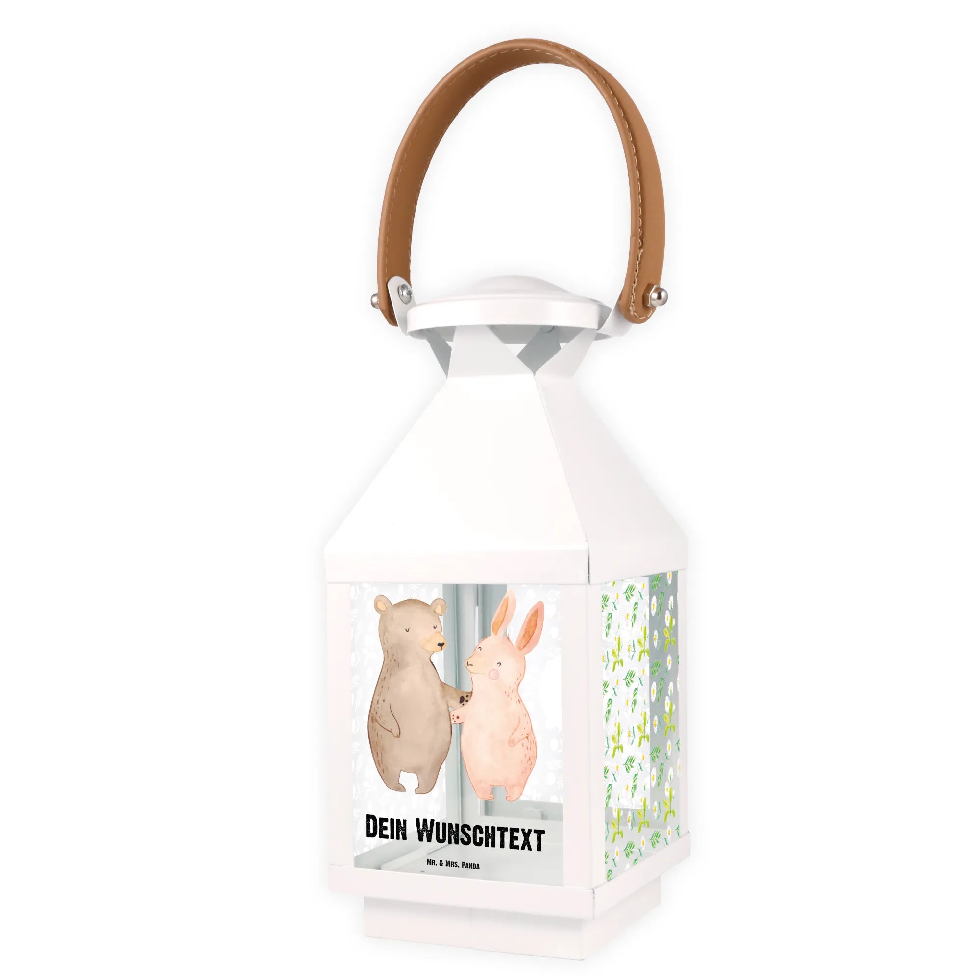 Die personalisierte Deko Laterne mit dem liebevollen Motiv "Bär und Hase Umarmen" ist der perfekte Begleiter für romantische Abende. Diese charmante Laterne aus hochwertigem, weiß lackiertem Metall und robustem Glas verleiht deinem Garten oder Balkon eine ganz besondere Atmosphäre.