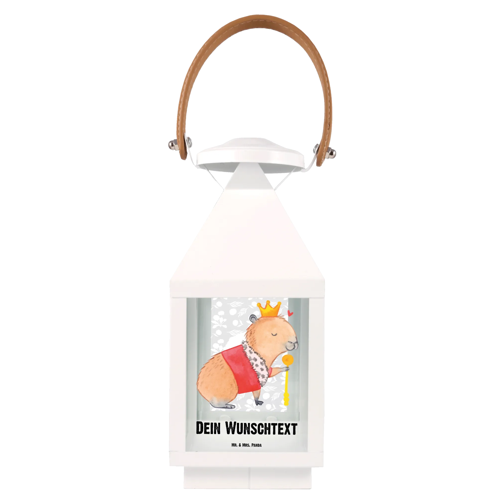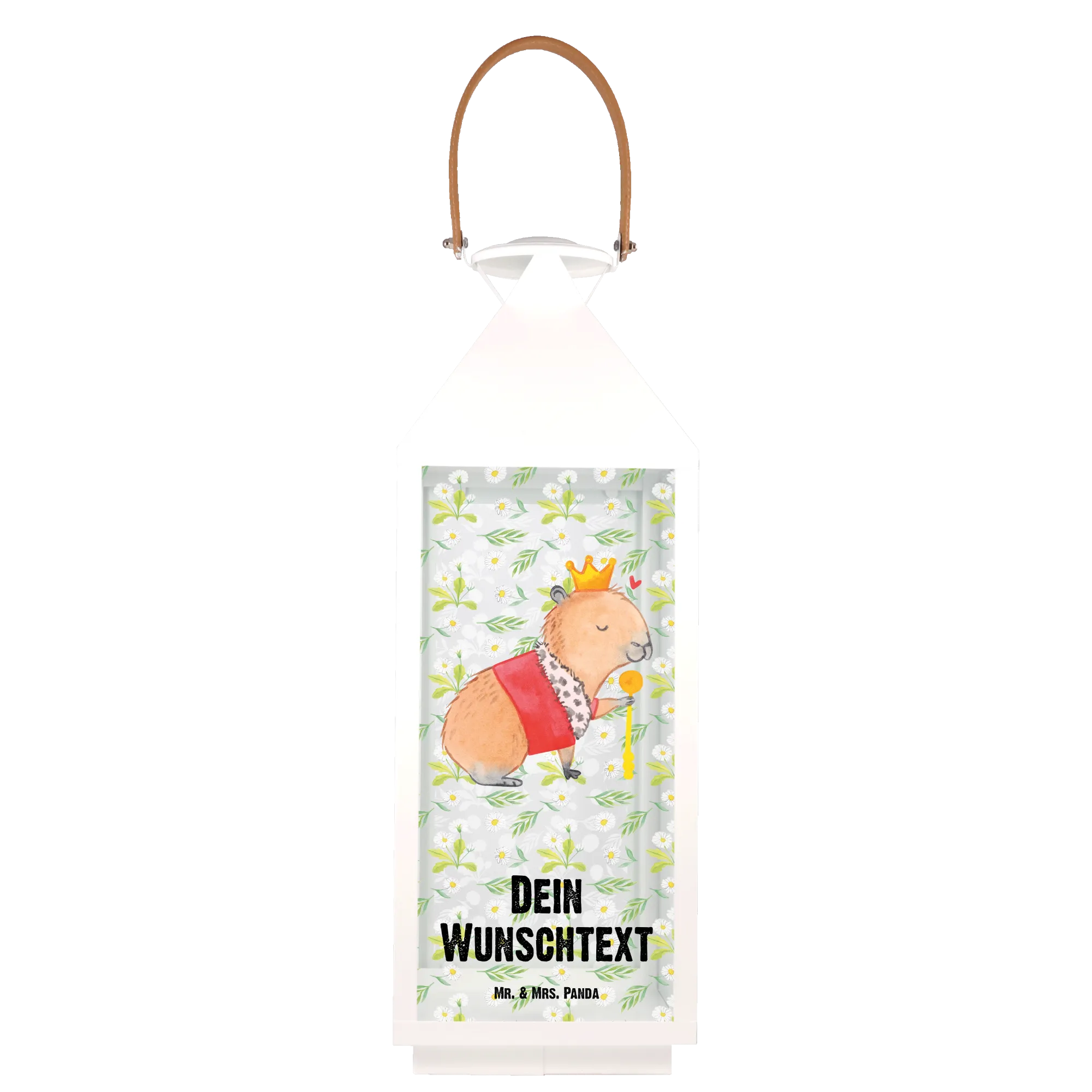 Die liebevoll handgezeichnete Darstellung des Capybara Königs, der stolz mit Krone und Zepter sein Königreich bewacht, versprüht eine fröhliche Stimmung. Ein kleines Herzchen über seinem Kopf symbolisiert seine Freundlichkeit und macht diese Laterne zu einem besonderen Dekorationsstück.