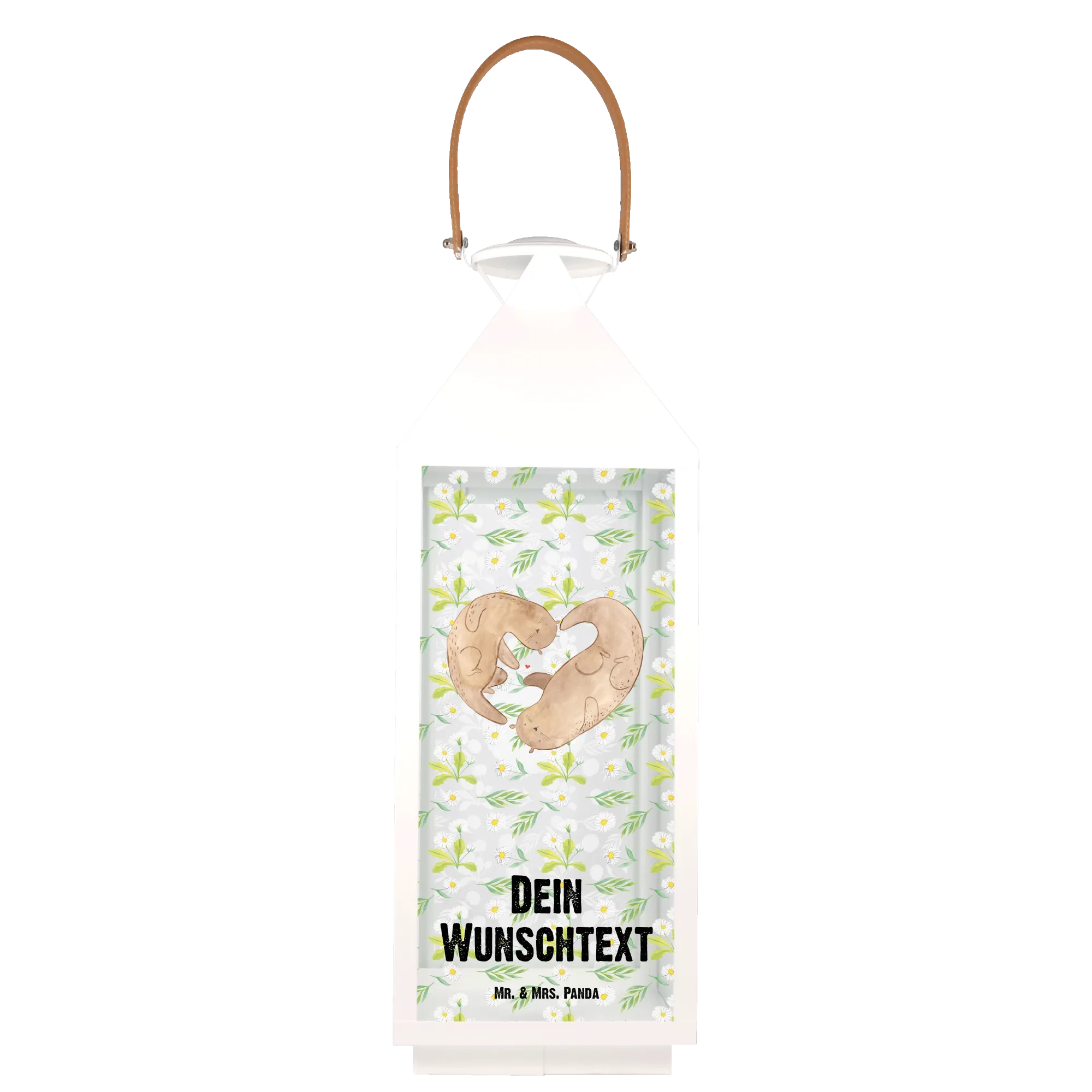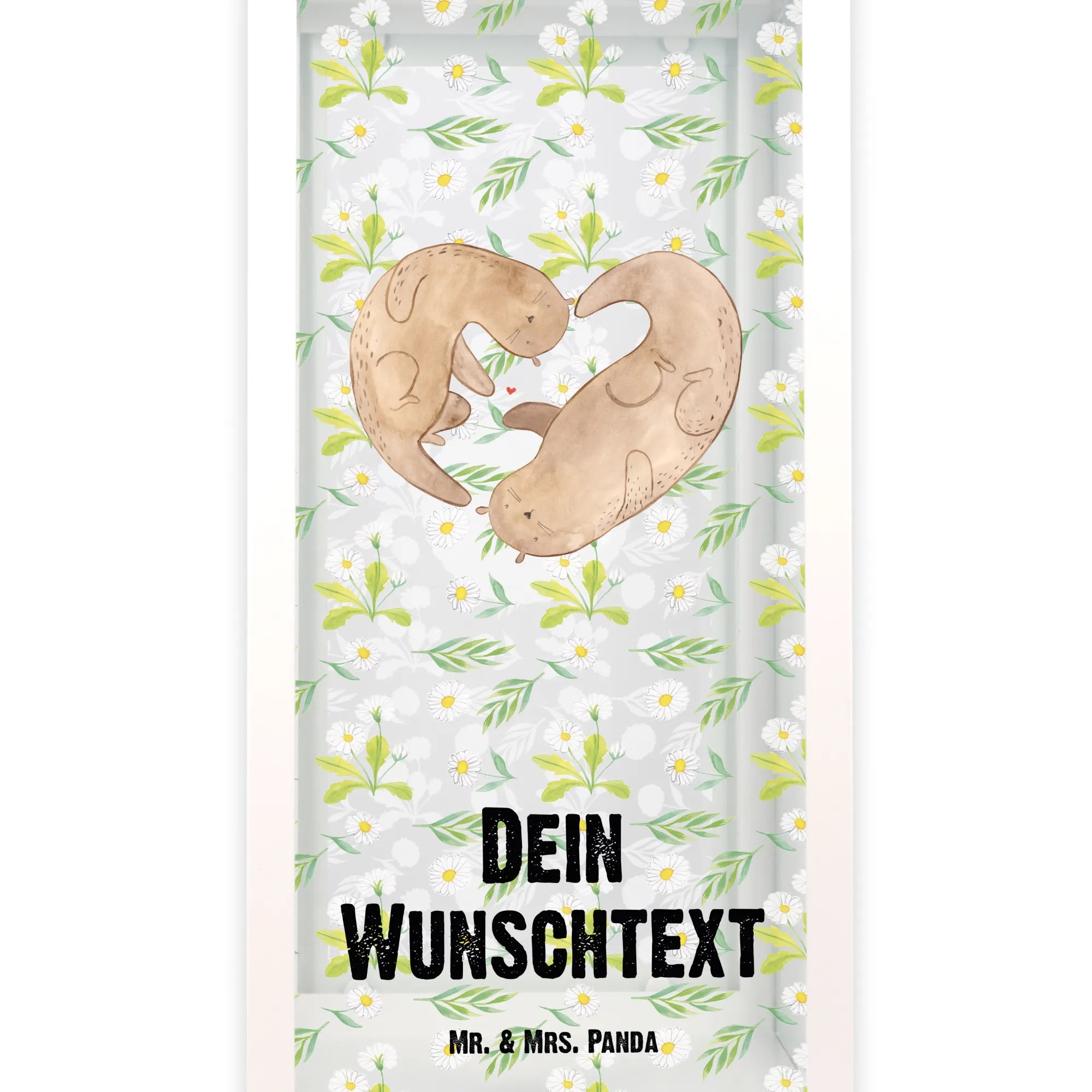 Die personalisierte Deko Laterne Otter Valentine von Mr. & Mrs. Panda ist das perfekte Geschenk für Verliebte. Mit ihrem liebevollen Design, das zwei Otter zeigt, die sich an den Pfoten halten und ein Herz formen, zaubert sie sofort ein Lächeln auf jedes Gesicht. Dieser romantische Blickfang ist nicht nur eine wunderschöne Gartendekoration, sondern auch eine stilvolle Gartenlampe, die für eine romantische Atmosphäre sorgt.