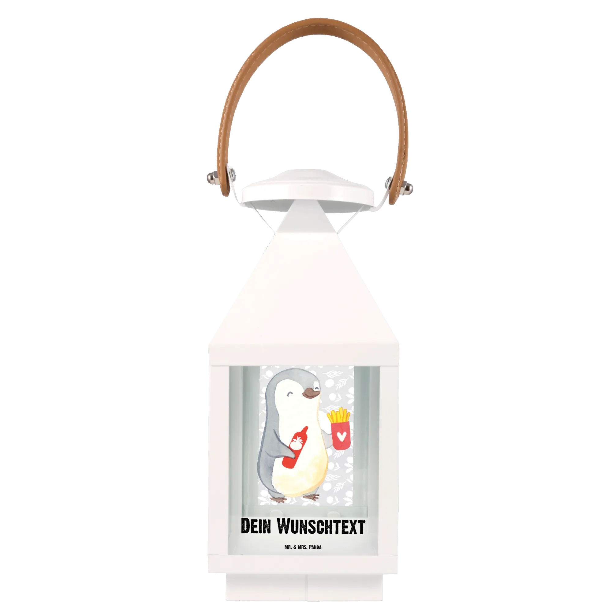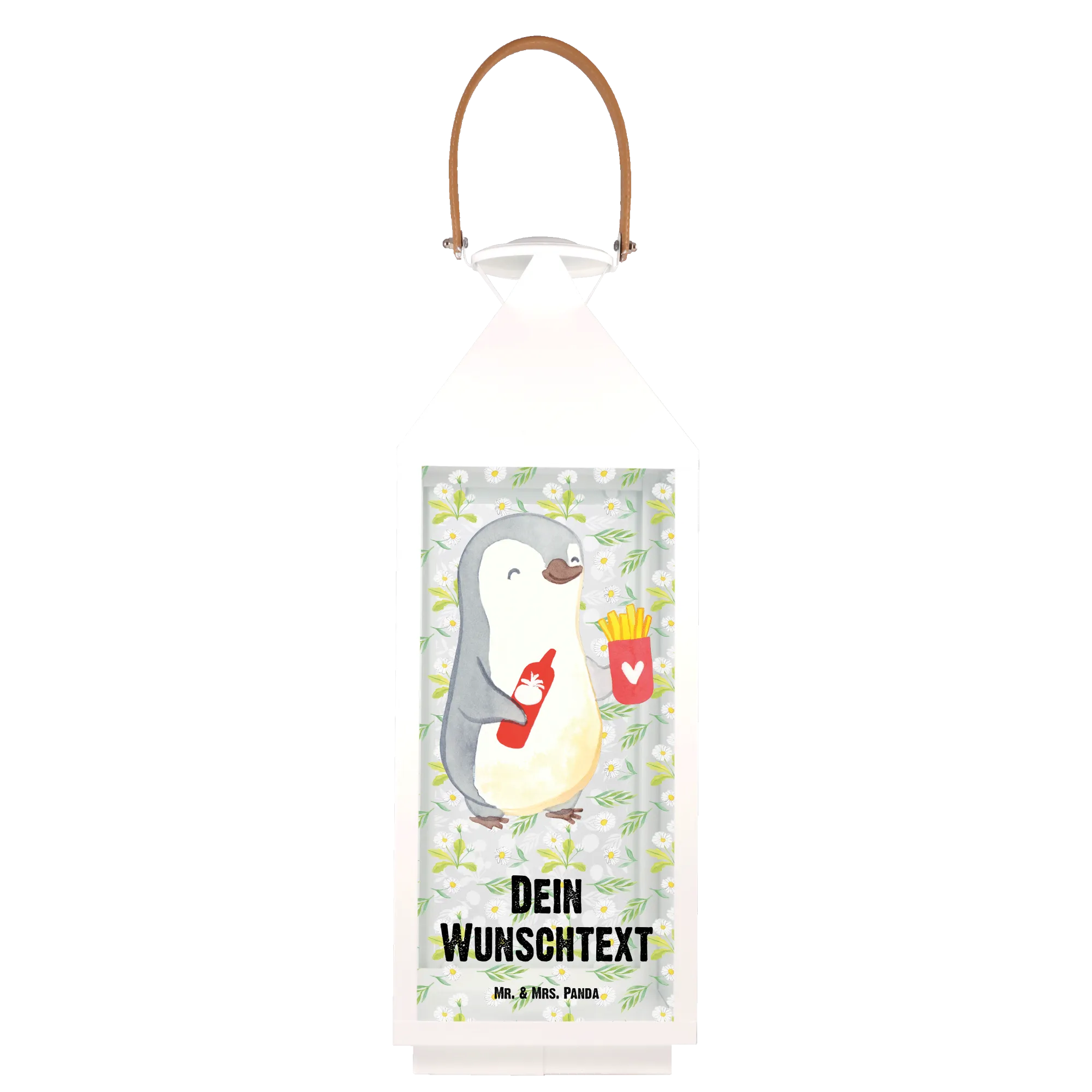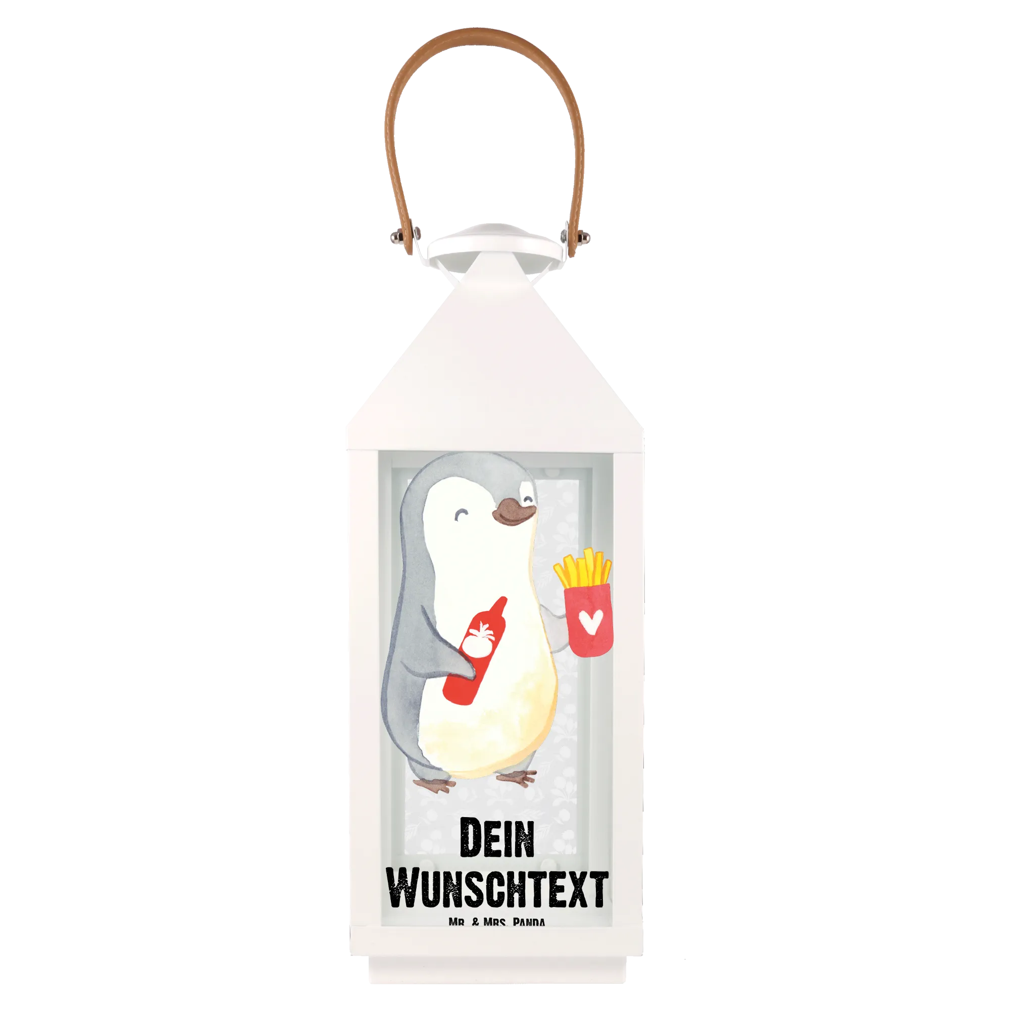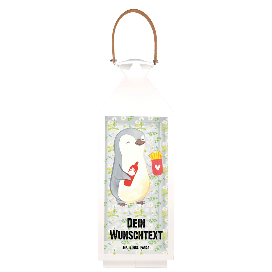 Die personalisierte Deko Laterne "Pinguin Pommes" von Mr. & Mrs. Panda ist das perfekte Geschenk für all jene, die ihren Liebsten eine besondere Freude bereiten möchten. Mit dem süßen Motiv eines fröhlich lächelnden Pinguins, der eine Portion Pommes und eine Flasche Ketchup in den Flügeln hält, sorgt diese Laterne nicht nur für eine gemütliche Atmosphäre auf der Terrasse oder dem Balkon, sondern bringt auch direkt gute Laune.