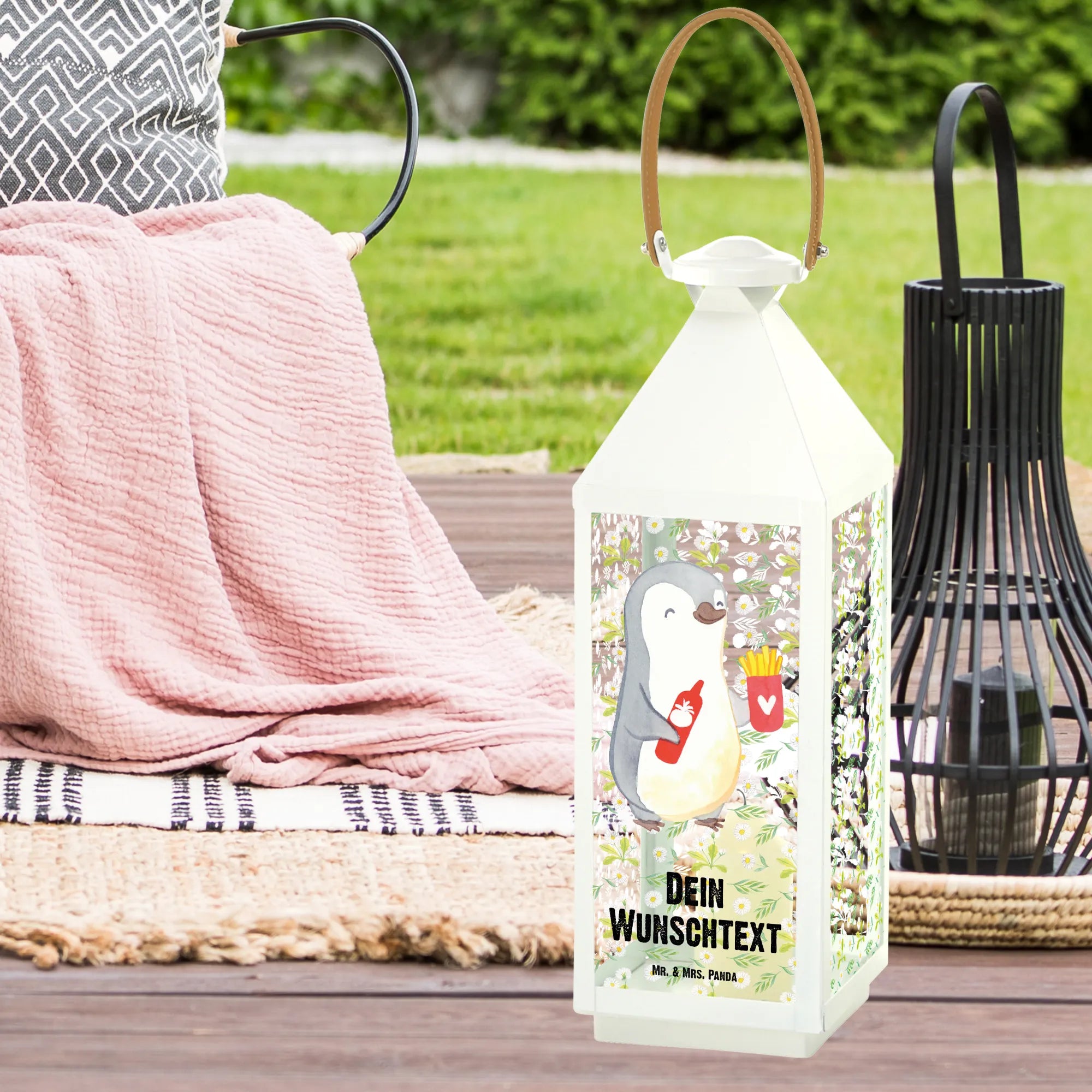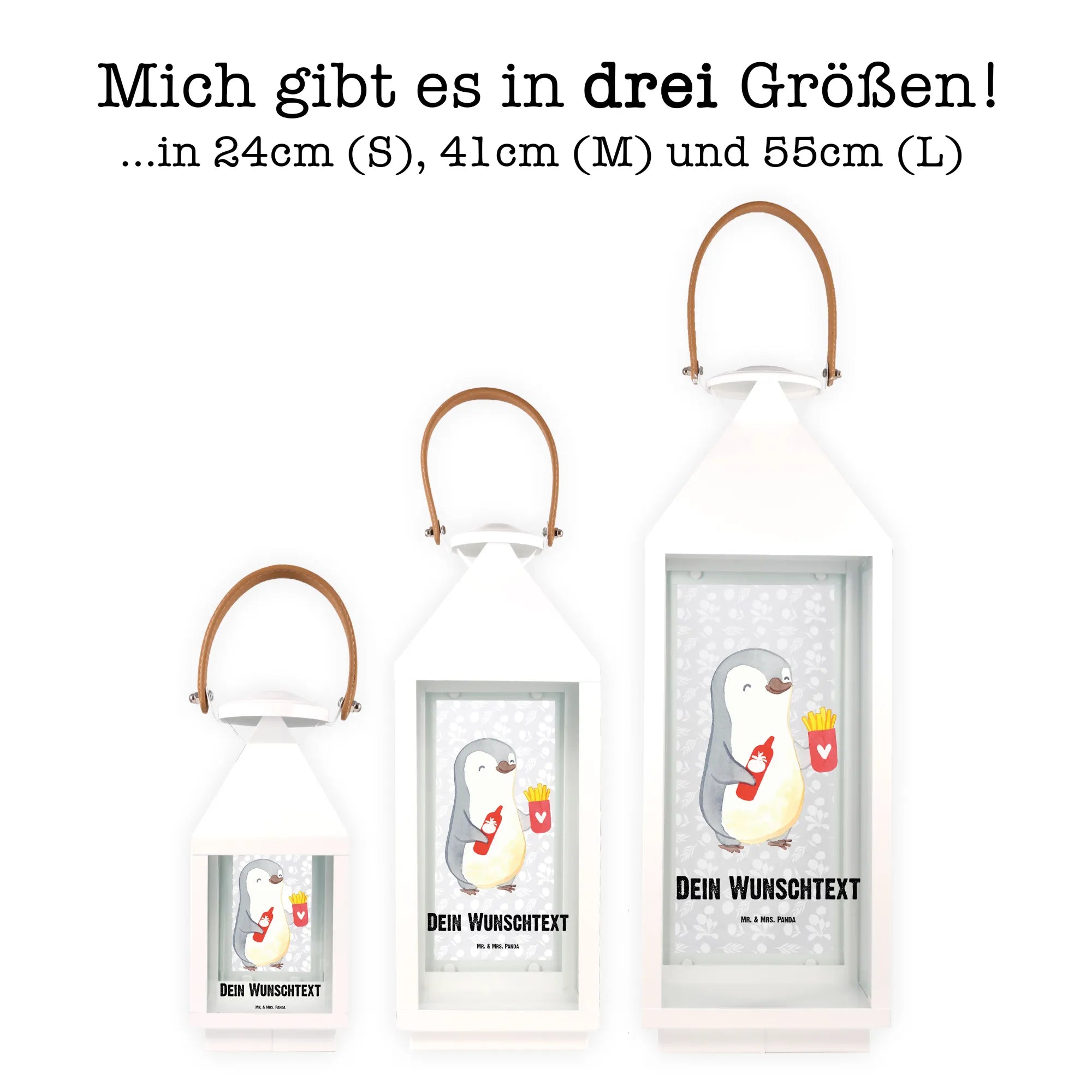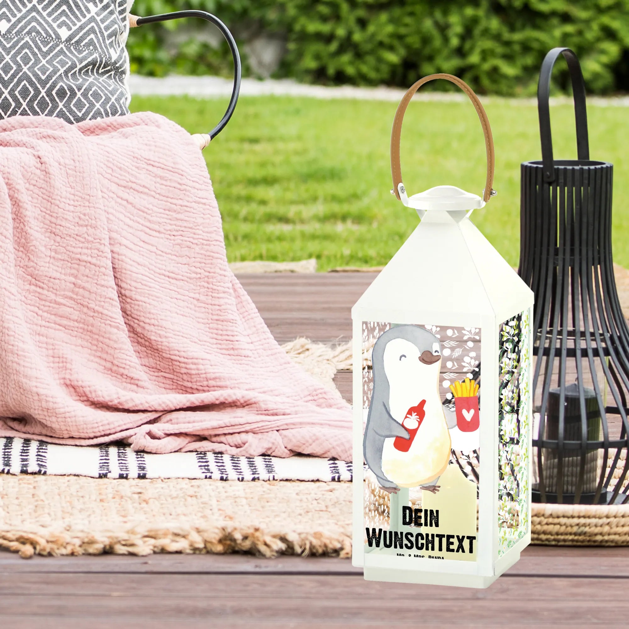 Die personalisierte Deko Laterne "Pinguin Pommes" von Mr. & Mrs. Panda ist das perfekte Geschenk für all jene, die ihren Liebsten eine besondere Freude bereiten möchten. Mit dem süßen Motiv eines fröhlich lächelnden Pinguins, der eine Portion Pommes und eine Flasche Ketchup in den Flügeln hält, sorgt diese Laterne nicht nur für eine gemütliche Atmosphäre auf der Terrasse oder dem Balkon, sondern bringt auch direkt gute Laune.