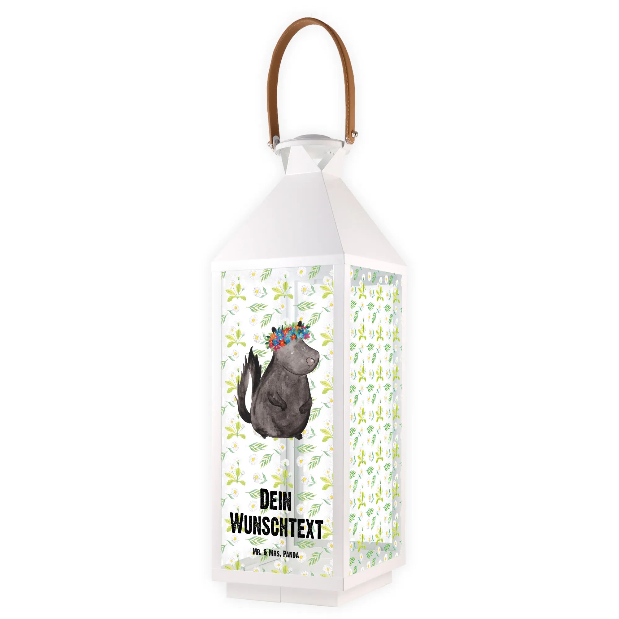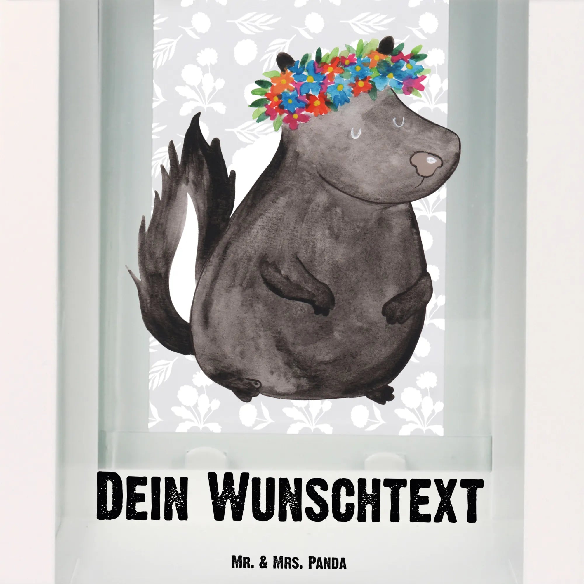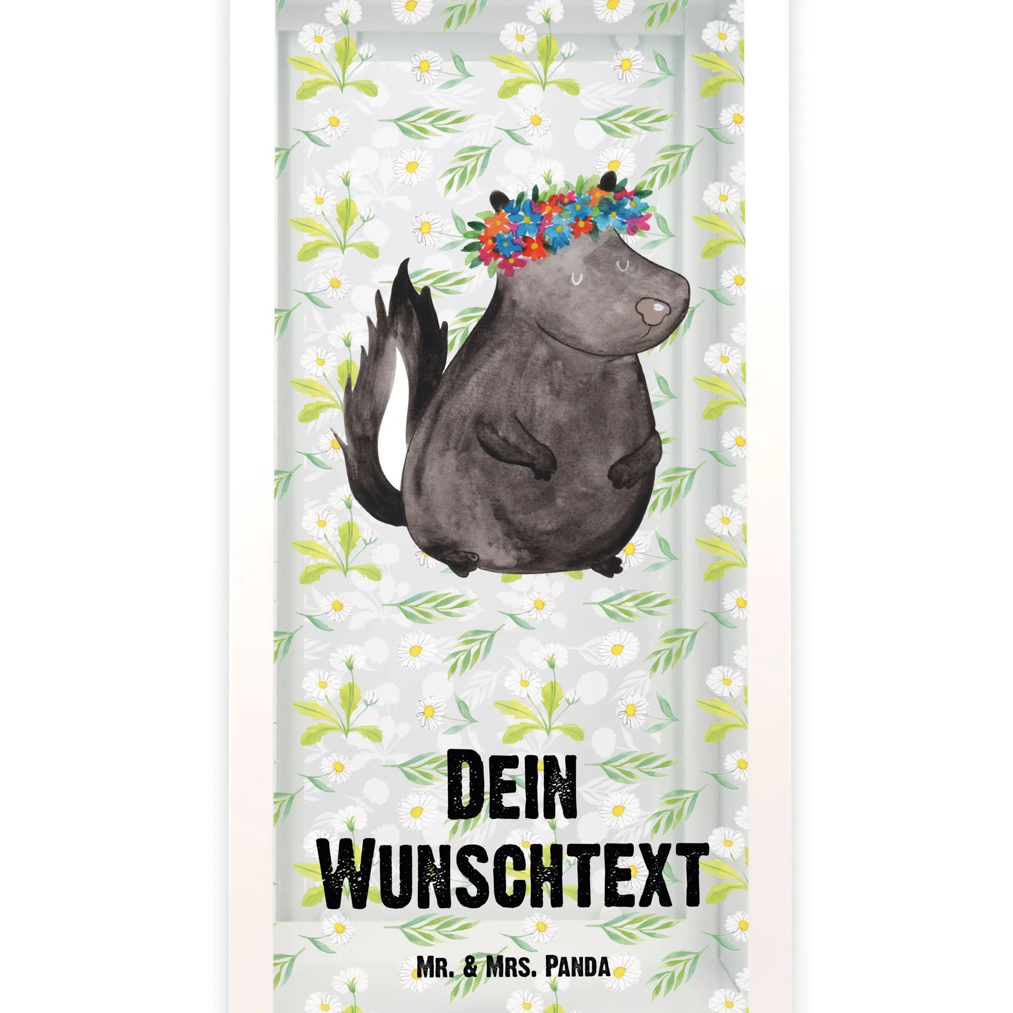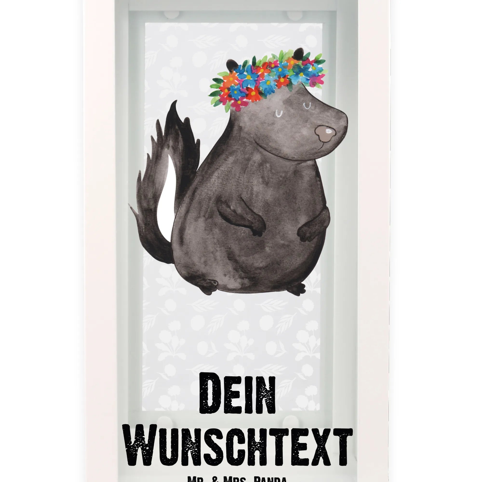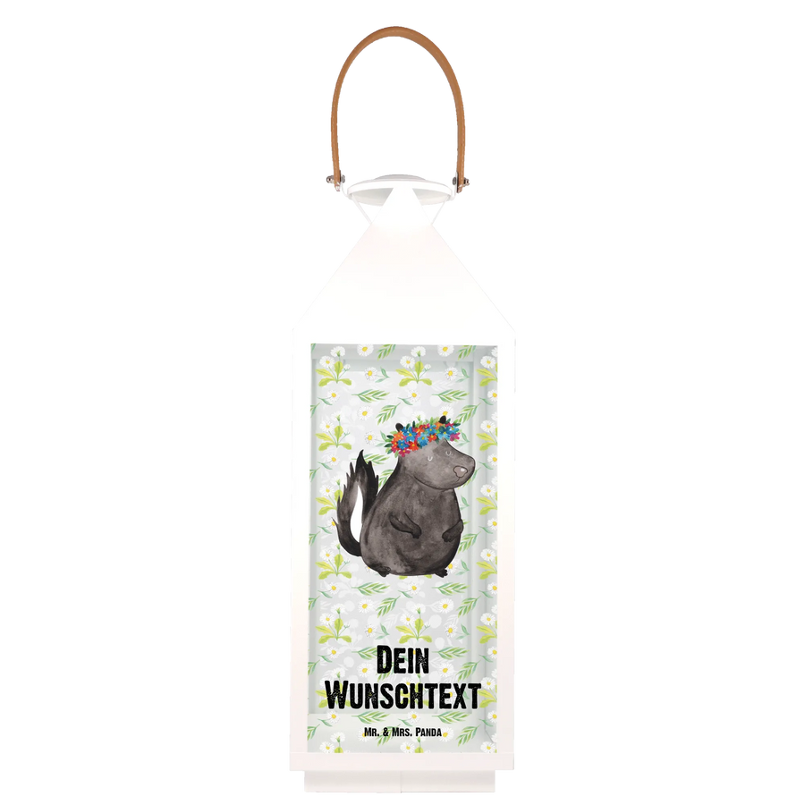 Die personalisierte Deko Laterne "Stinktier Blumenmädchen" von Mr. & Mrs. Panda ist der perfekte Begleiter für dein Zuhause. Mit ihrem entzückenden Design, das ein süßes Stinktier mit einem bunten Blumenkranz zeigt, wird sie jedem Garten, Balkon oder jeder Terrasse einen ganz besonderen Charme verleihen.