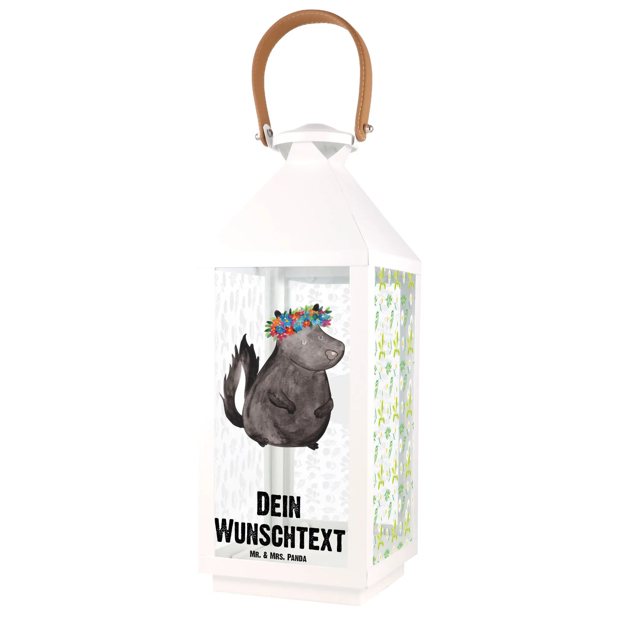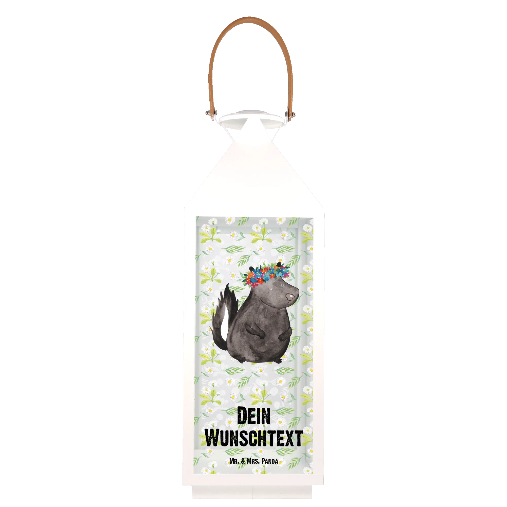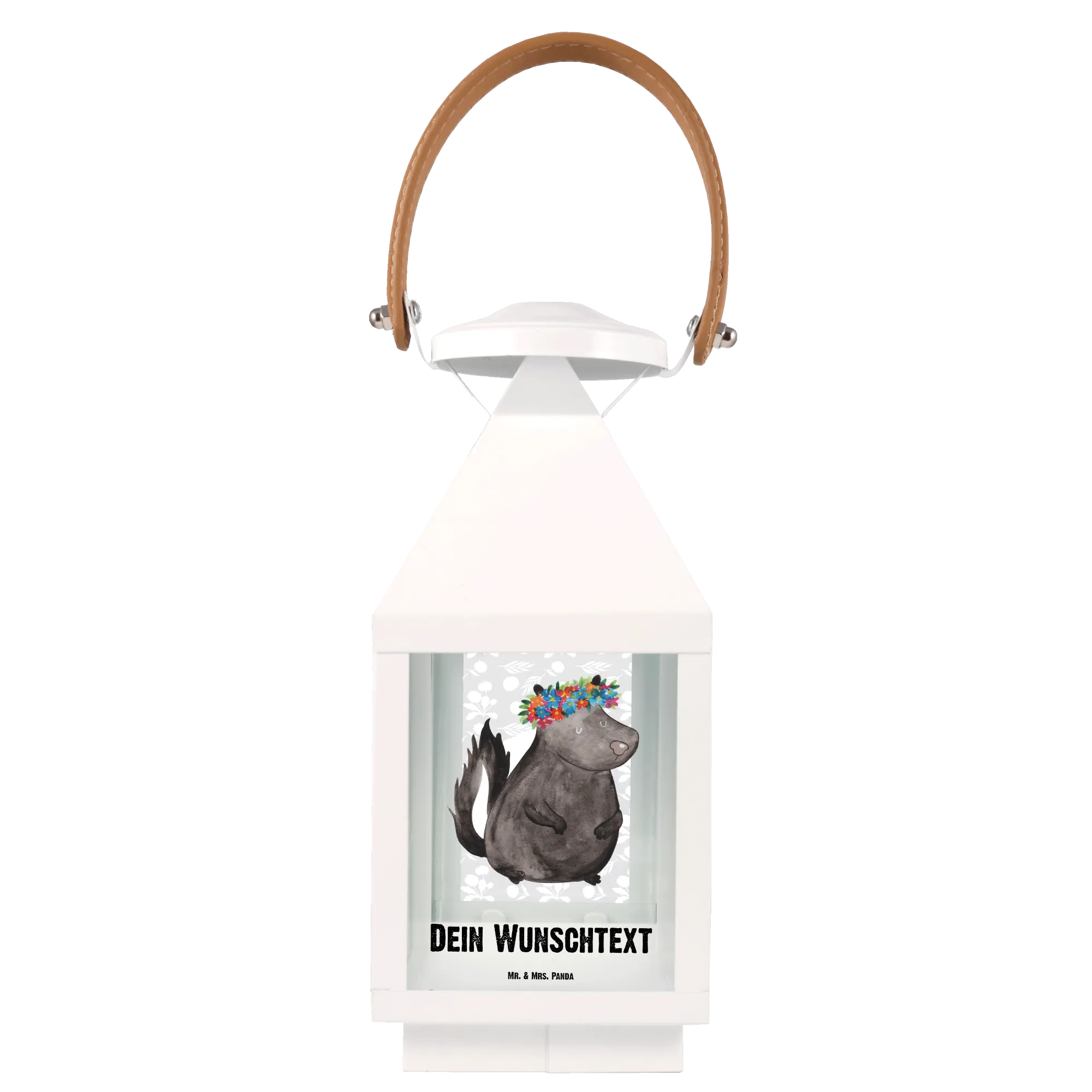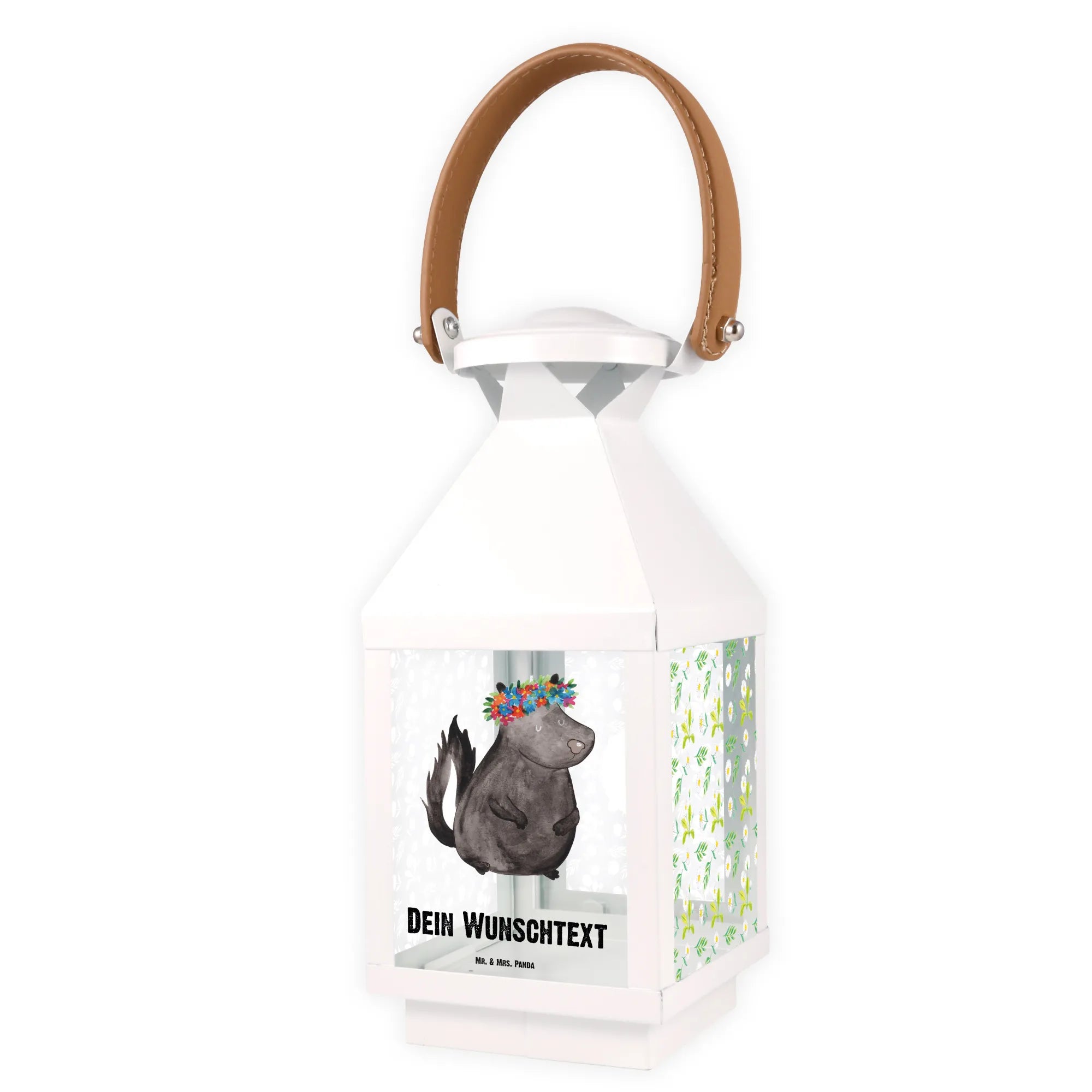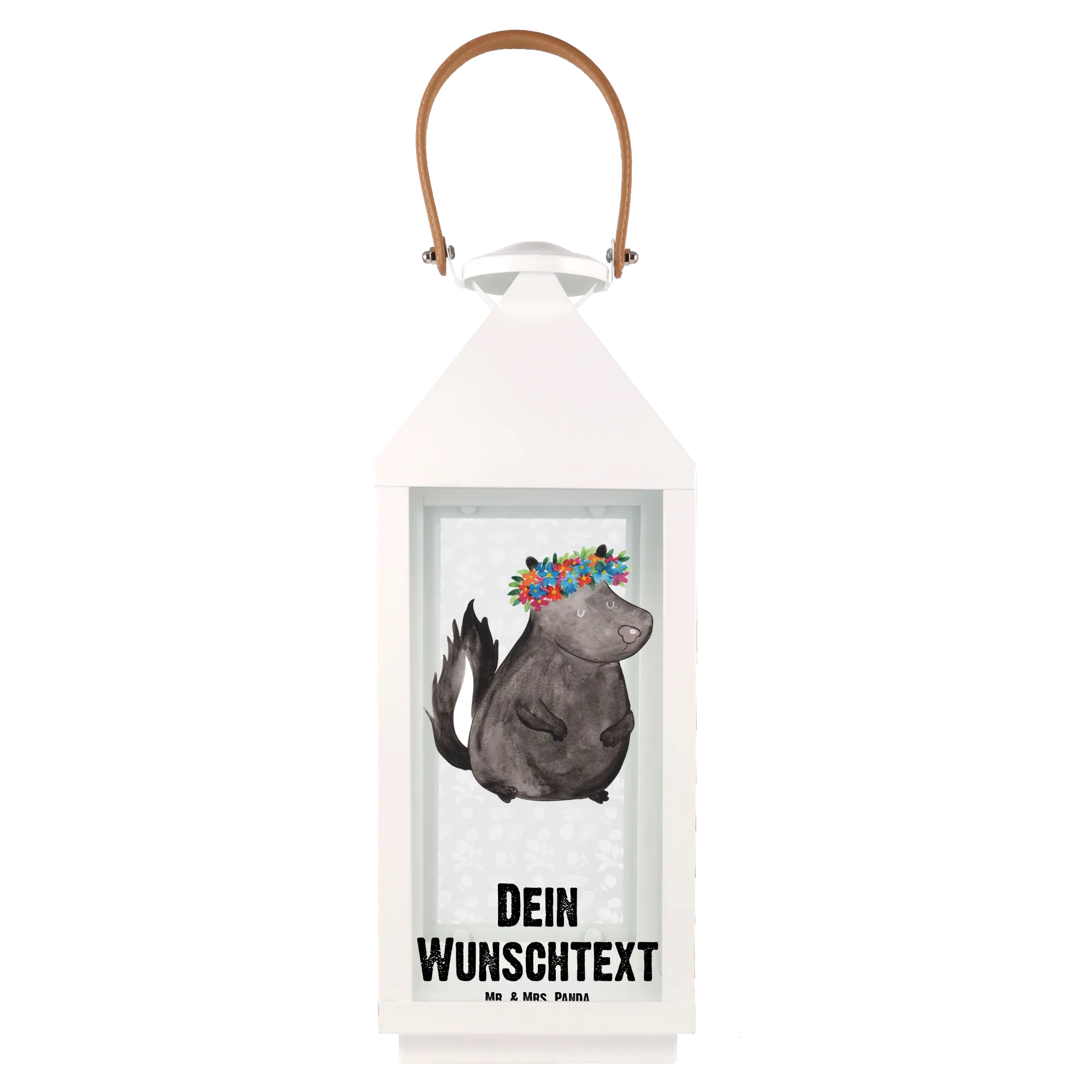 Die personalisierte Deko Laterne "Stinktier Blumenmädchen" von Mr. & Mrs. Panda ist der perfekte Begleiter für dein Zuhause. Mit ihrem entzückenden Design, das ein süßes Stinktier mit einem bunten Blumenkranz zeigt, wird sie jedem Garten, Balkon oder jeder Terrasse einen ganz besonderen Charme verleihen.