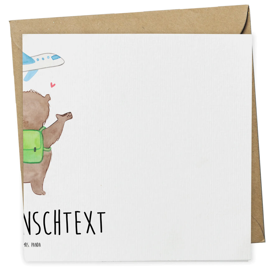 Der liebenswürdige Bär, der mit offenen Armen vor einem stilisierten Flugzeug steht, verspricht Freude und Abenteuer. Er symbolisiert den Wunsch, gemeinsam die Welt zu erkunden und die schönsten Momente miteinander zu teilen. Mit dem Slogan "Ich möchte mit dir die Welt bereisen, weil ich mit dir an meiner Seite noch so viel mehr erleben will" ist diese Karte nicht nur ein Ausdruck von Zuneigung, sondern auch eine Erinnerung an all die unvergesslichen Erlebnisse, die noch vor Euch liegen.