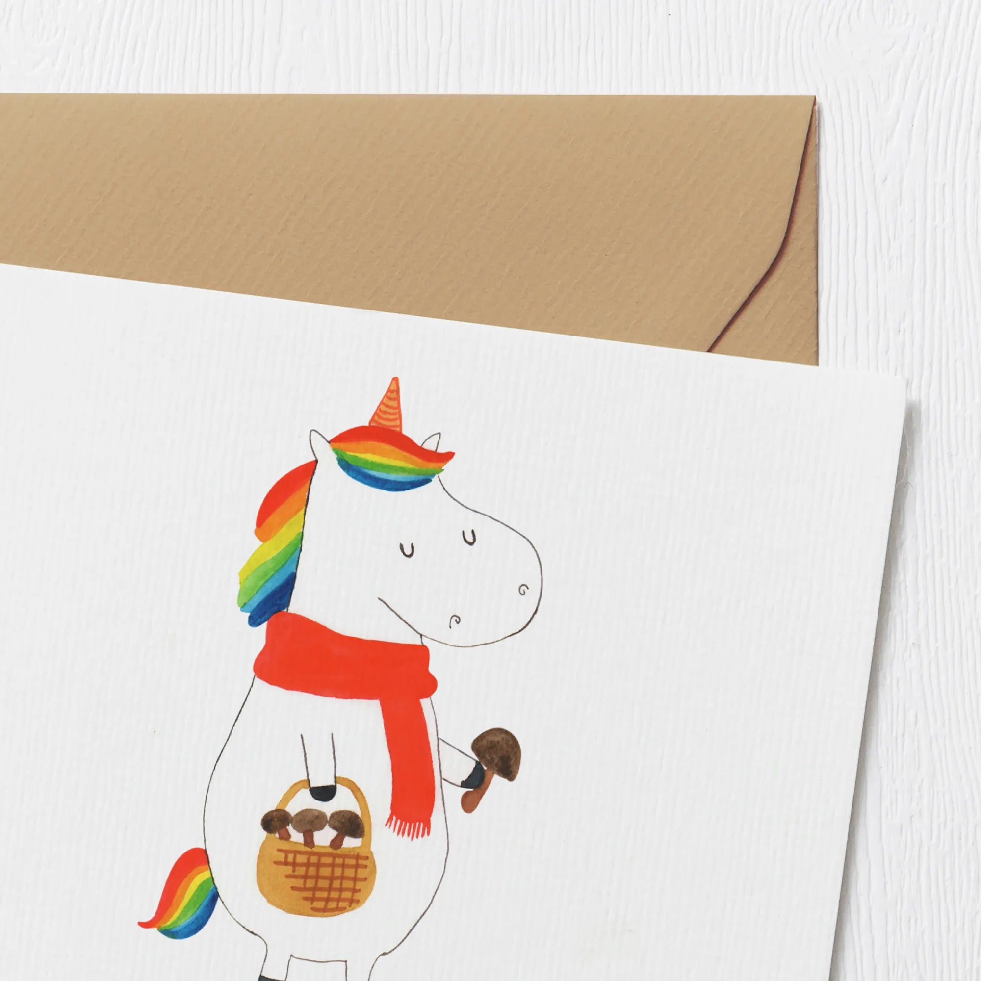 Die Karte hat eine Größe von 140 mm x 140 mm und besteht aus hochwertigem 300 Gramm Karton, der mattschwarz glänzend veredelt ist. Damit wirkt die Karte besonders edel und ansprechend. Auf der Vorderseite der Karte findest du ein niedliches Motiv, das ein süßes Einhorn zeigt, das begeistert im Wald Pilze sucht. Der liebevolle Spruch 'Wenn das Leben dir einen Korb gibt, geh Pilze sammeln.' sorgt dafür, dass deine Botschaft mit einem Hauch von Humor und Motivation übermittelt wird.
