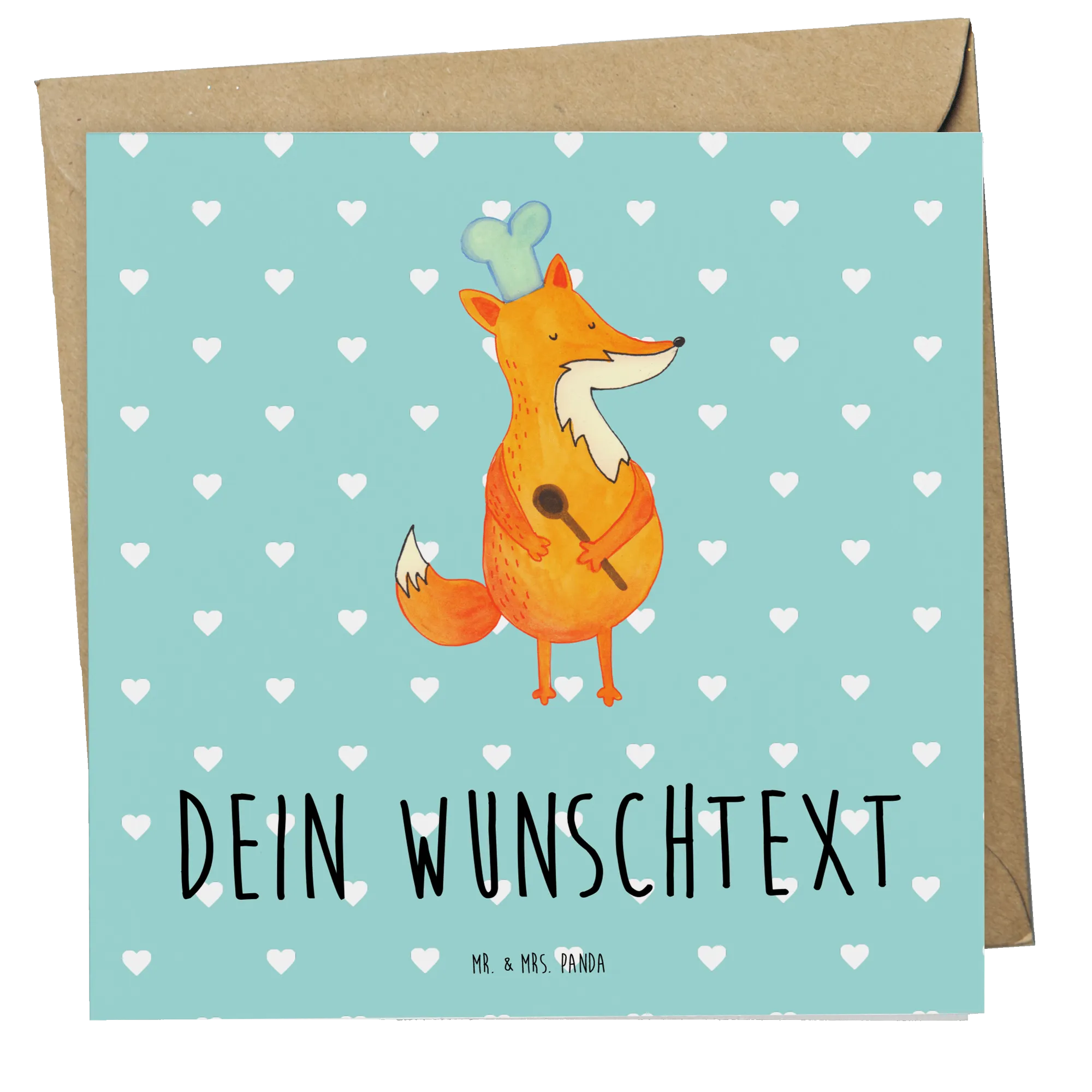 Entdecke die perfekte personalisierte Deluxe Karte mit dem zauberhaften Motiv "Fuchs Koch" von Mr. & Mrs. Panda! Diese hochwertig gestaltete quadratische Karte mit den Maßen 140 mm x 140 mm vereint Charm und Eleganz.