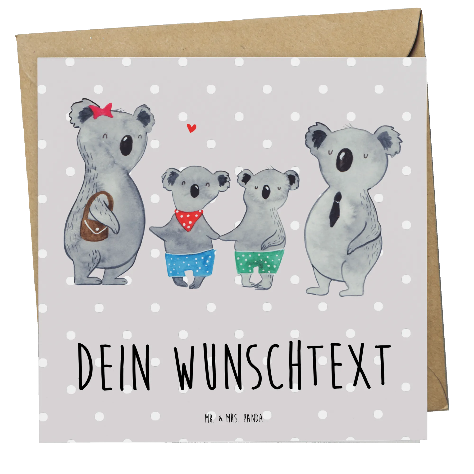 Die Koala-Motive, die eine Mutter, einen Vater und zwei Kinder darstellen, symbolisieren familiäre Verbundenheit und bieten Platz für persönliche Nachrichten. Mit einem Wunschtext oder Namen versehen, wird die Karte zu einem ganz persönlichen Geschenk, das von Herzen kommt.