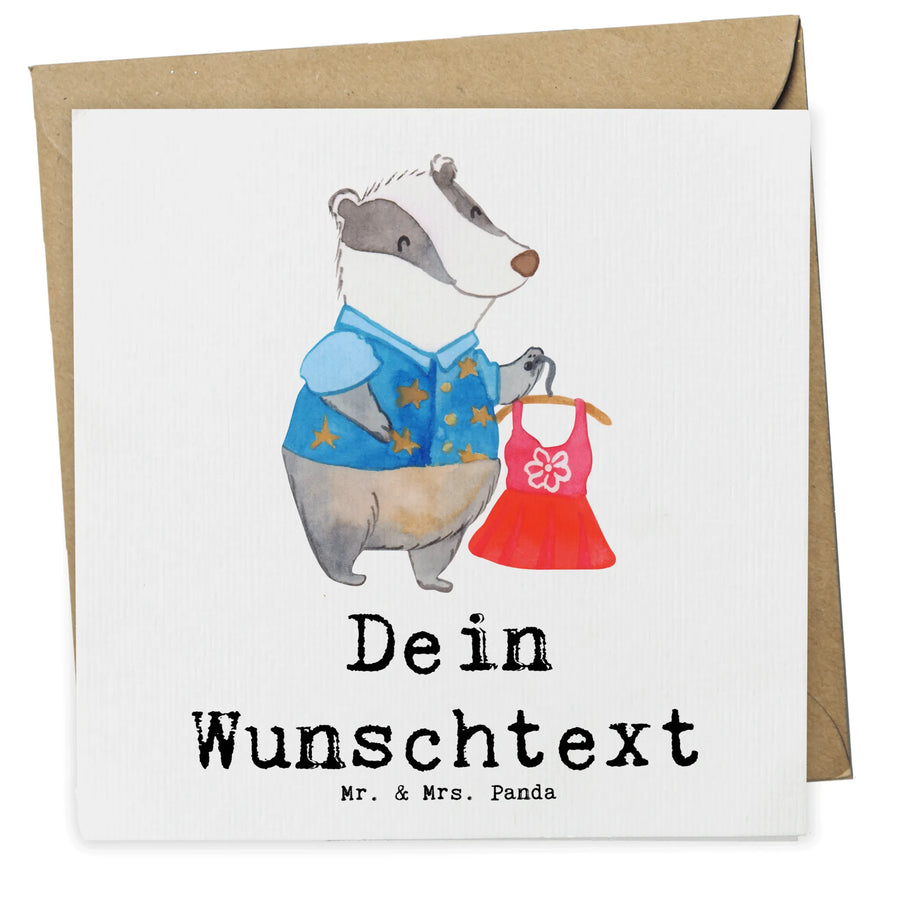 Mit einem liebevoll gestalteten Dachs in einem schickem Outfit spricht sie ganz besonders Modeschöpferinnen und Fashion Designerinnen an. Du kannst den Text ganz individuell gestalten und deinen eigenen Wunschnamen oder Wunschtext hinzufügen. So wird jede Karte zu einem einmaligen Unikat, das in Erinnerung bleibt.