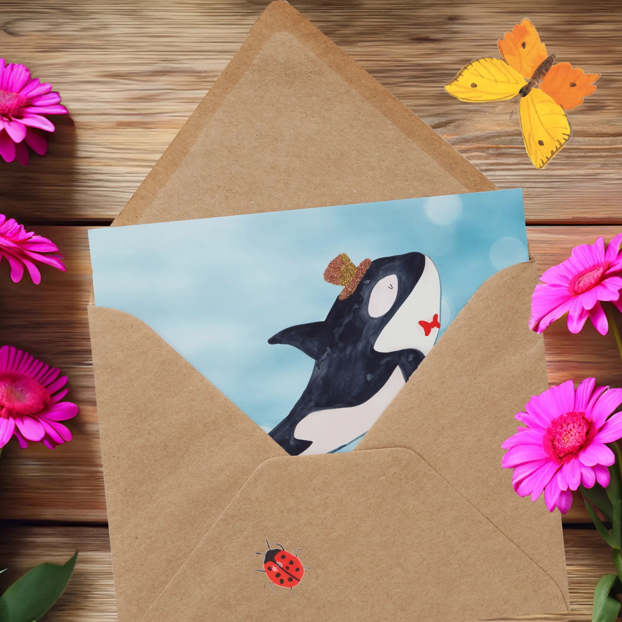 Der freundliche Orca, der einen Zylinder trägt, bringt Freude und ein Lächeln auf jedes Gesicht. Warum diese Karte das perfekte Geschenk für dich und deine Lieben ist? Weil sie personalisierbar ist! Du kannst sie mit deinem Wunschnamen oder einem individuellen Text gestalten, perfekt geeignet für alle Anlässe, wie Geburtstage, Hochzeiten, Jubiläen oder einfach so, um jemandem eine Freude zu machen.