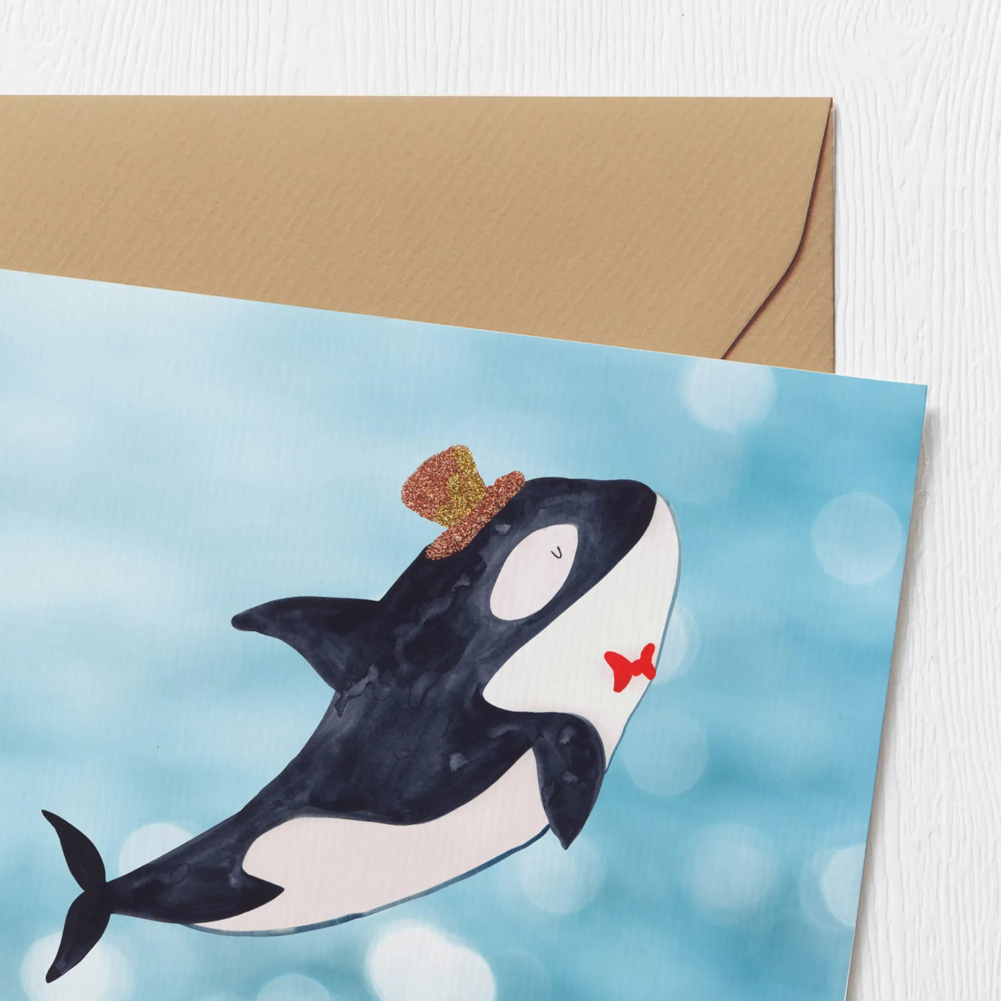 Die Karte hat die Maße von 140 mm x 140 mm und ist aus hochwertigem 300 g/m² Karton gefertigt, was ihr eine edle und stabile Optik verleiht. Auf der Vorderseite strahlt ein freundlicher Orca im Aquarell-Stil, geschmückt mit einem eleganten Zylinder und begleitet von einem kleinen roten Fisch. Diese niedlichen Details bringen jeden zum Schmunzeln!