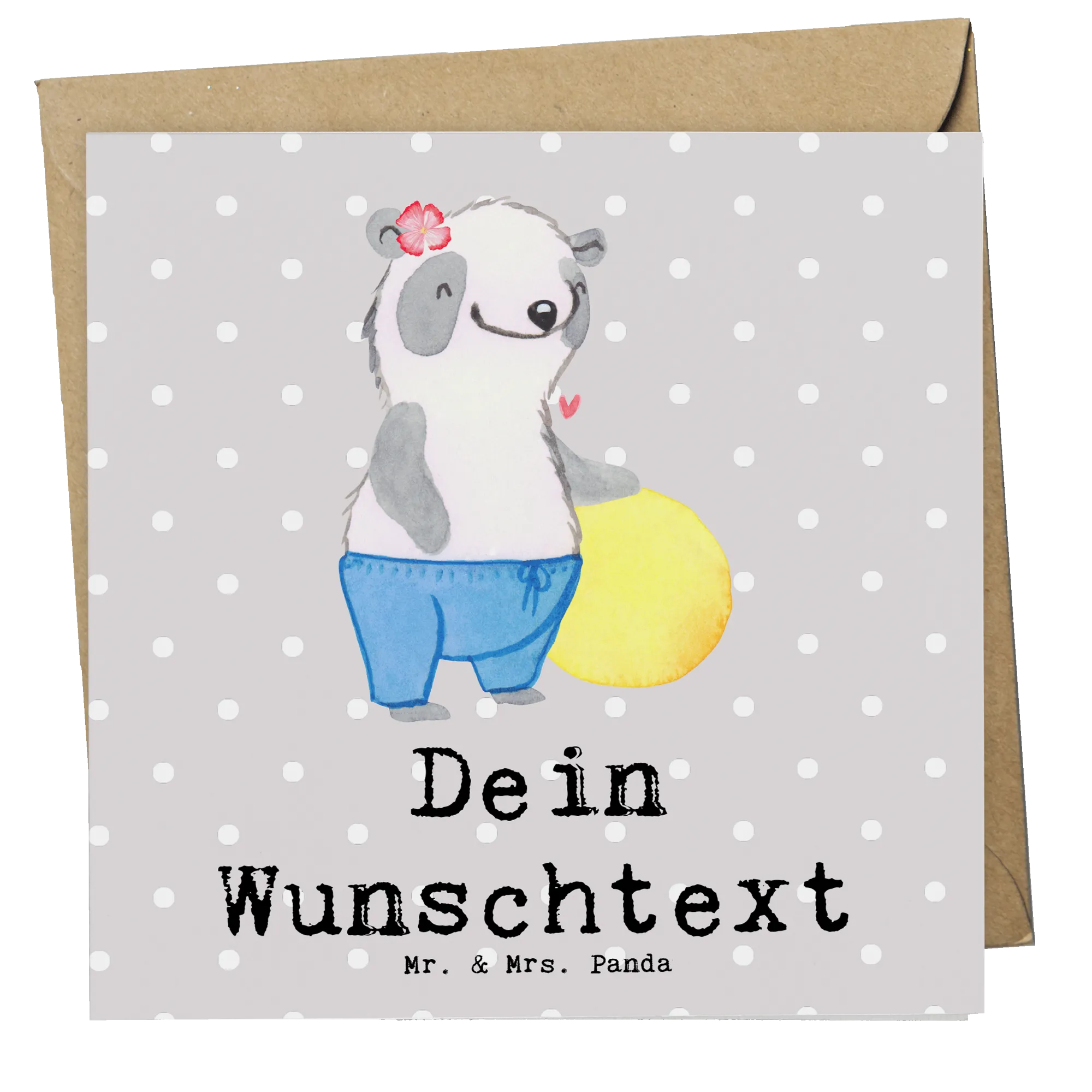 Jedes Detail dieser Karte strahlt Qualität und Stil aus. Mit ihren großzügigen Maßen von 140 mm x 140 mm und dem hochwertigen Karton, der 300 Gramm wiegt, ist sie nicht nur ein Augenschmaus, sondern auch ein echtes Schmuckstück. Die Vorderseite ziert ein niedlicher, handgezeichneter Panda in Jogginghose, der einen Gymnastikball hält. Dazu der fröhliche Spruch: "Du bist nur ein halber Mensch, wenn du keine Physiotherapeutin bist."