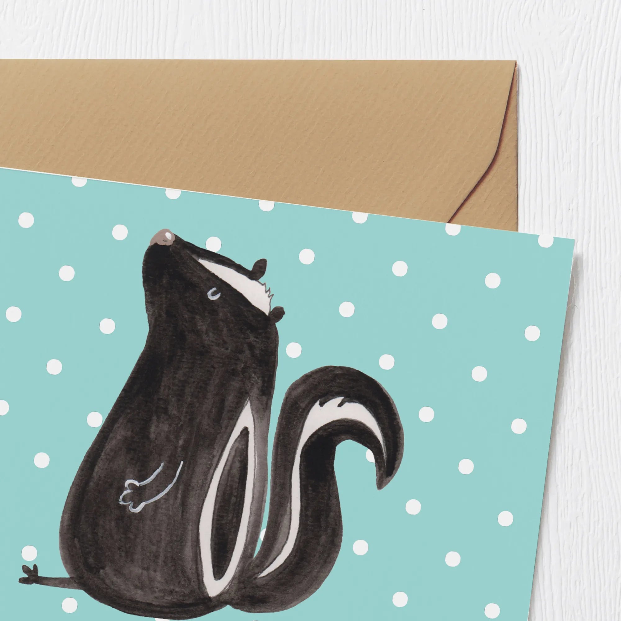 Die Stinktier-Kollektion von Mr. & Mrs. Panda, die dem treuen Haustier Herrn Blume gewidmet ist, bringt etwas ganz Besonderes mit sich. Jeder, der die warmherzige Hinterstory hinter den Motiven kennt, wird mehr Freude daran haben, diese Karte zu senden oder zu erhalten. Sie ist nicht nur ein Stück Papier, sondern trägt Emotionen und liebevolle Gedanken in sich.