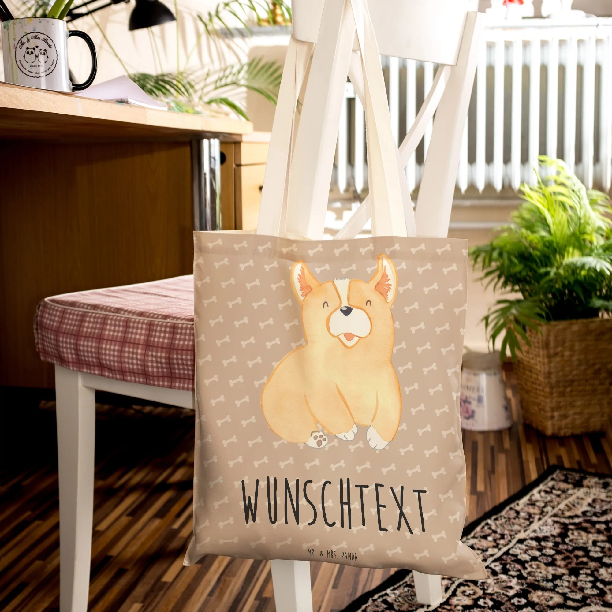 Entdecke die wunderschöne personalisierte Einkaufstasche mit dem süßen Corgie-Motiv aus der Hunde Kollektion von Mr. & Mrs. Panda!