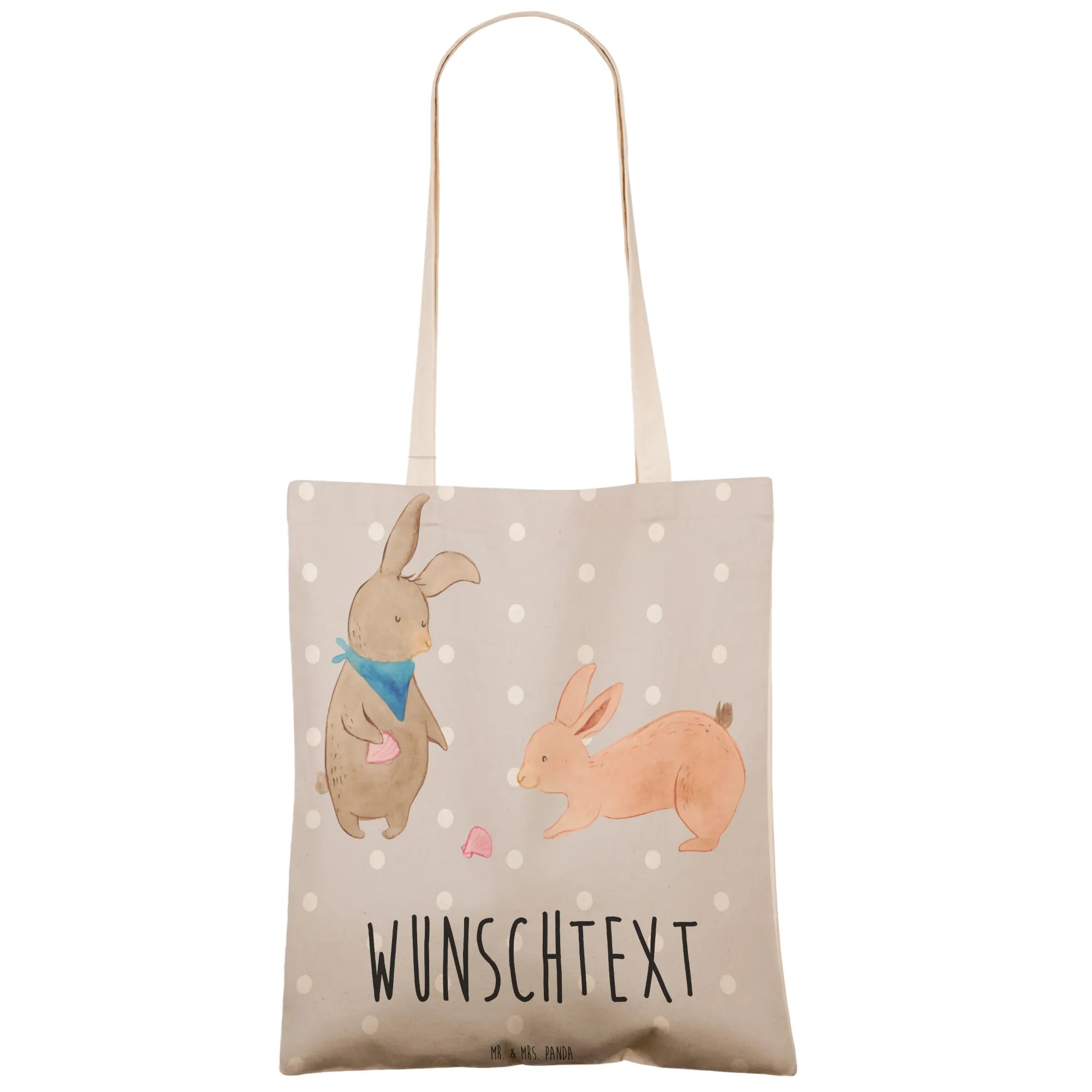 Der linke Hase trägt ein hübsches blaues Halstuch, während der rechte Hase neugierig nach der Muschel greift. Die sanften, warmen Farben der Tasche bringen eine freundliche und harmonische Stimmung in jeden Alltag.