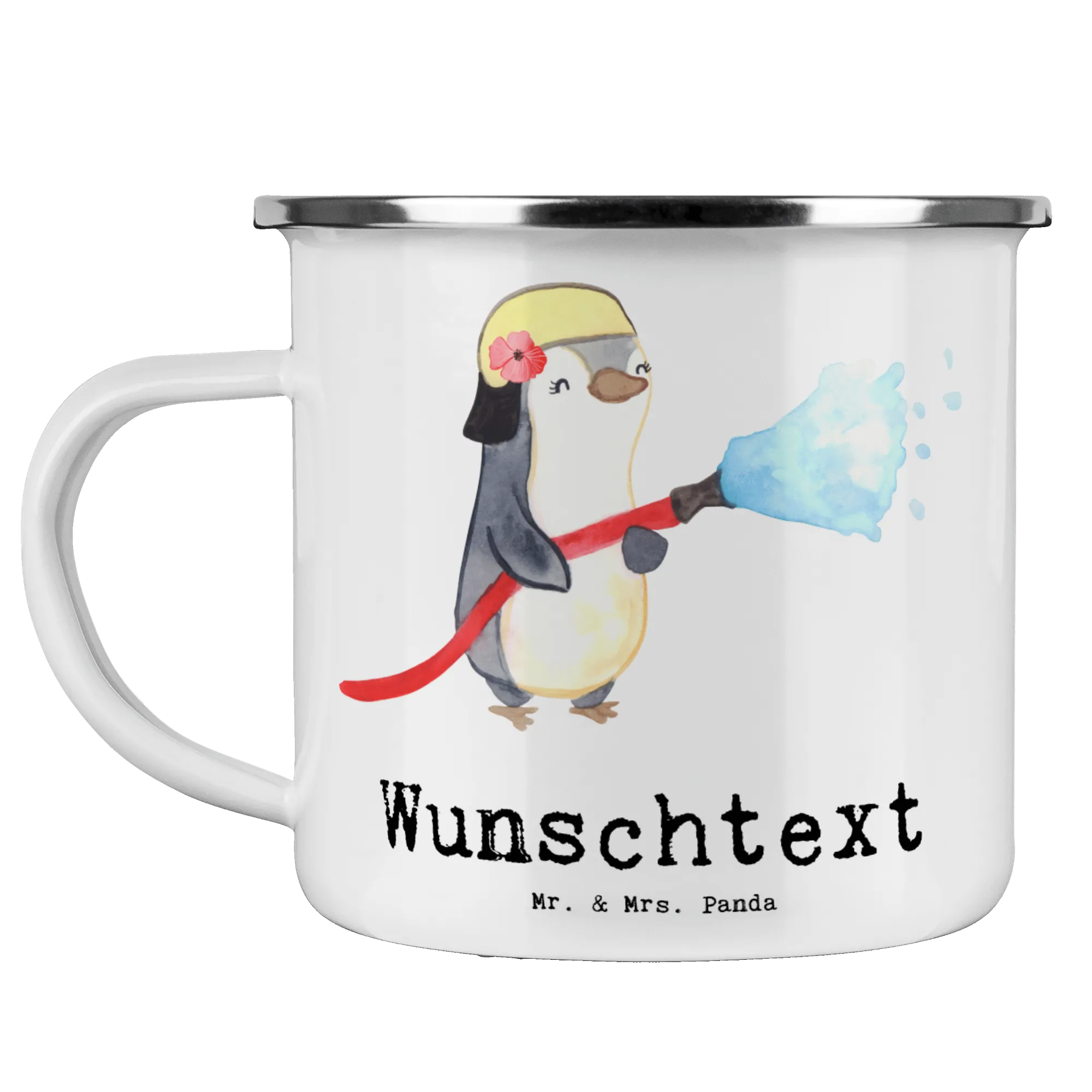 Liebevolles Geschenk für Feuerwehrfrauen 🧡 Unsere personalisierte Emaille Tasse „Feuerwehrfrau mit Herz“ von Mr. & Mrs. Panda ist ein kleines Dankeschön mit großer Wirkung. Der süße Pinguin in Feuerwehruniform, kombiniert mit dem frechen Spruch „Du bist nur ein halber Mensch, wenn du keine Feuerwehrfrau bist.“, macht diese Tasse zu einem besonderen Erinnerungsstück.