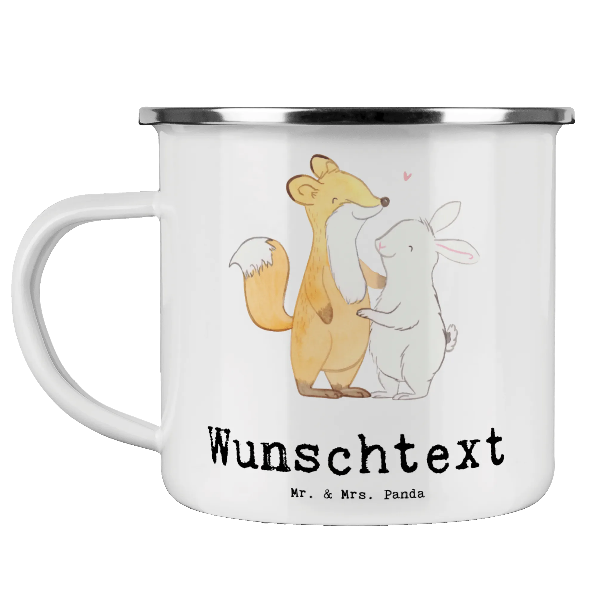 Die personalisierte Emaille Tasse Fuchs Hase Freunde treffen Tage von Mr. & Mrs. Panda ist das perfekte Geschenk für alle, die gerne Zeit mit ihren Freunden verbringen! Diese wunderschöne und beständige Camping-Tasse ist nicht nur praktisch für heiße und kalte Getränke, sondern bringt auch einen Hauch von Freude in den Alltag.