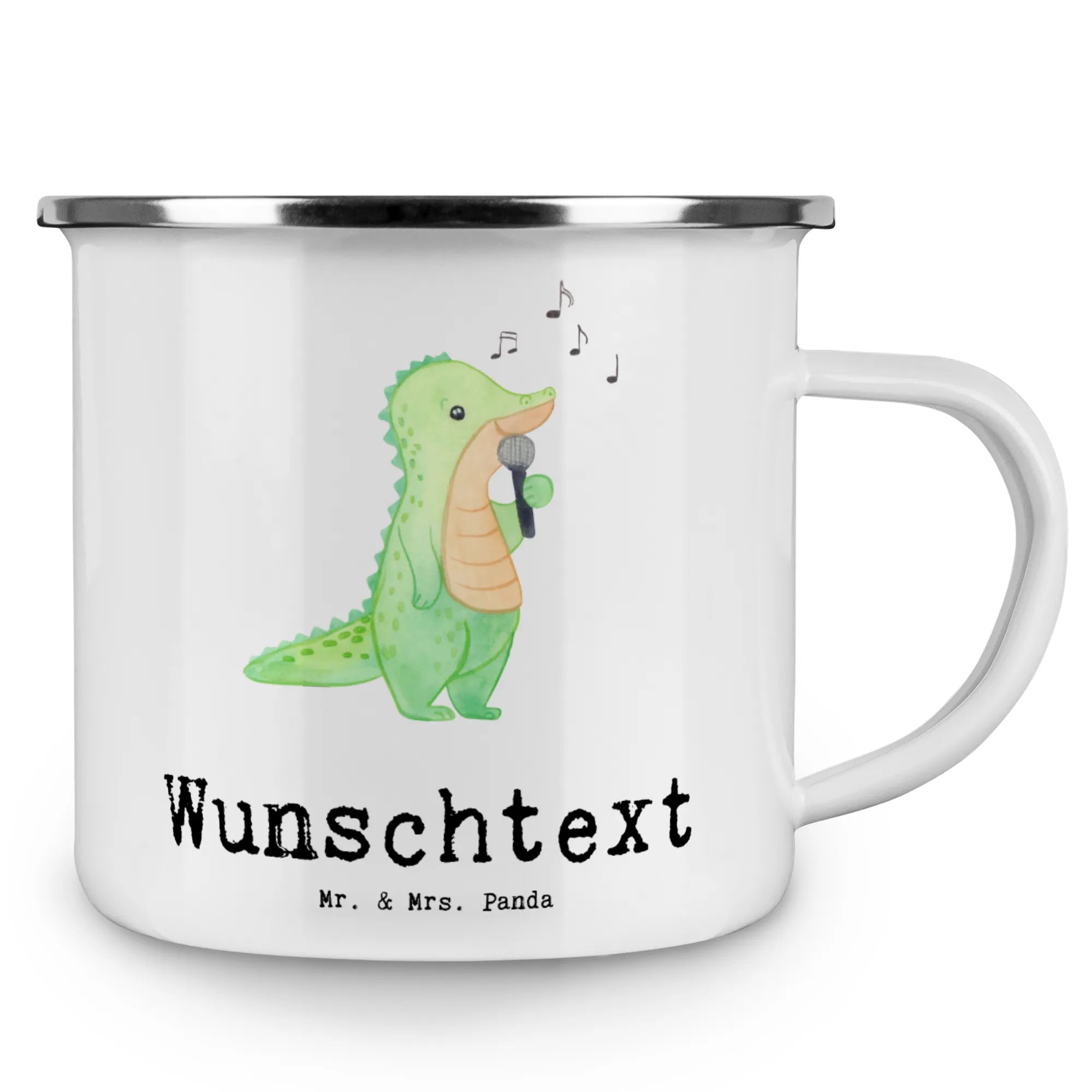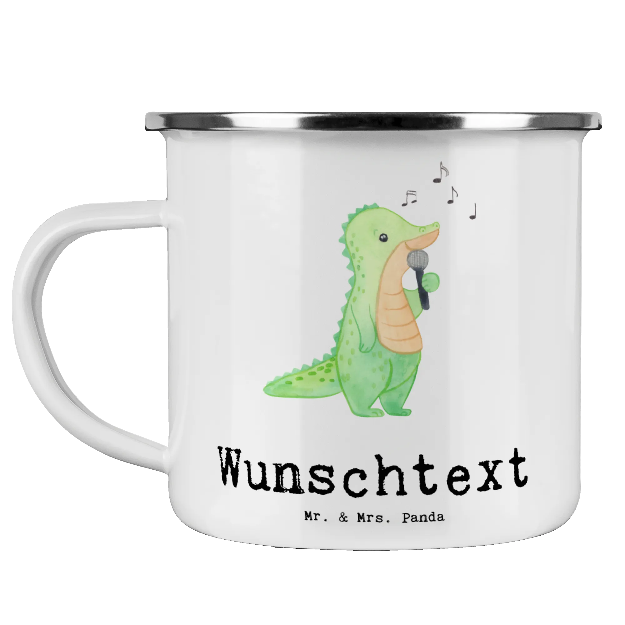 Du bist auf der Suche nach dem perfekten Geschenk für einen Hobby- oder Sportsänger? Dann ist die personalisierte Emaille Tasse mit dem süßen Motiv "Krokodil Singen Tage" von Mr. & Mrs. Panda genau das, was du brauchst!
