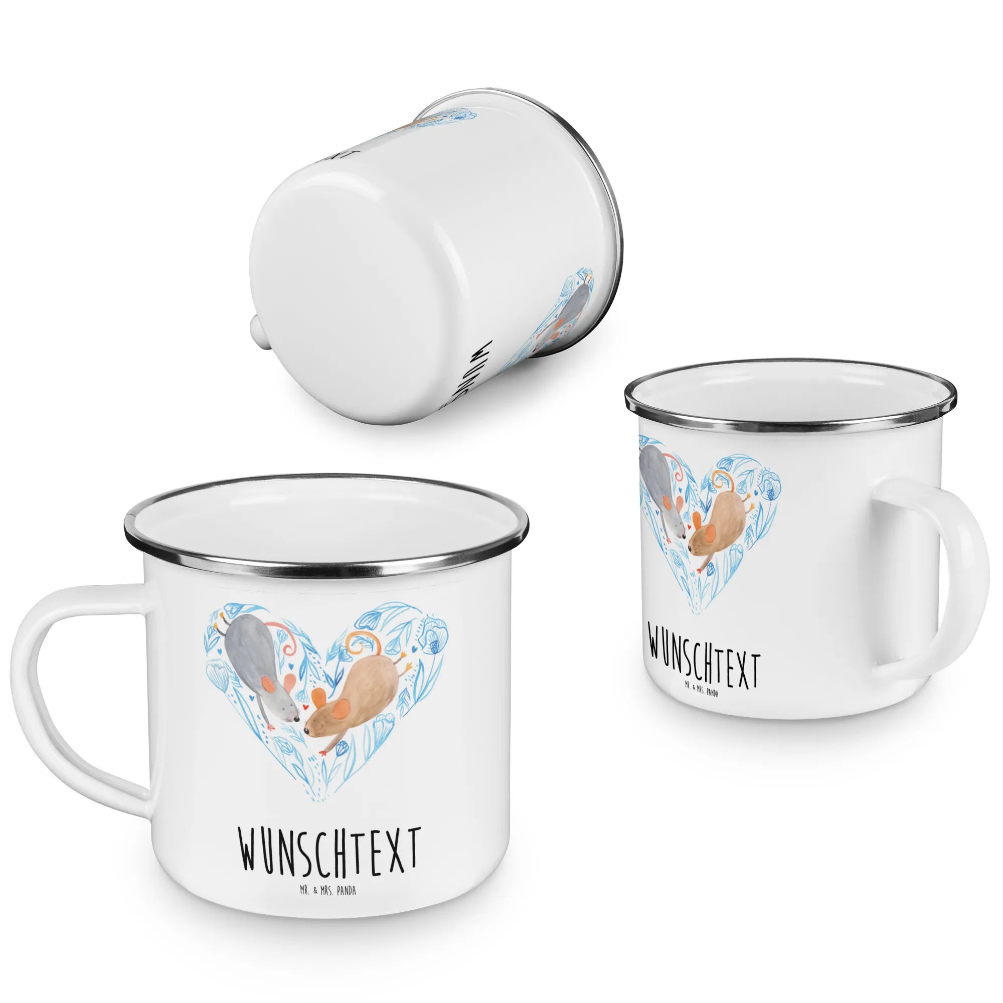 Entdecke die personalisierte Emaille Tasse „Mäuse Herz“ von Mr. & Mrs. Panda – das perfekte Geschenk für alle Verliebten! Diese wunderschöne Tasse mit dem niedlichen Design von zwei Mäusen, die ein Herz formen, bringt nicht nur Freude, sondern auch eine liebevolle Botschaft mit sich: "Wir zwei gegen den Rest der Welt."