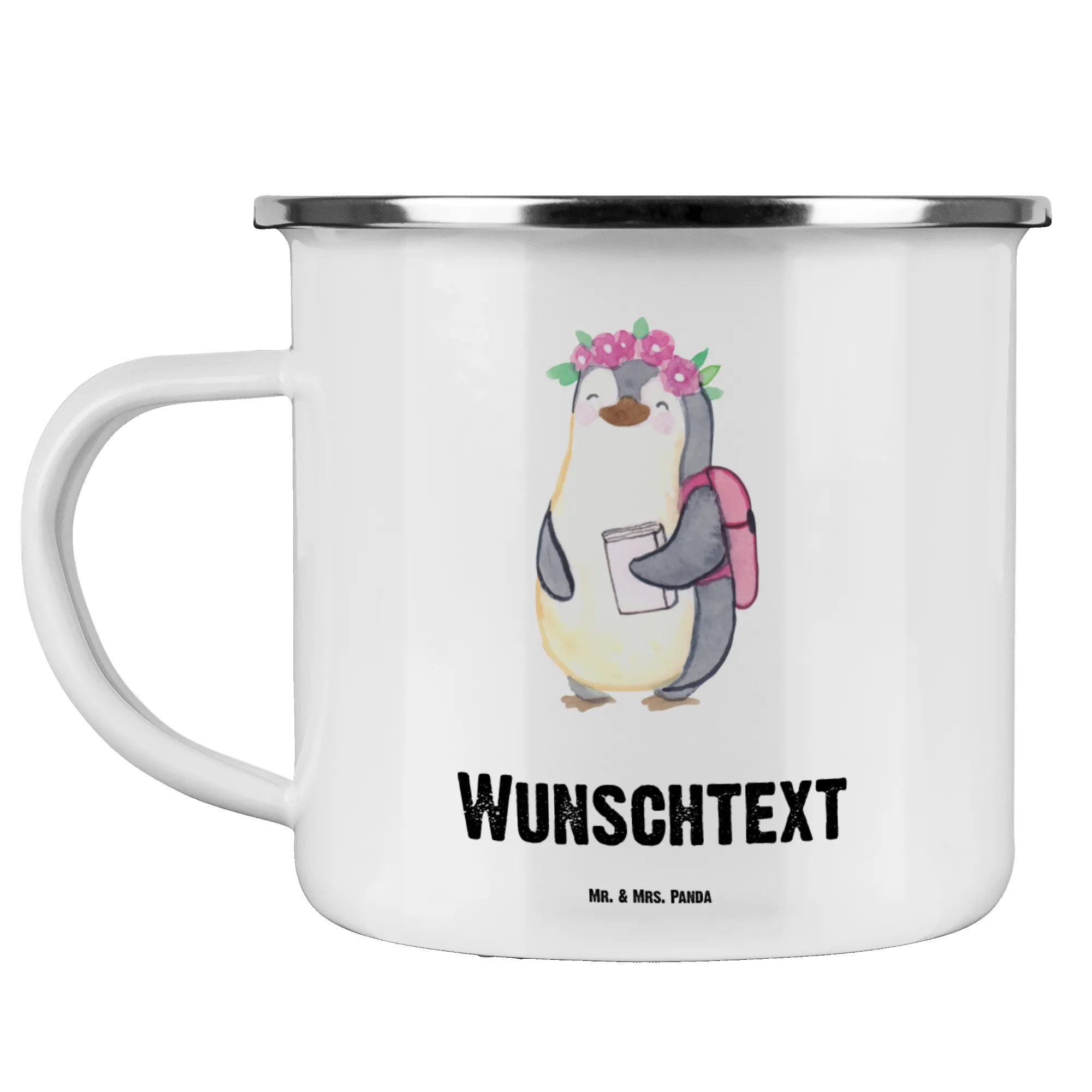 Hergestellt aus hochwertiger, kratzfester Emaille, ist sie sowohl praktisch als auch langlebig. Ein niedlicher Pinguin mit einer Blume auf dem Kopf, einem Rucksack auf dem Rücken und einem Buch in der Hand wird auf der Tasse abgebildet und bringt ein Lächeln in jeden Tag.
