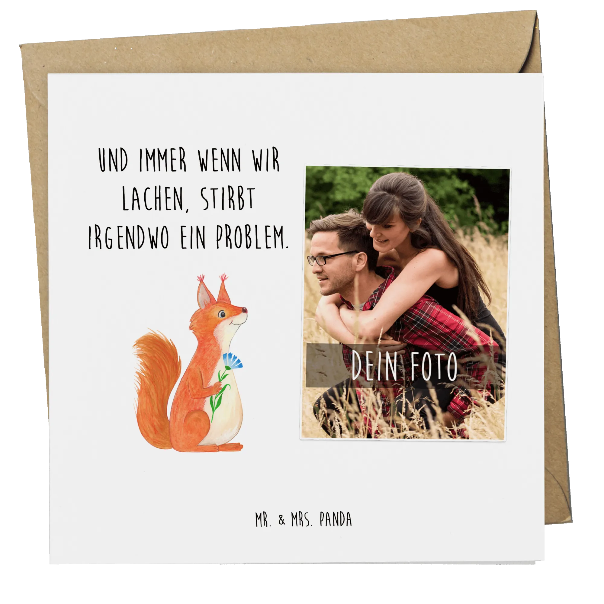 Verschenke Freude mit der Personalisierte Foto Deluxe Karte von Mr. & Mrs. Panda. Diese quadratische Karte in der Größe 140 mm x 140 mm ist auf hochwertigem Karton gedruckt und bietet eine matte Oberfläche zum individuellen Beschriften. Dein persönliches Foto, in brillanter Auflösung, zusammen mit einem einzigartigen Spruch sorgt für bleibende Erinnerungen. Der Umschlag in edler Kartonoptik ist das i-Tüpfelchen. Geeignet für besondere Momente wie Geburtstage oder Hochzeitsfeiern.